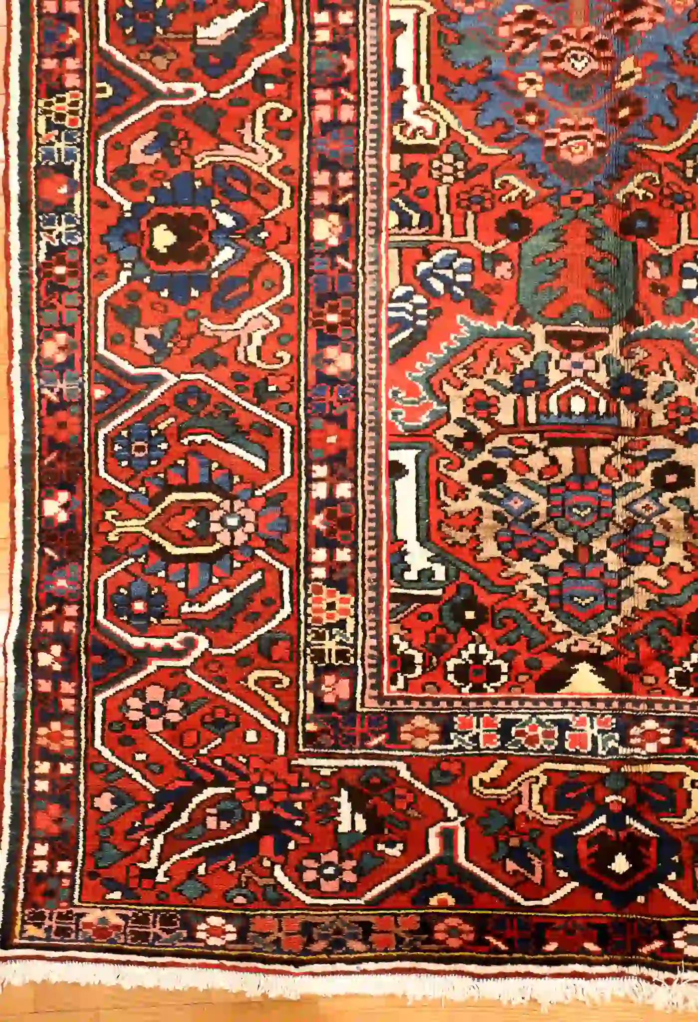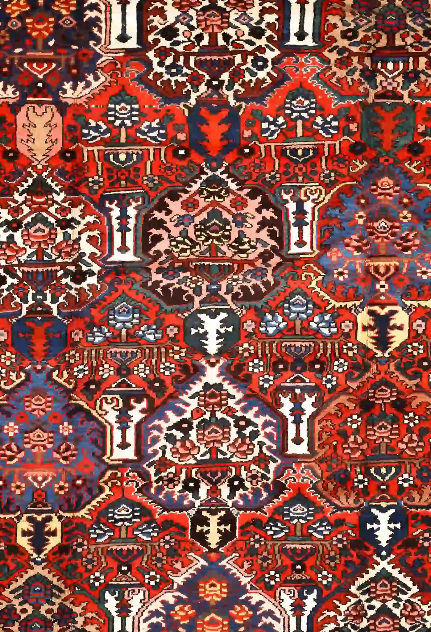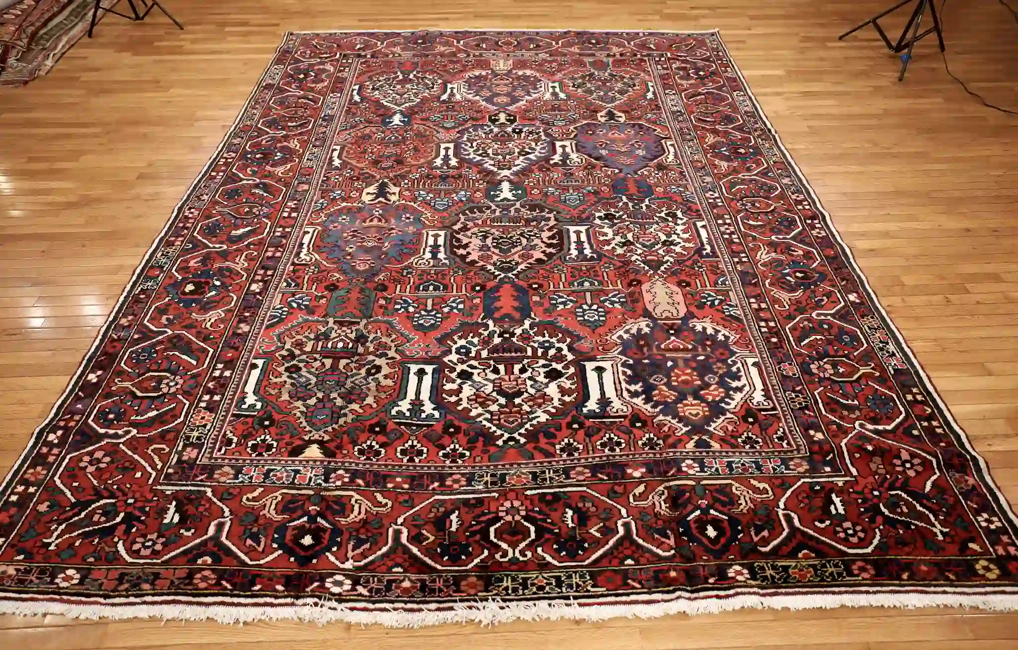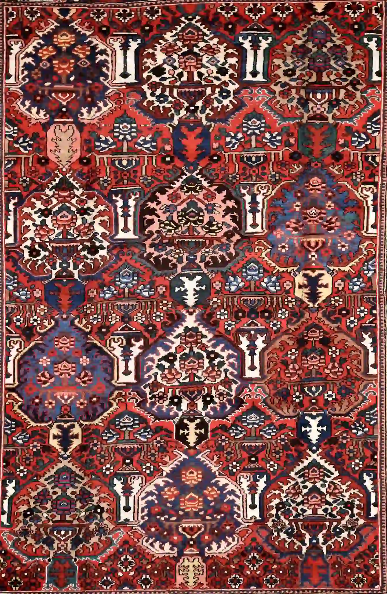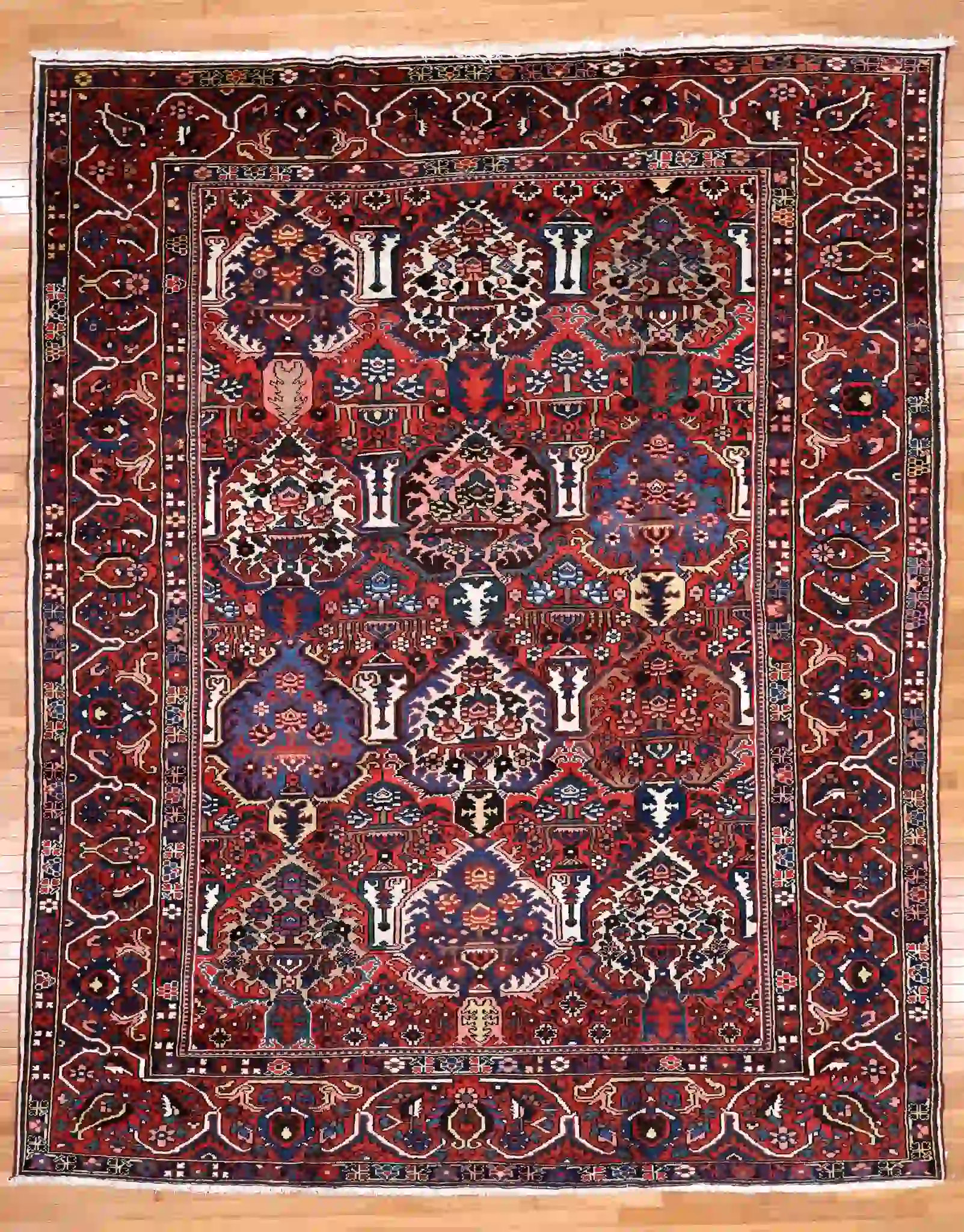 Bakhtiari rugs are woven by nomadic and settled tribes in the Zagros Mountains of southwest Iran, known for bold geometric patterns, thick construction, and vibrant natural dyes. These rugs often incorporate garden-inspired motifs symbolizing nature and protection, with sturdy wool that withstands heavy use. Vintage and semi-antique pieces like this one develop rich patina while retaining strong knotting and detail.