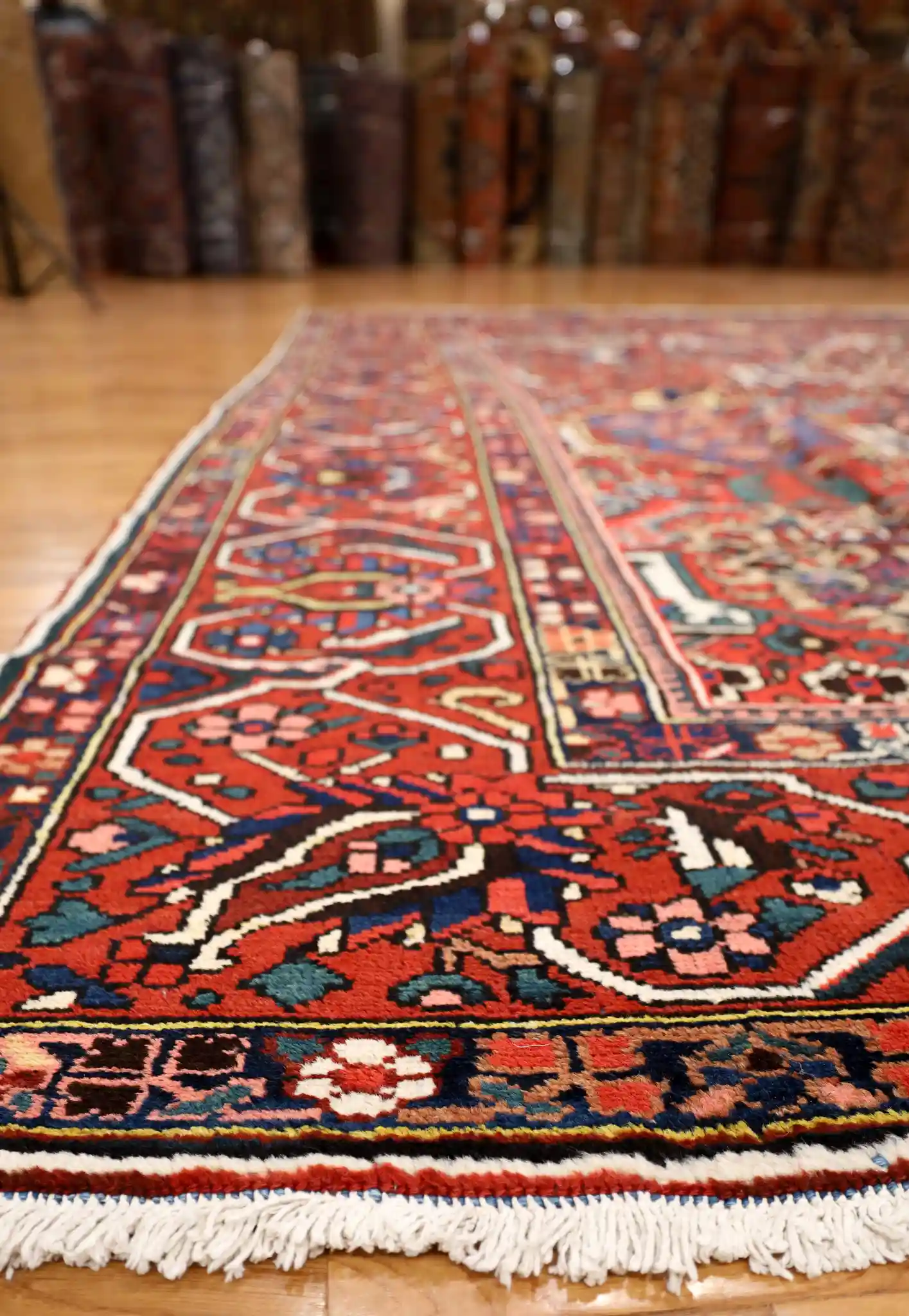A 10×13 rug suits spacious living rooms, great rooms, or formal dining areas seating ten or more, anchoring furniture groups with rich warmth. The brick red field adds cozy energy, while navy borders provide grounding contrast against wood floors or light walls. Wool offers plush comfort, exceptional durability, and natural stain resistance, with regular vacuuming keeping it fresh.