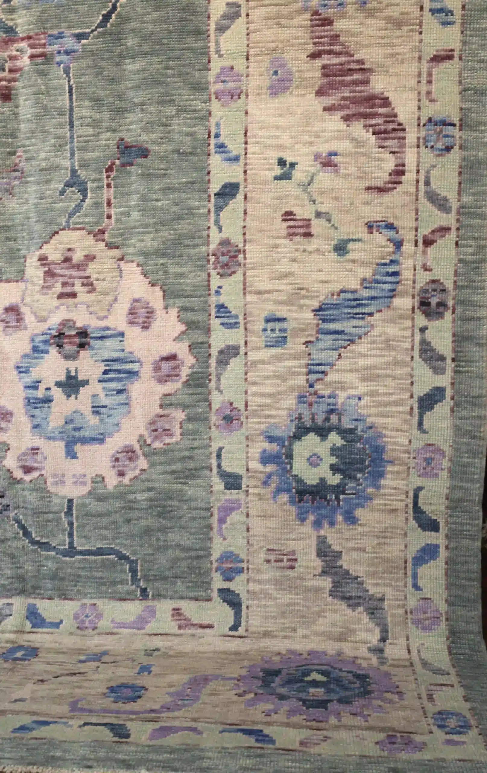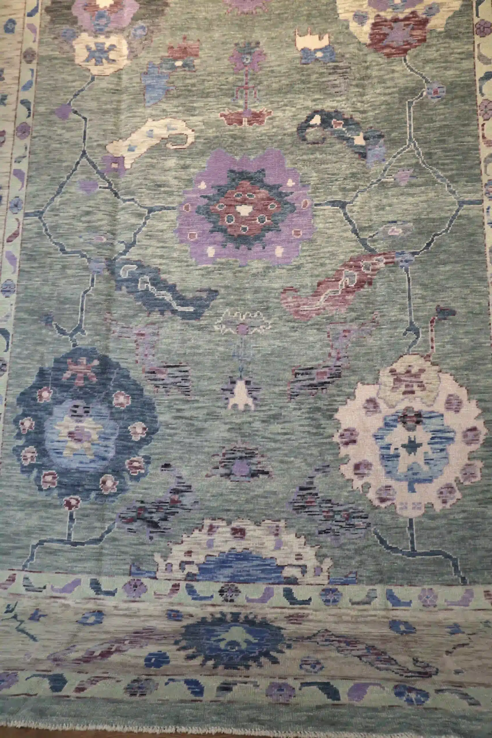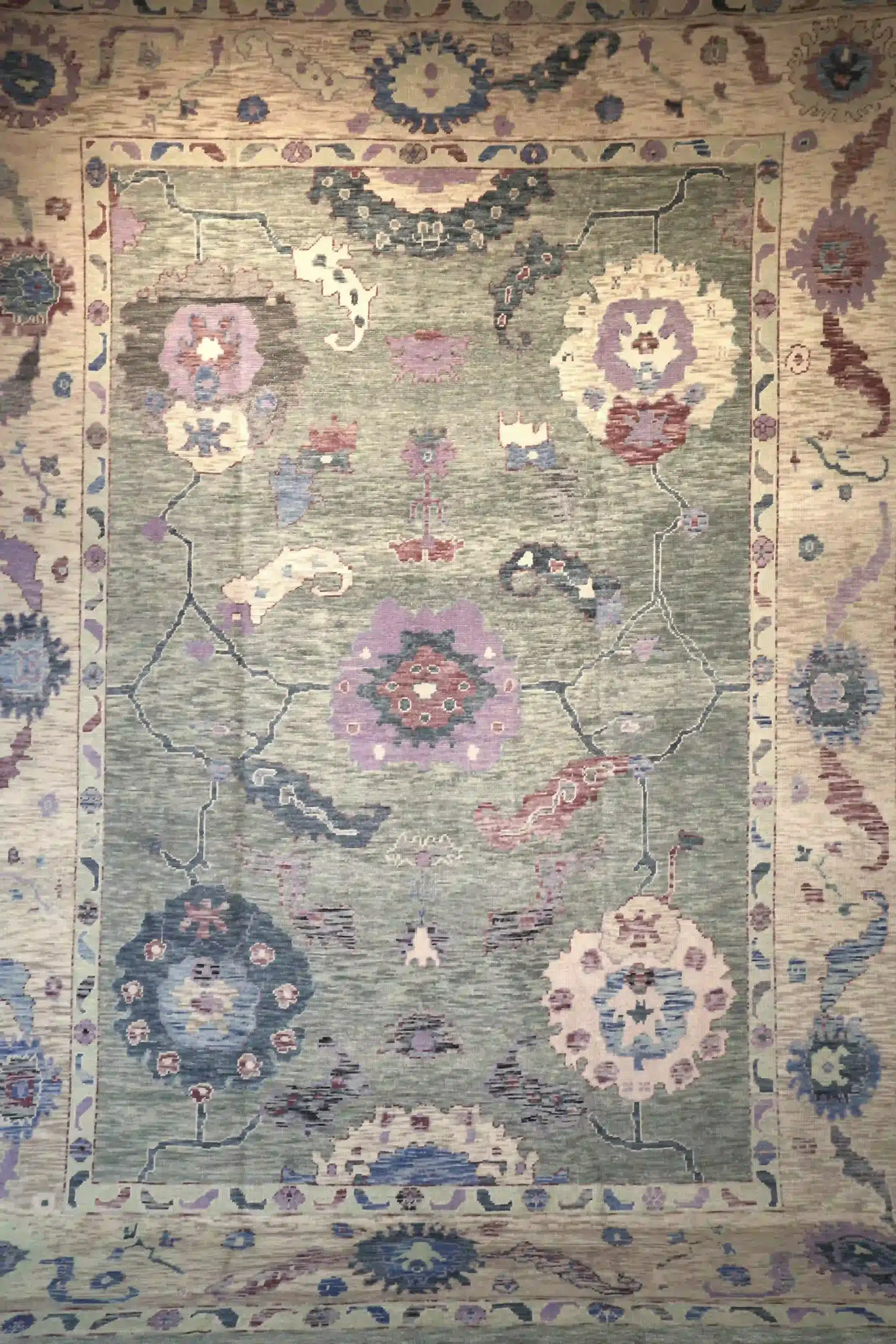 Oushak rugs have been produced in Turkey since the 15th century, known for their large motifs and light, harmonious color ways. Modern Turkish versions preserve this heritage while using contemporary softer palettes and high-quality wool to meet current tastes. This example shows careful hand-knotting with a medium pile that offers both comfort and visual lightness.