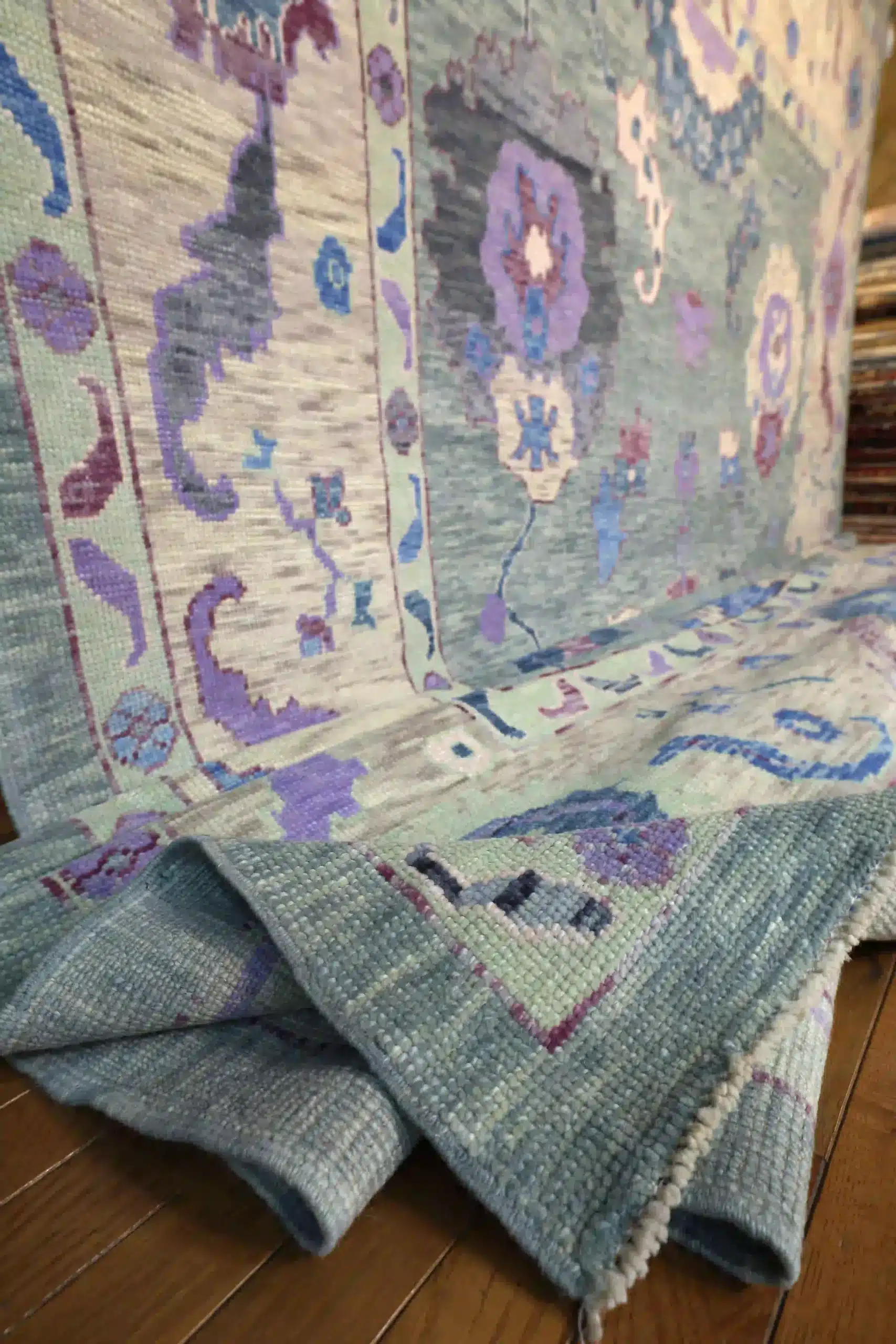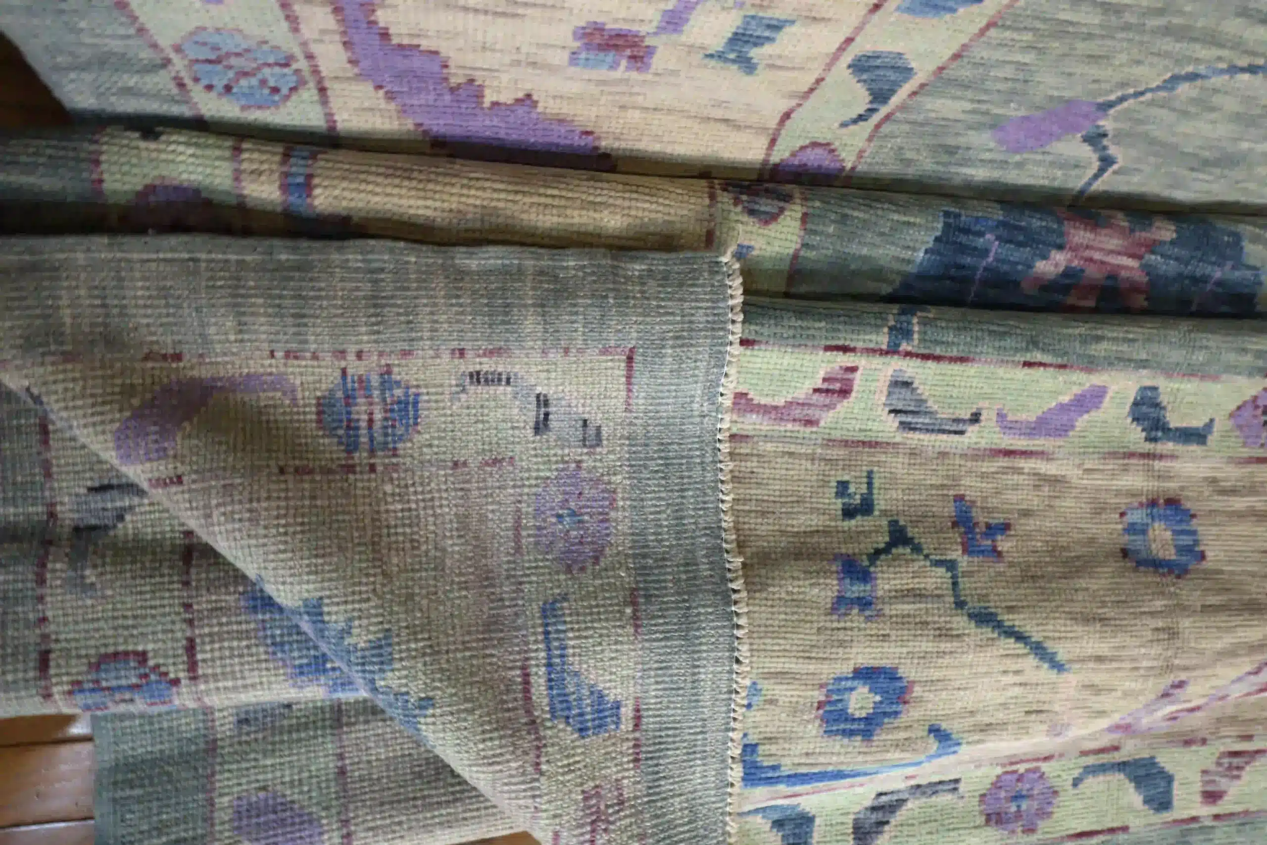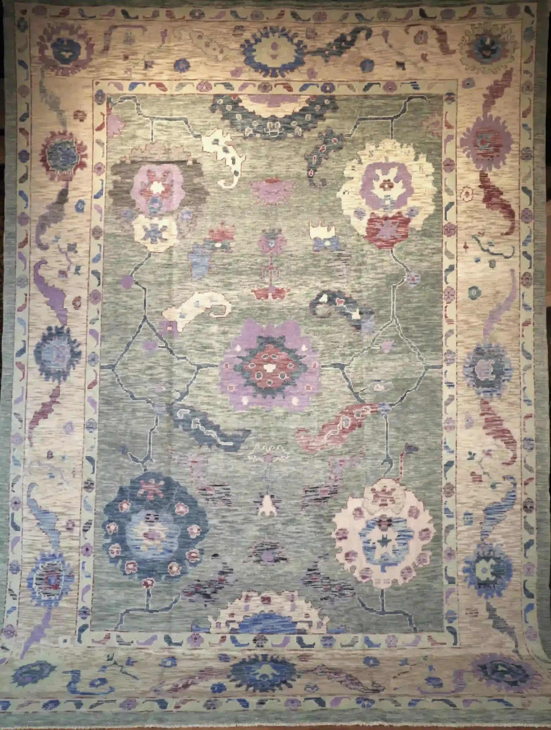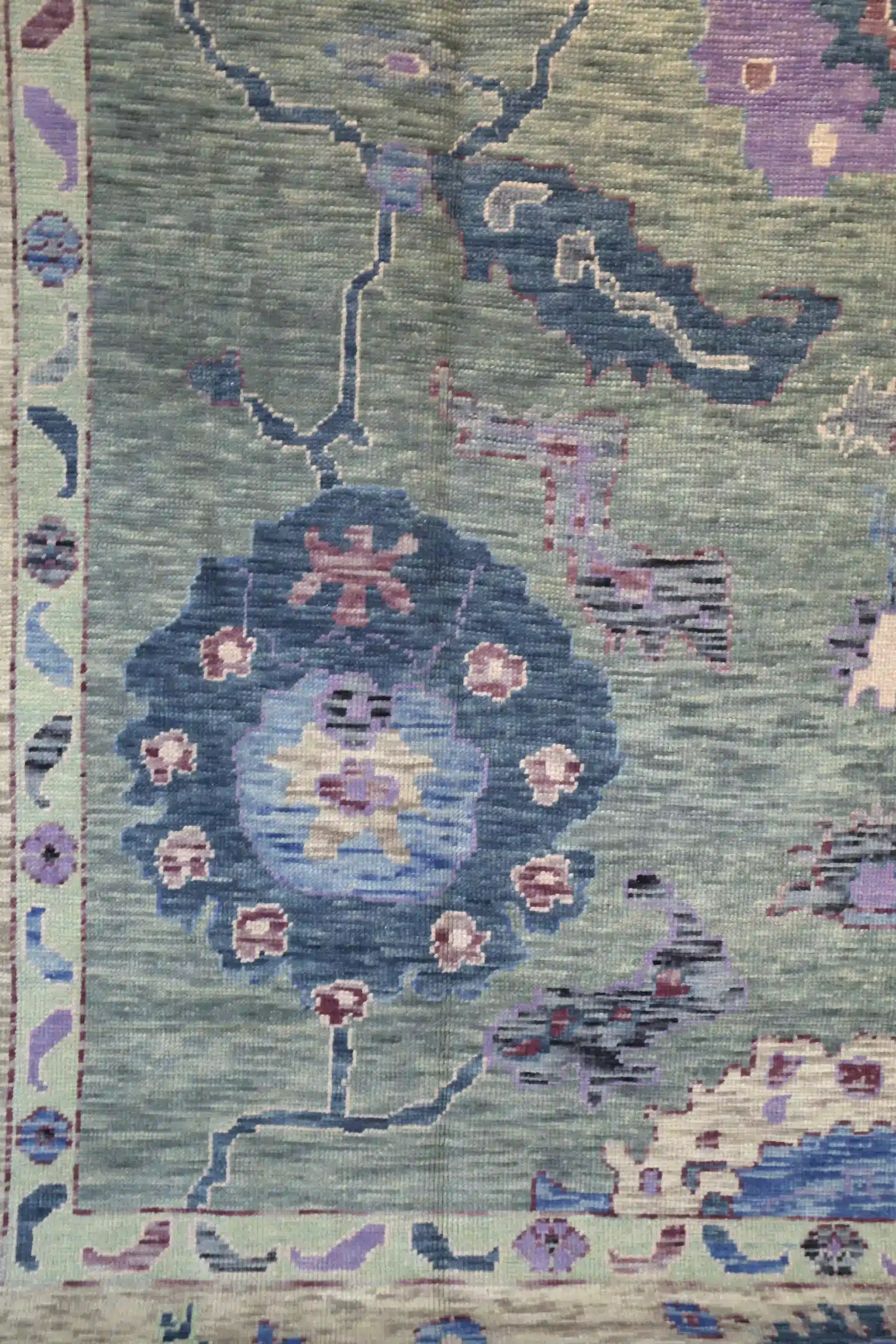 Oushak rugs have been produced in Turkey since the 15th century, known for their large motifs and light, harmonious color ways. Modern Turkish versions preserve this heritage while using contemporary softer palettes and high-quality wool to meet current tastes. This example shows careful hand-knotting with a medium pile that offers both comfort and visual lightness.