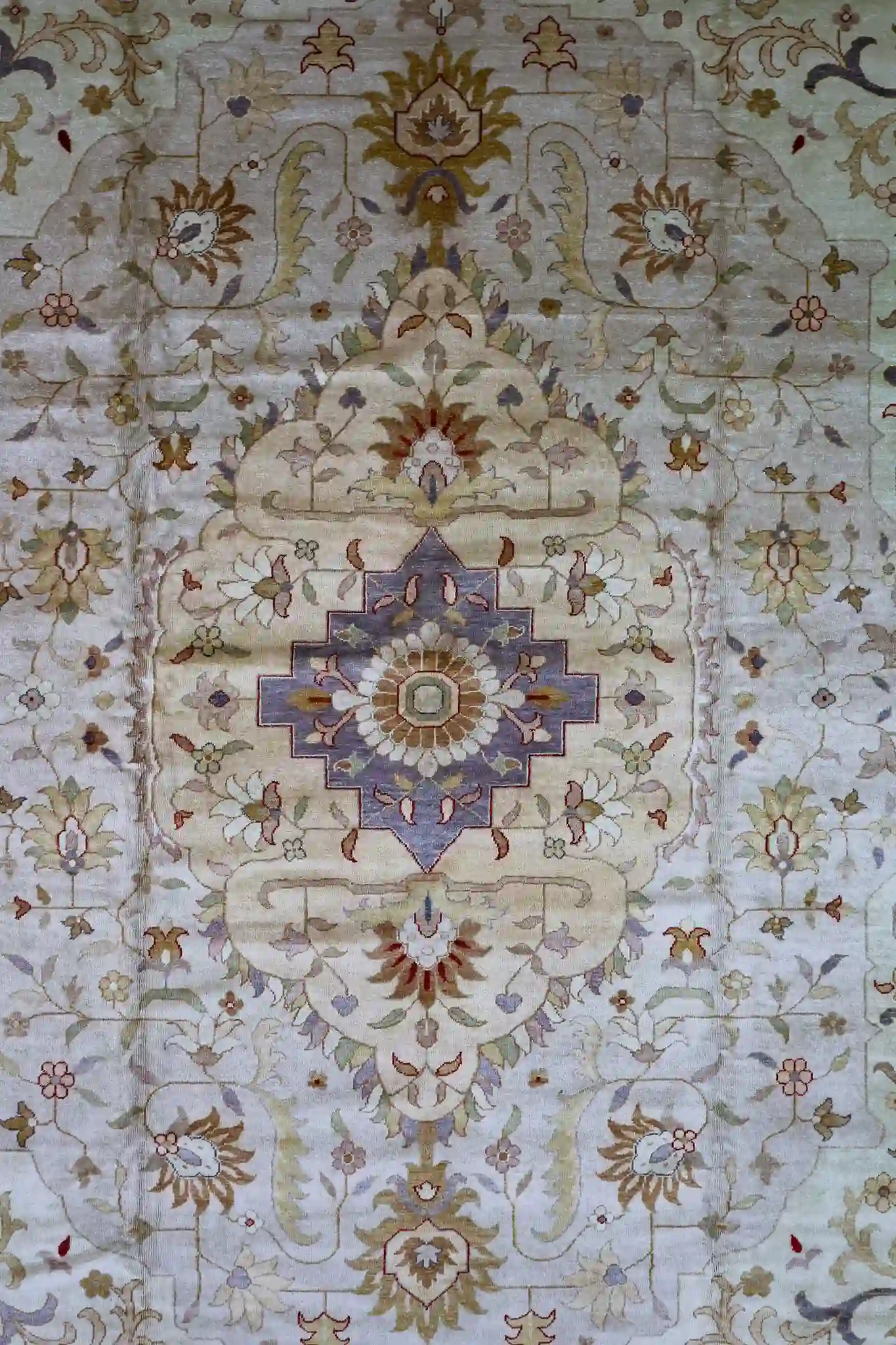 This large Turkish Farahan design rug presents a graceful all-over pattern of repeating vines, palmettes, and delicate blossoms spread across a pale beige ground. A subtle layered medallion emerges from symmetrical arabesque forms, flanked by corner spandrels, while wide borders feature continuous garlands, repeating floral sprays, and small geometric motifs in rose and sage tones. The gentle abrash and soft, washed appearance create a serene, antique-inspired look with refined harmony.