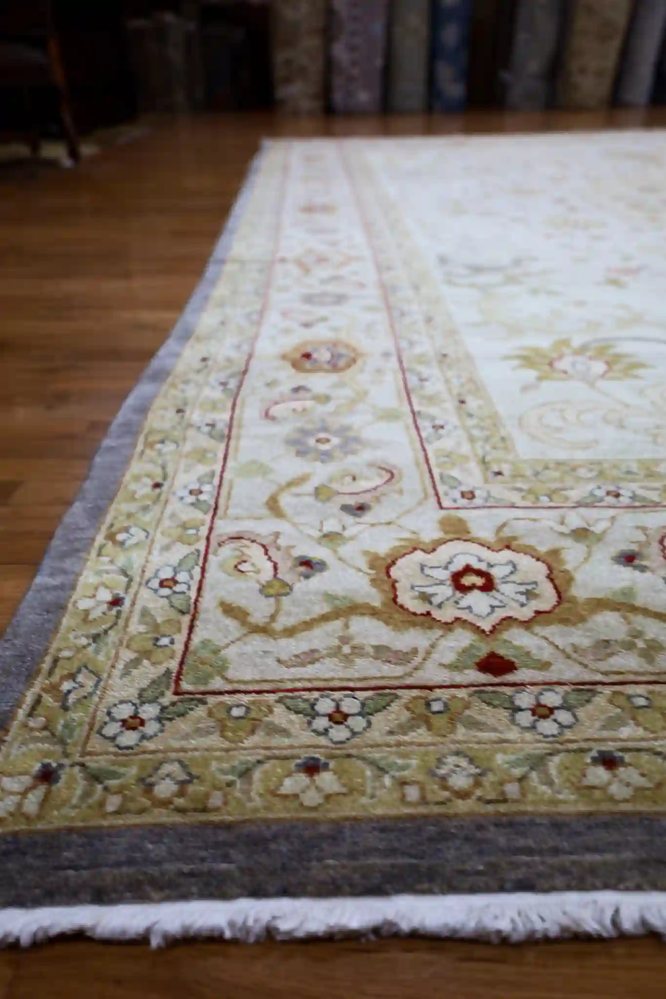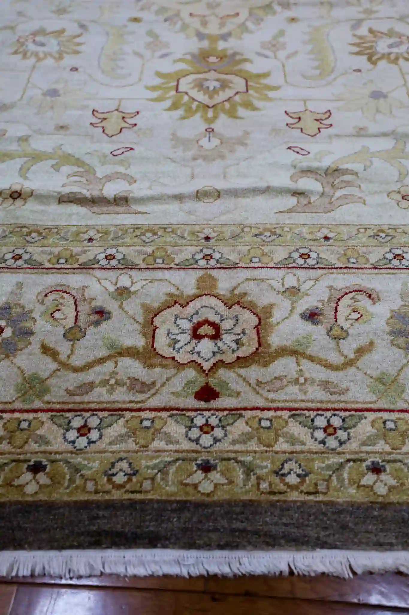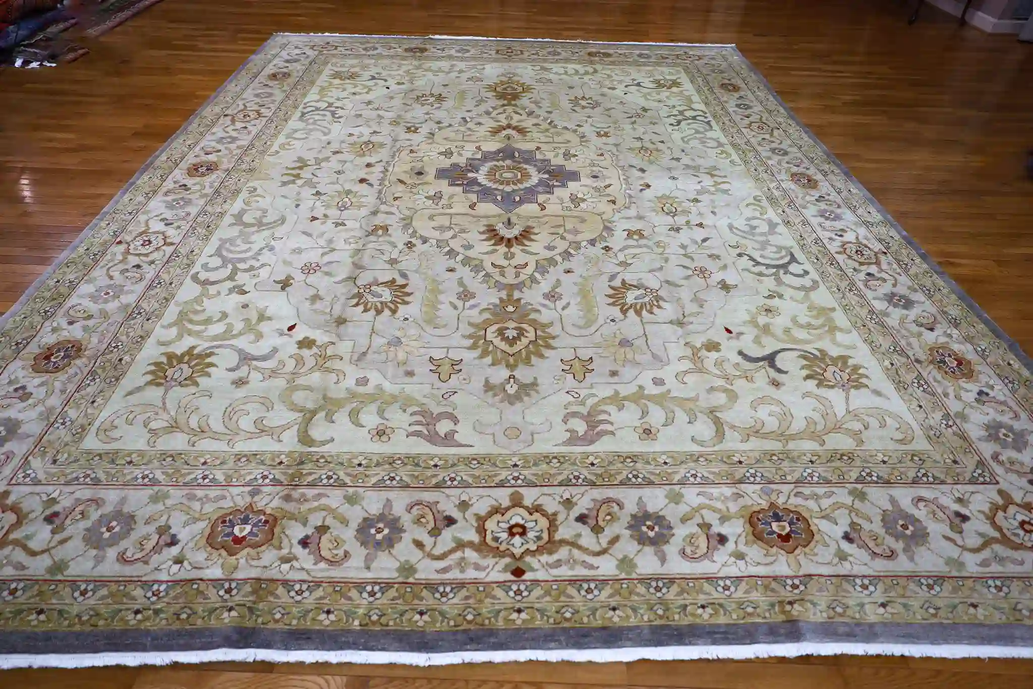 A 12×15 rug provides expansive coverage for great rooms, large living areas, or formal dining spaces seating twelve or more, anchoring substantial furniture groups with subtle sophistication. The soft beige base with rose and sage accents pairs beautifully with light woods, neutrals, or earthy tones, adding calm warmth to open interiors. Wool delivers natural softness, sound absorption, and strong resilience, with easy care through regular vacuuming.
