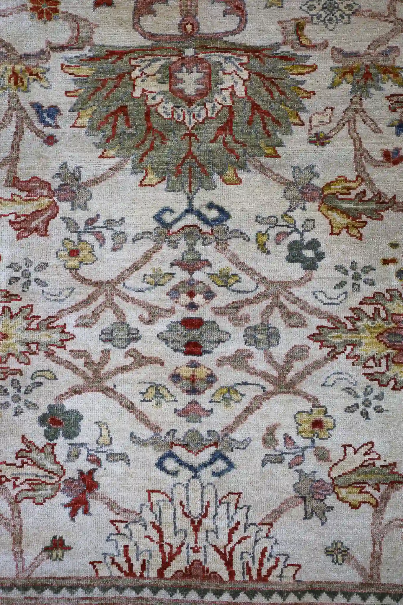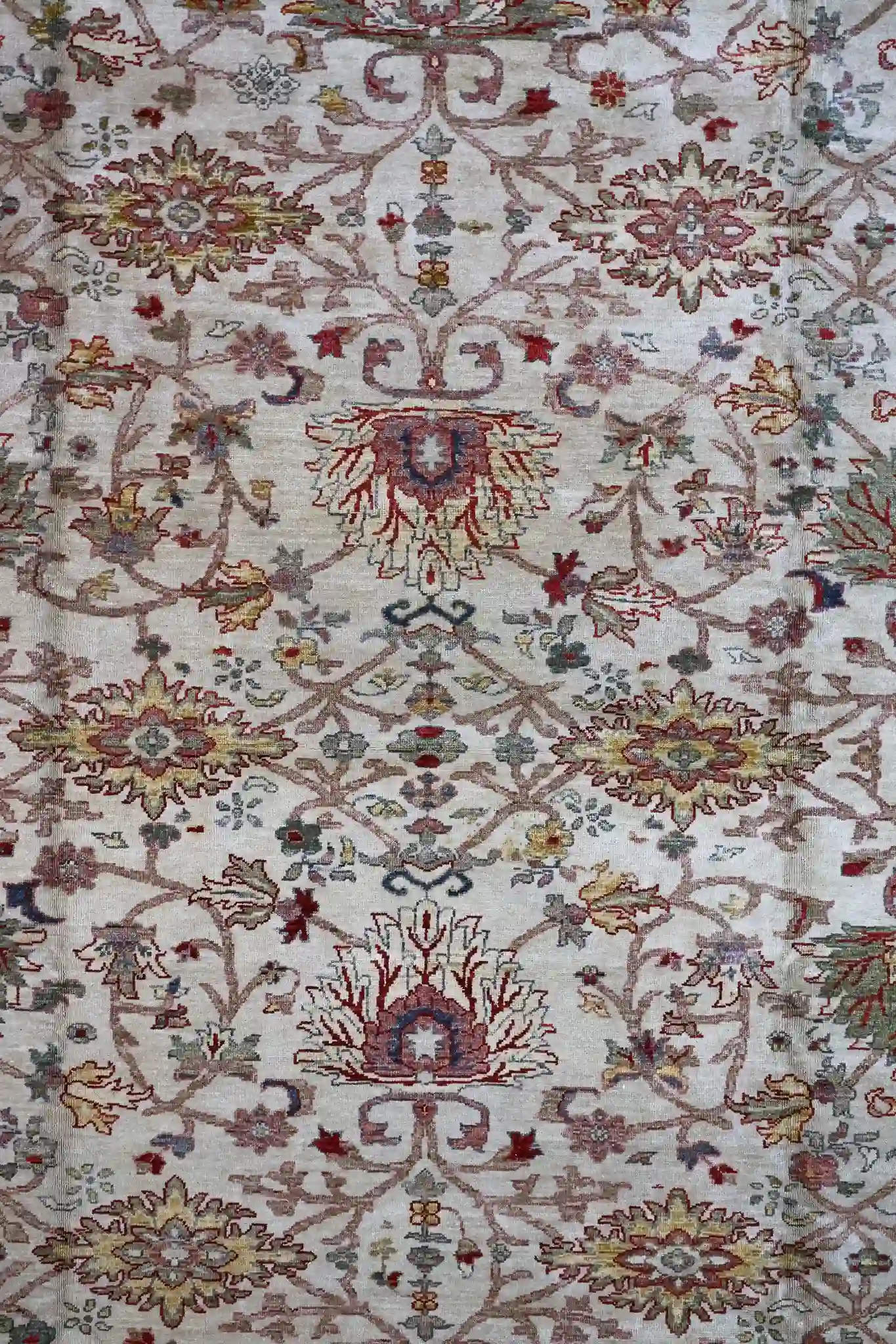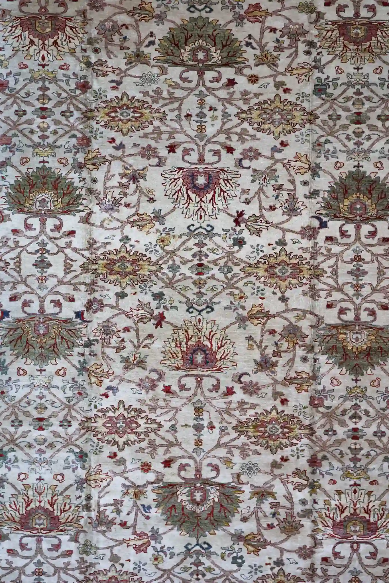 This large Turkish Sultanabad rug presents an elegant all-over floral pattern with repeating vines, palmettes, and delicate blossoms spreading across a pale beige ground. A subtle layered medallion emerges from symmetrical arabesque forms, flanked by corner spandrels, while wide borders feature continuous garlands, repeating floral sprays, and small geometric motifs in rose and sage tones. The gentle abrash and soft, washed appearance create a serene, antique-inspired look with refined harmony.