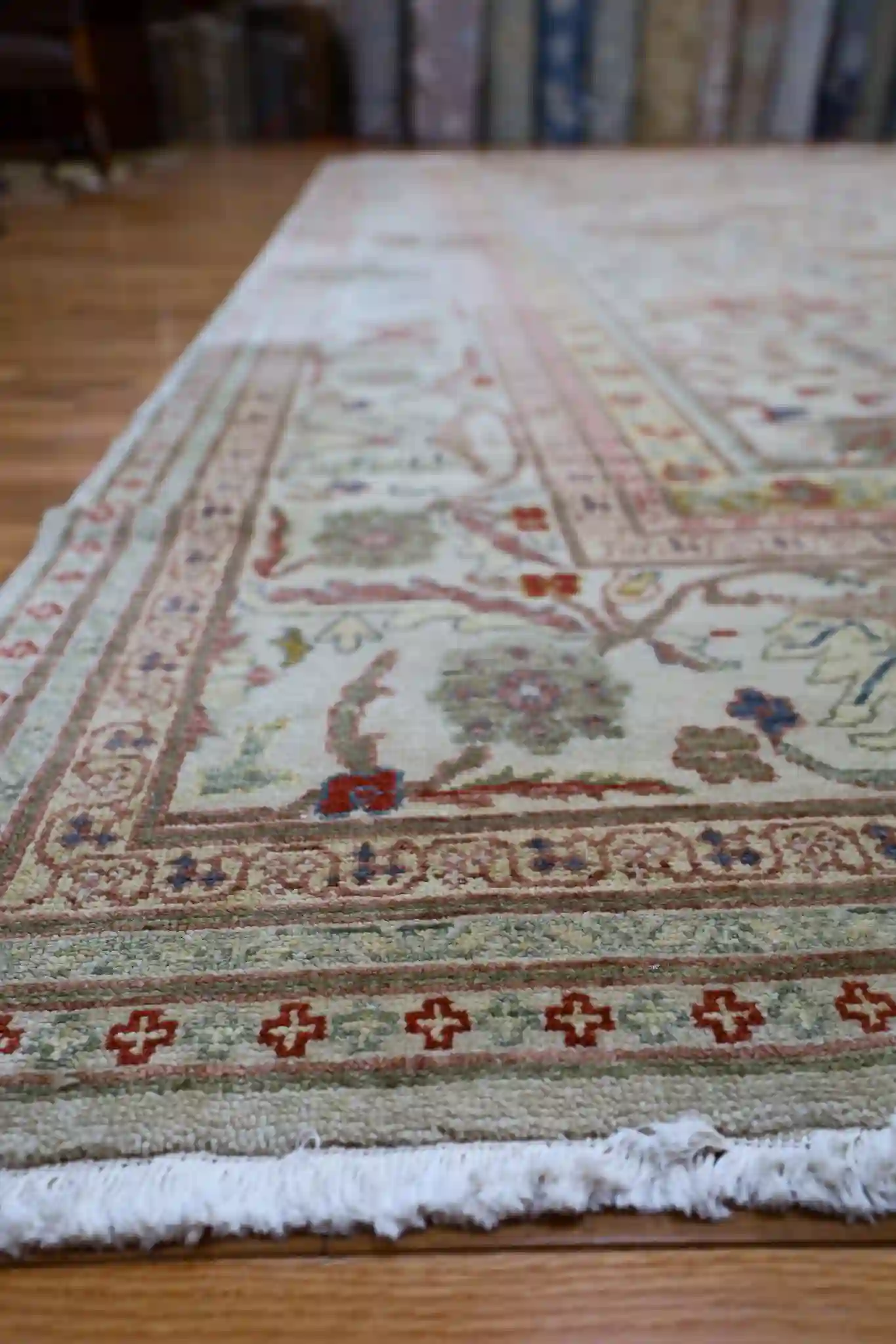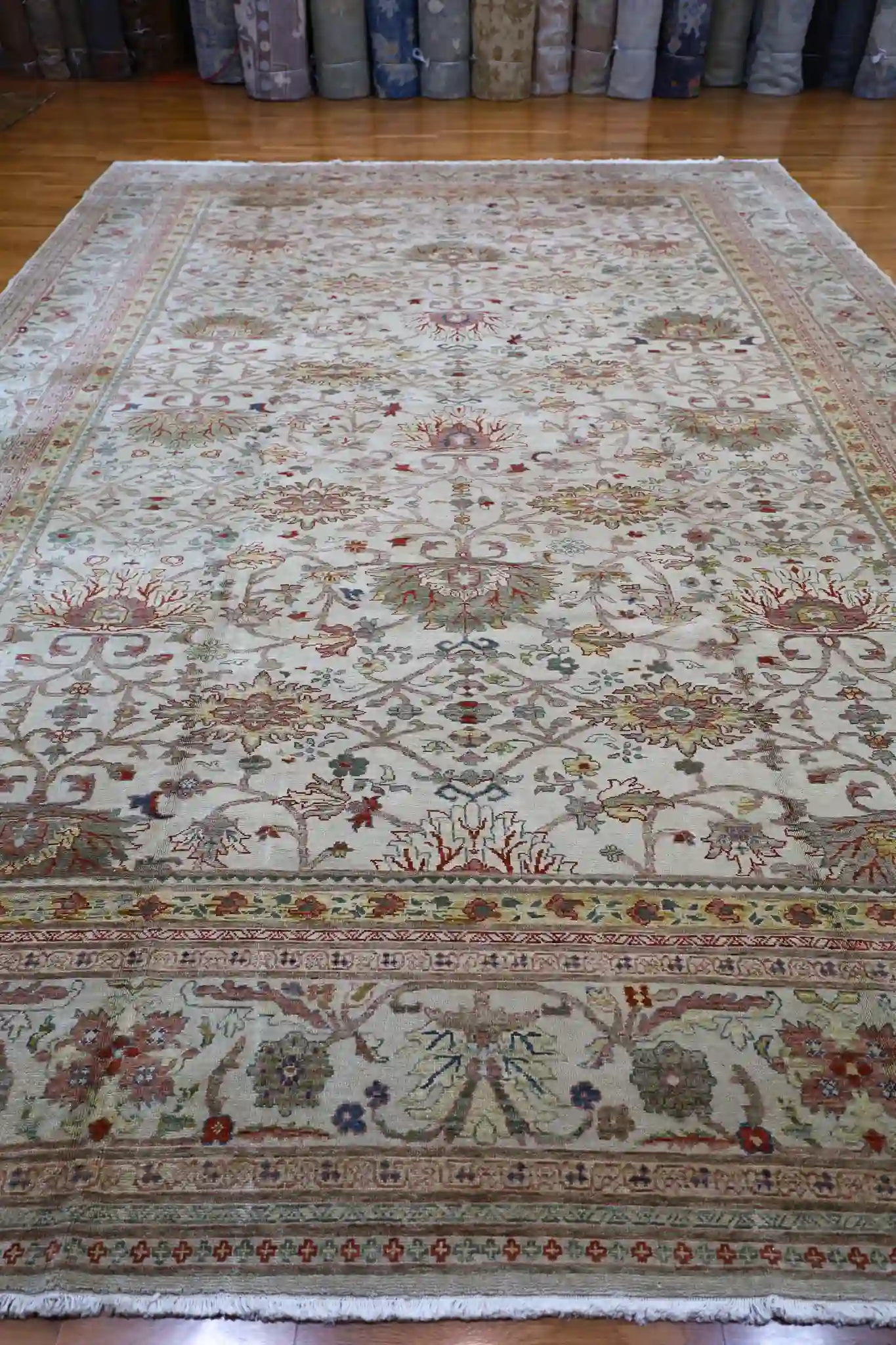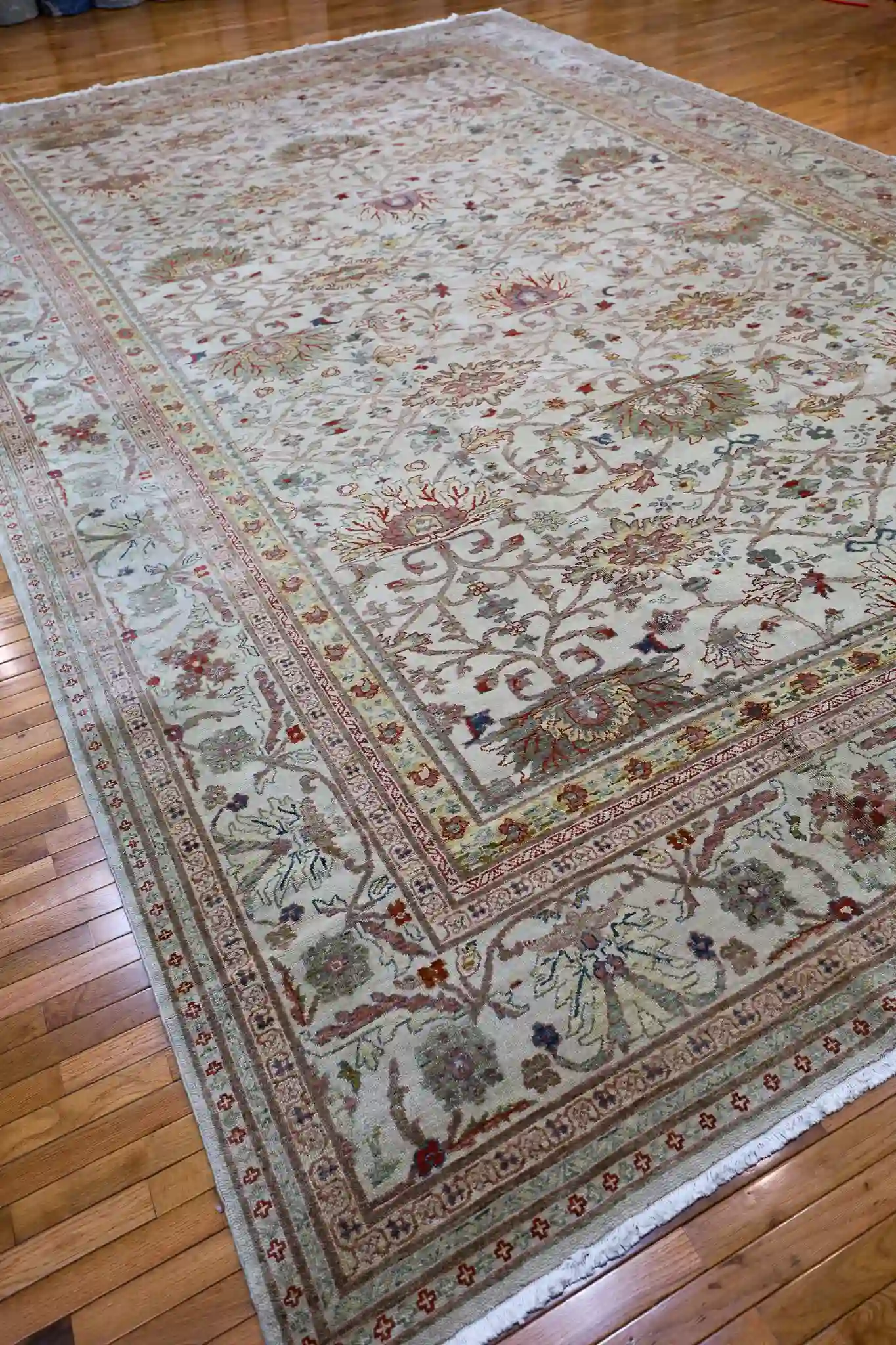 A 12×19 rug provides expansive coverage for great rooms, large living areas, or formal dining spaces seating twelve or more, anchoring substantial furniture groups with subtle sophistication. The soft beige base with rose and sage accents pairs beautifully with light woods, neutrals, or earthy tones, adding calm warmth to open interiors. Wool delivers natural softness, sound absorption, and strong resilience, with easy care through regular vacuuming.