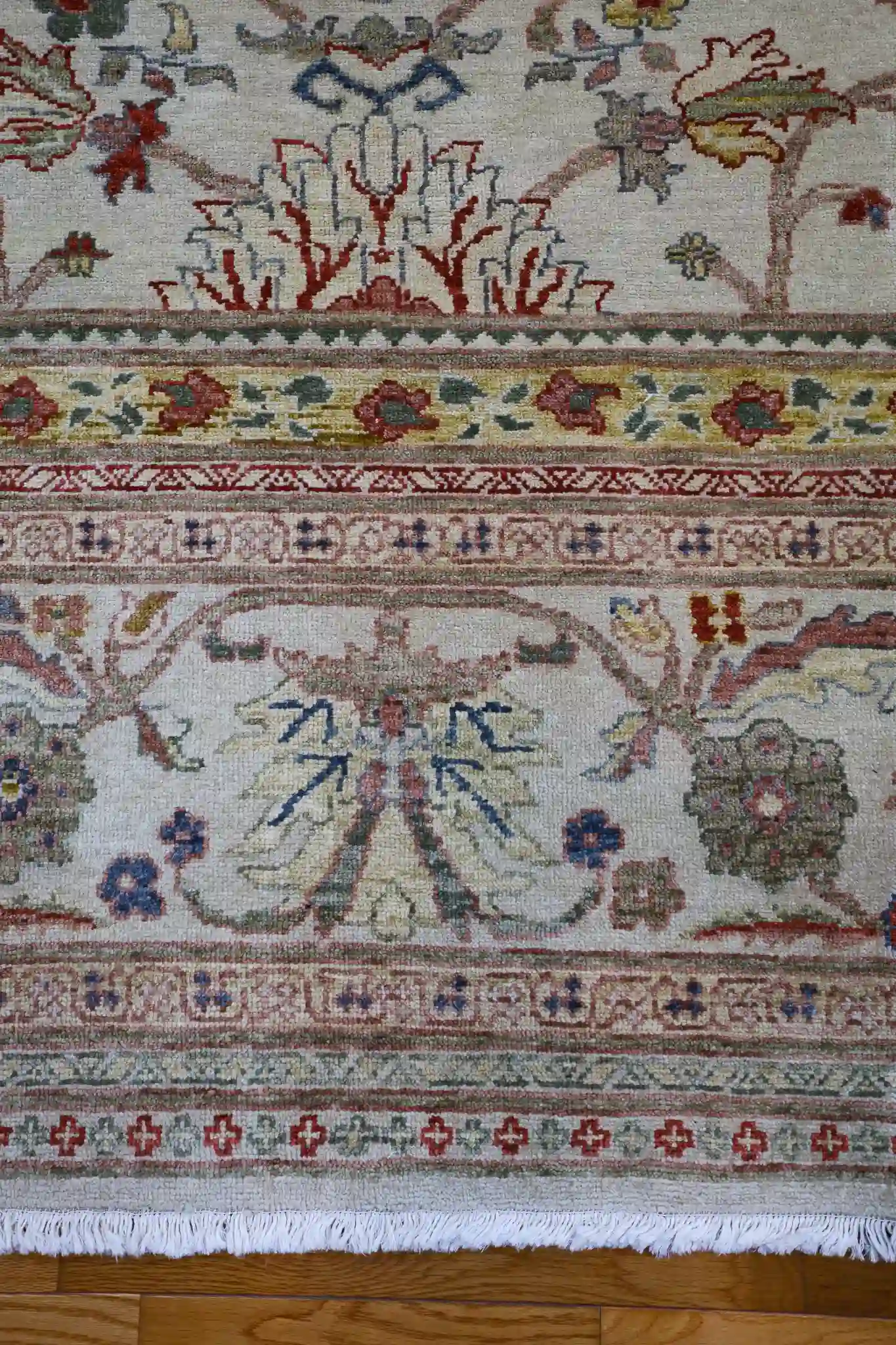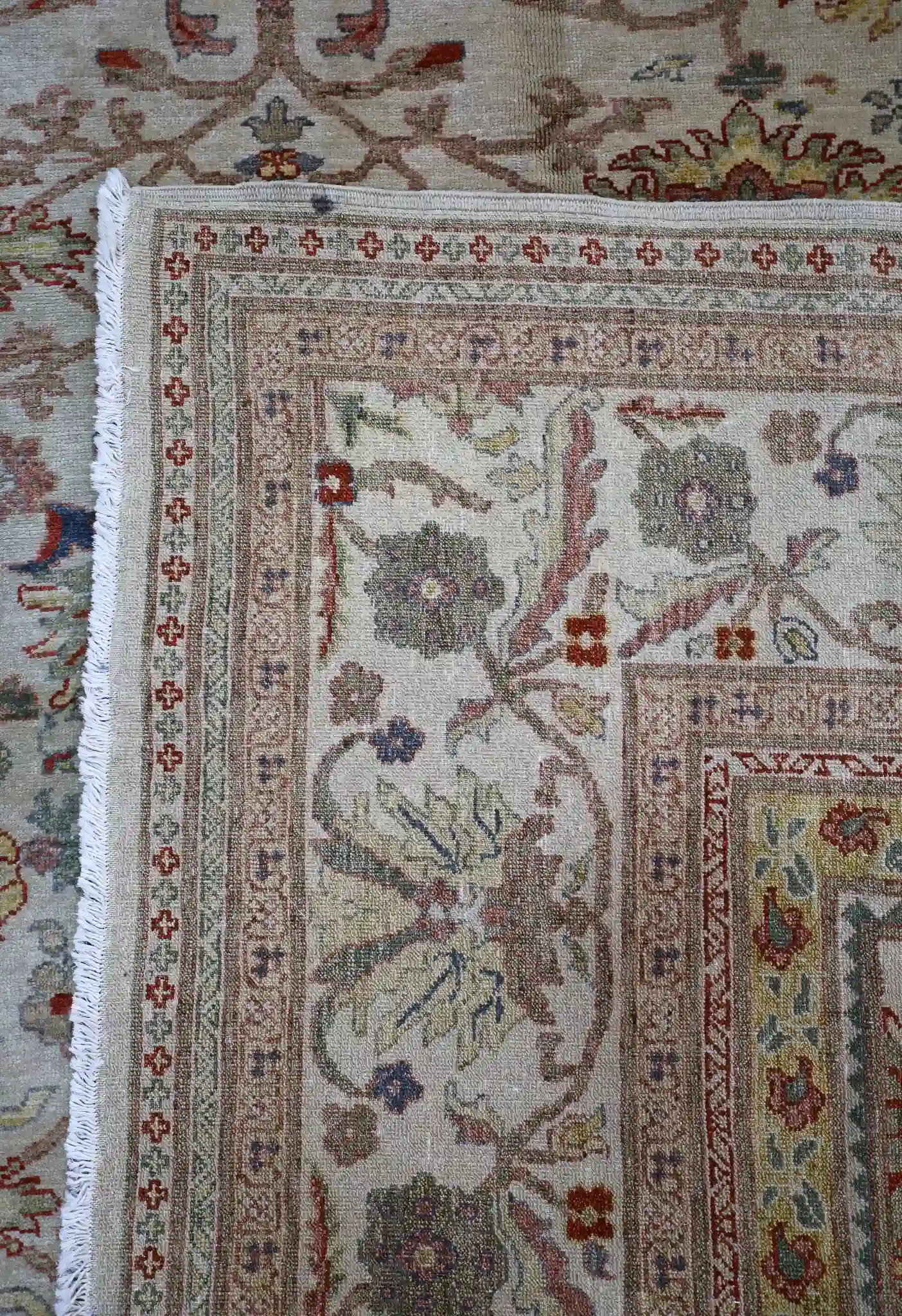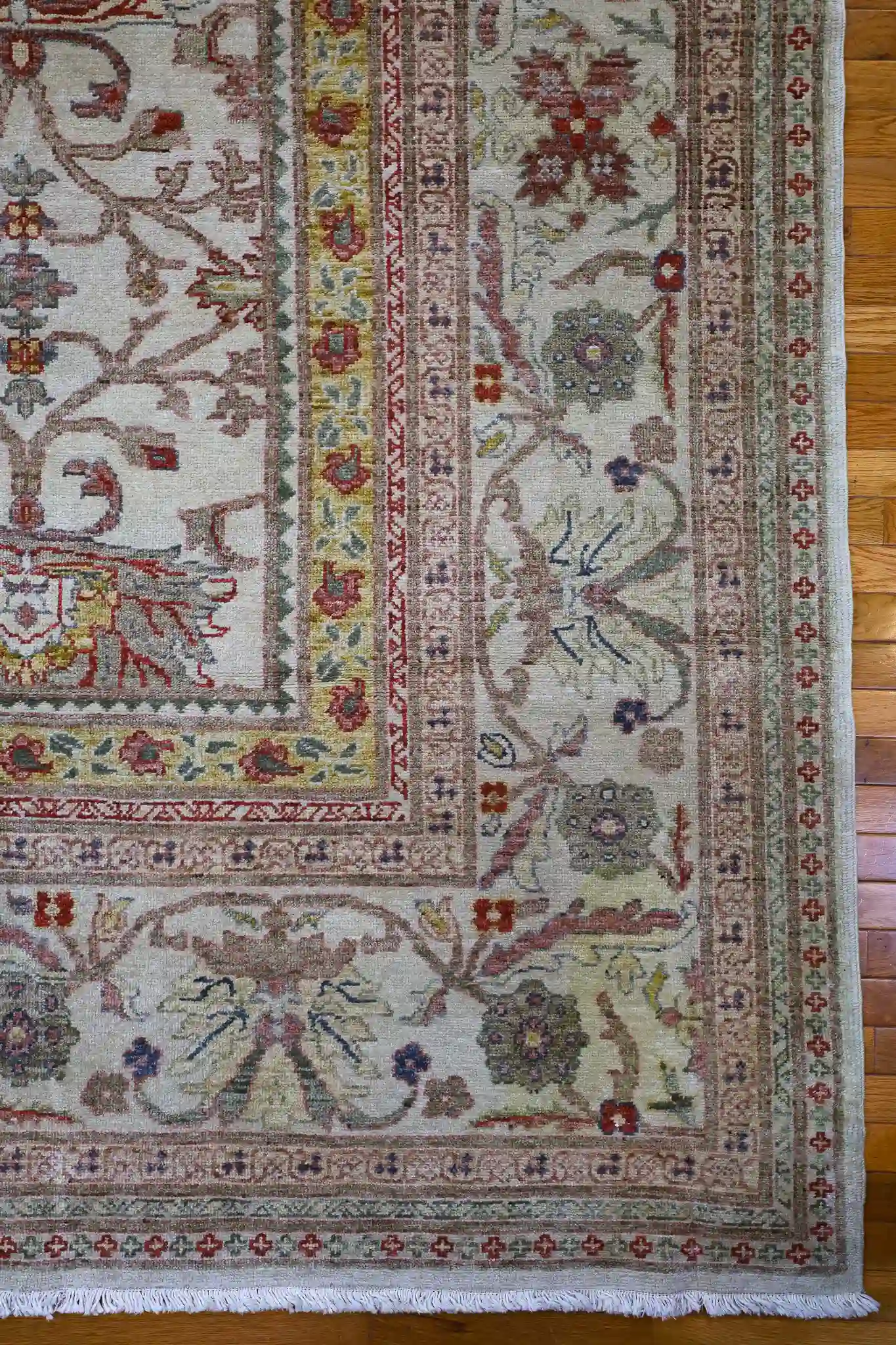 A 12×19 rug provides expansive coverage for great rooms, large living areas, or formal dining spaces seating twelve or more, anchoring substantial furniture groups with subtle sophistication. The soft beige base with rose and sage accents pairs beautifully with light woods, neutrals, or earthy tones, adding calm warmth to open interiors. Wool delivers natural softness, sound absorption, and strong resilience, with easy care through regular vacuuming.