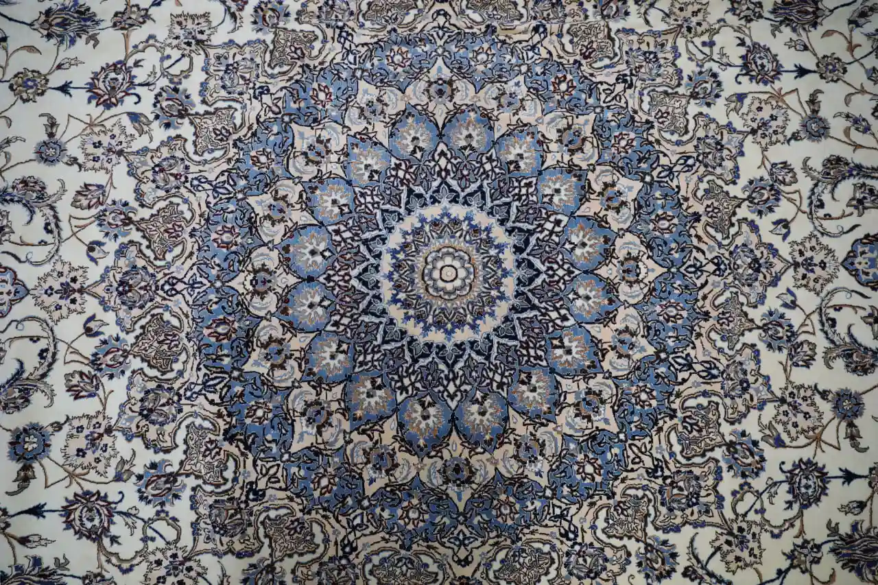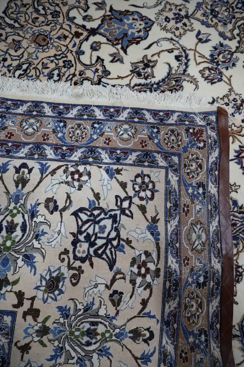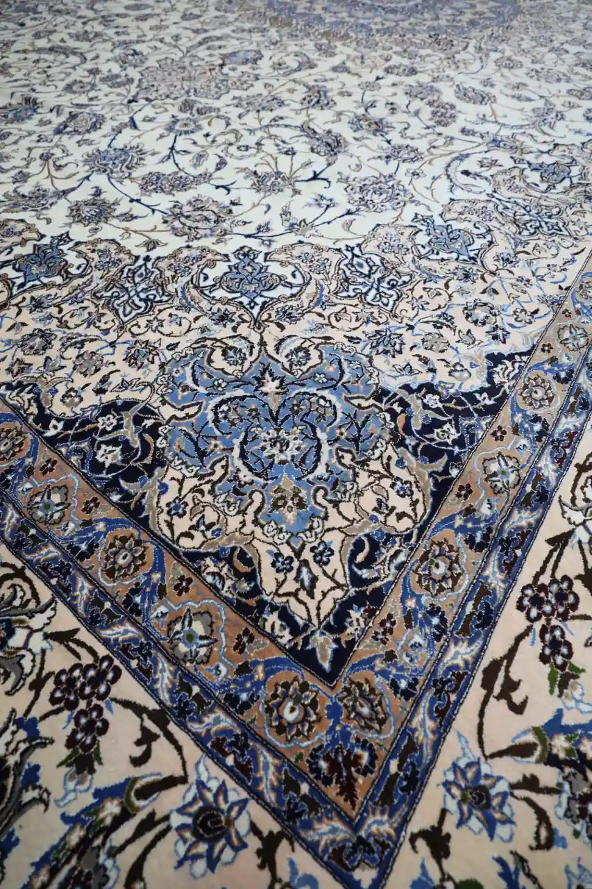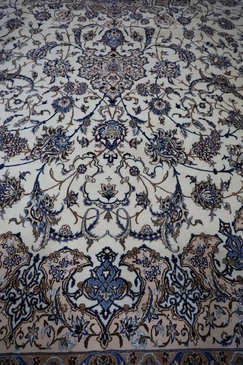 This large Persian Naein rug is an exceptional example of refined classical weaving, featuring an intricate floral field centered around a detailed medallion. The design reflects the elegance and precision for which Naein rugs are internationally admired, combining symmetry, balance, and delicate ornamentation.