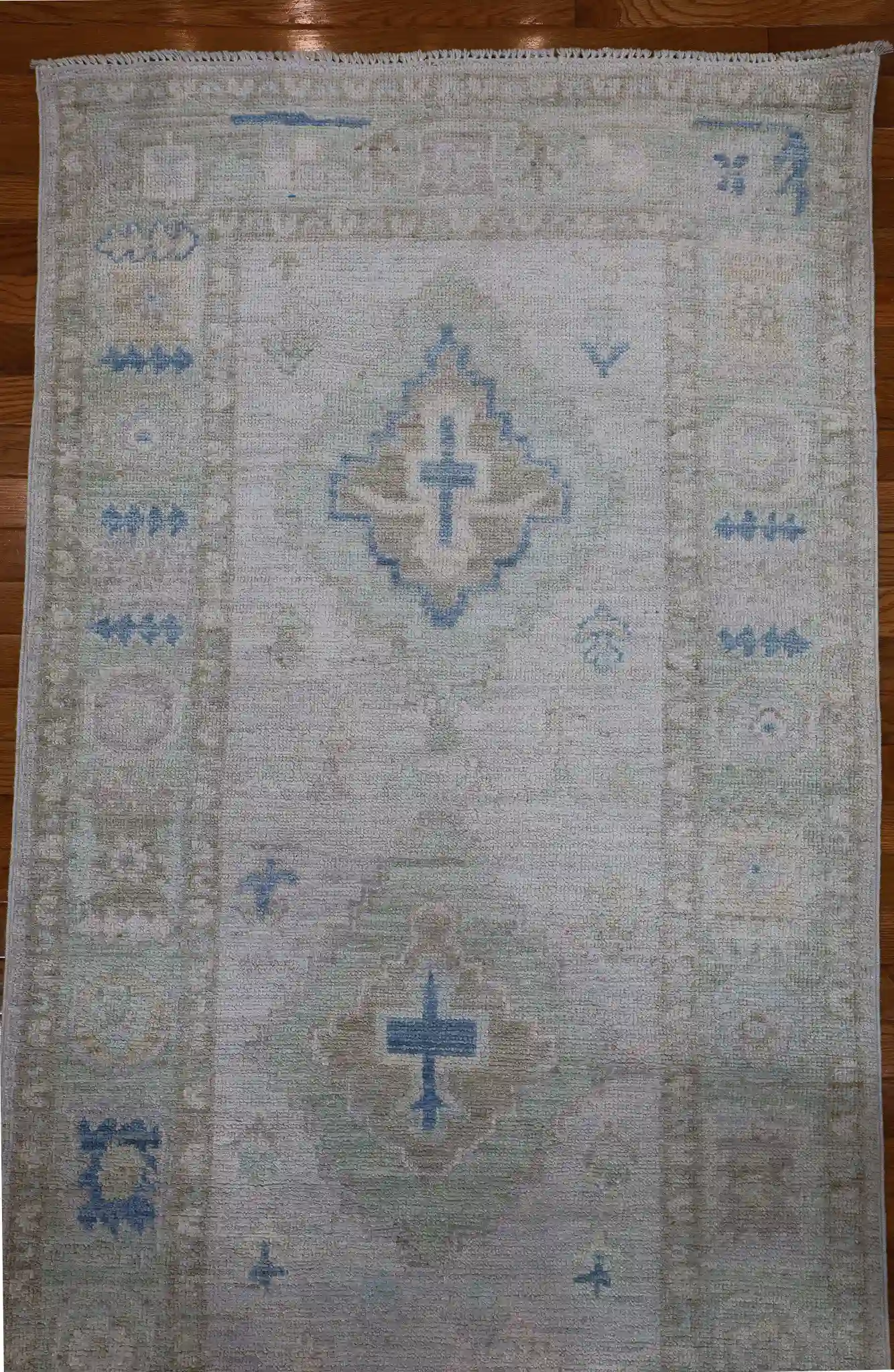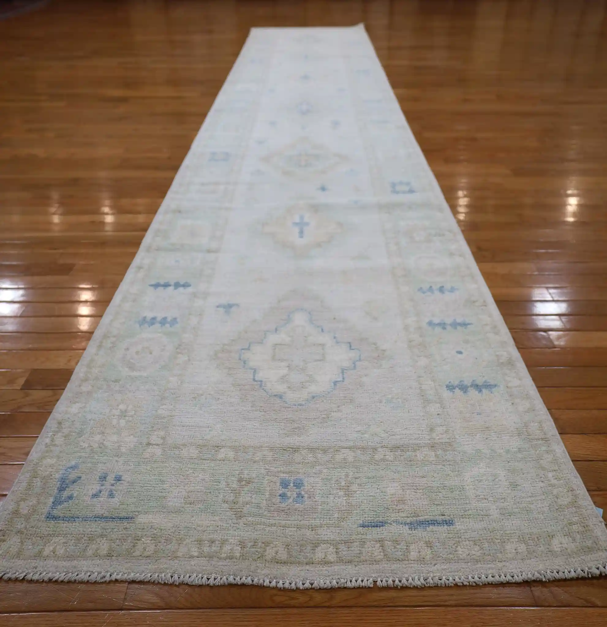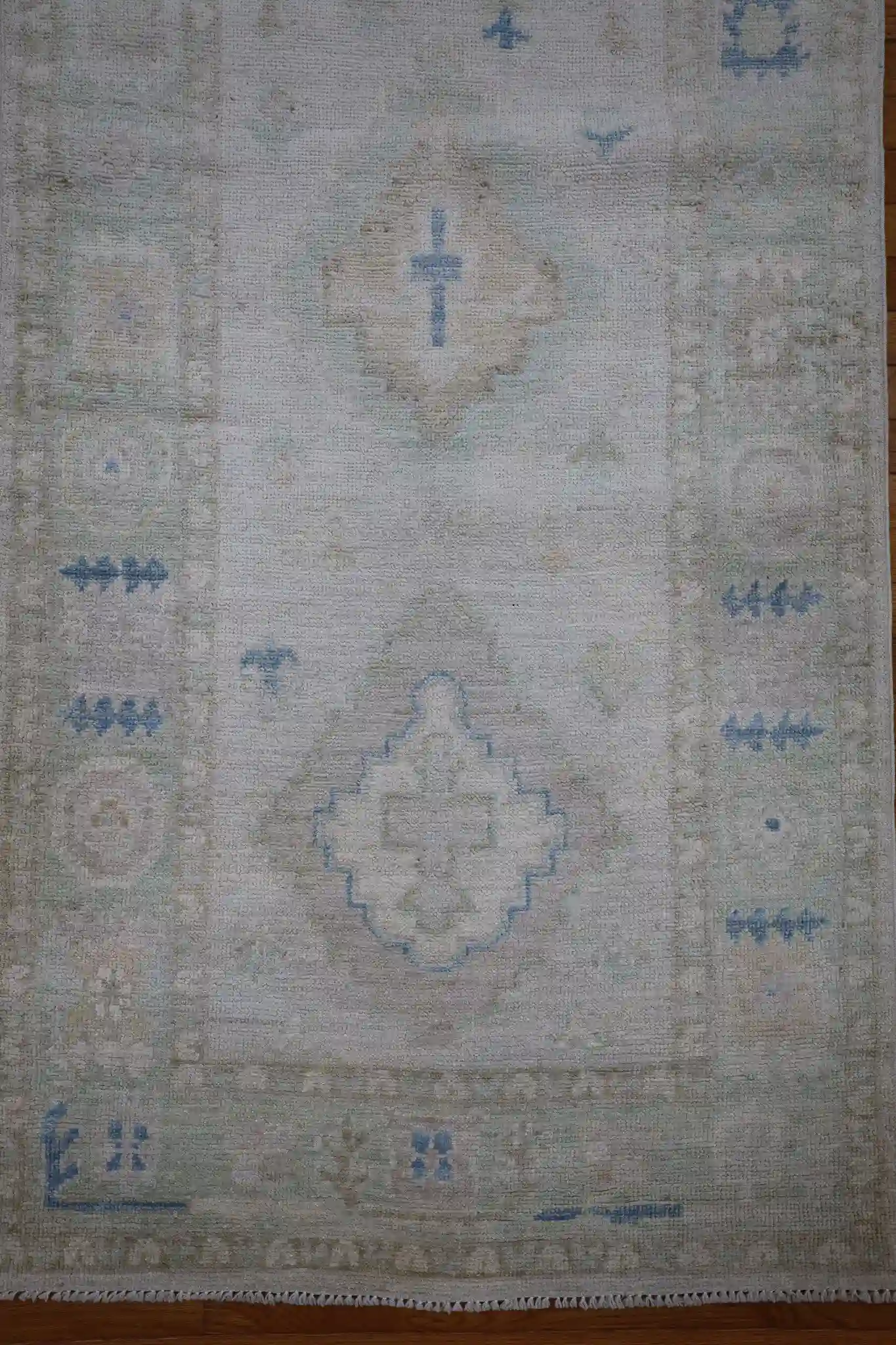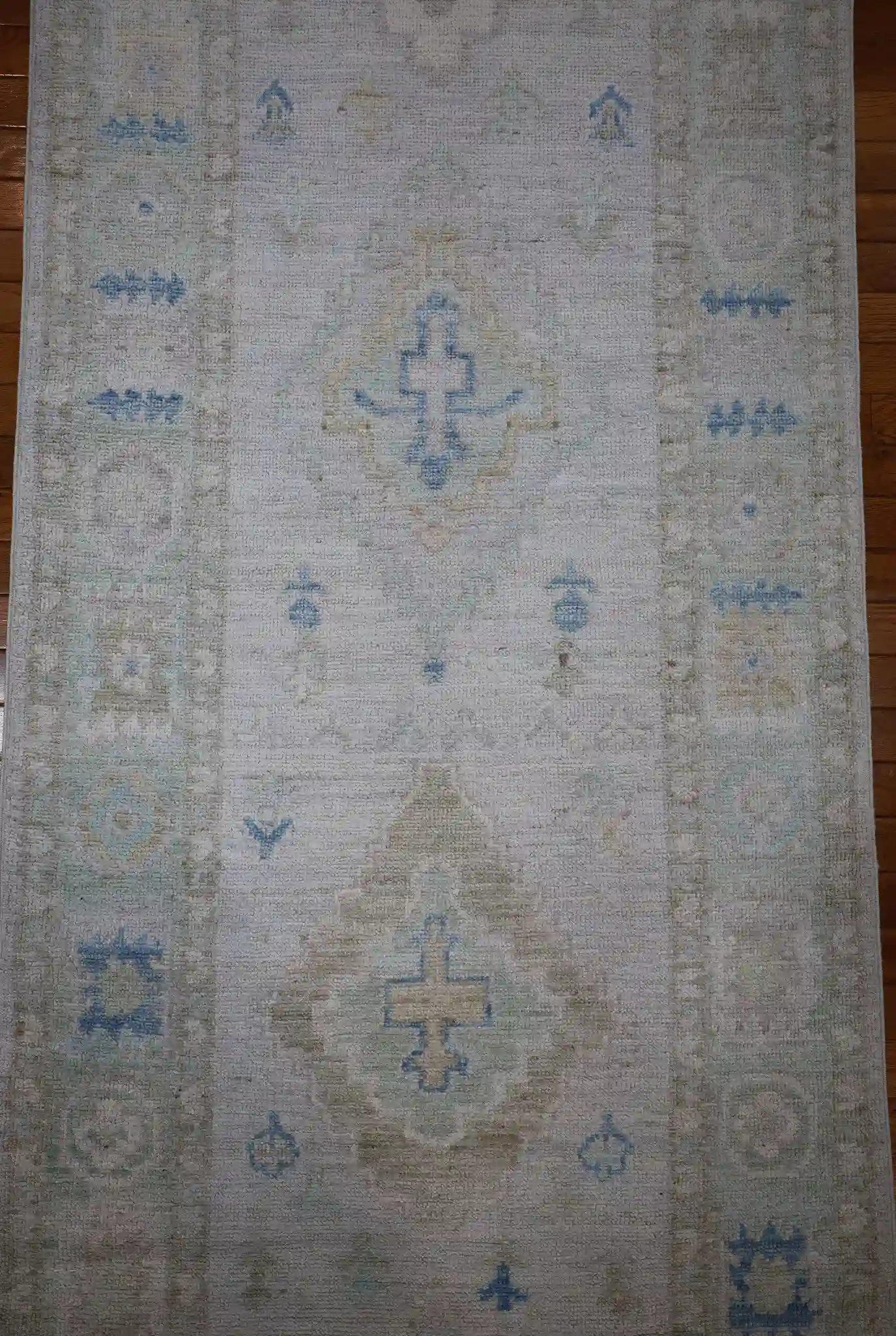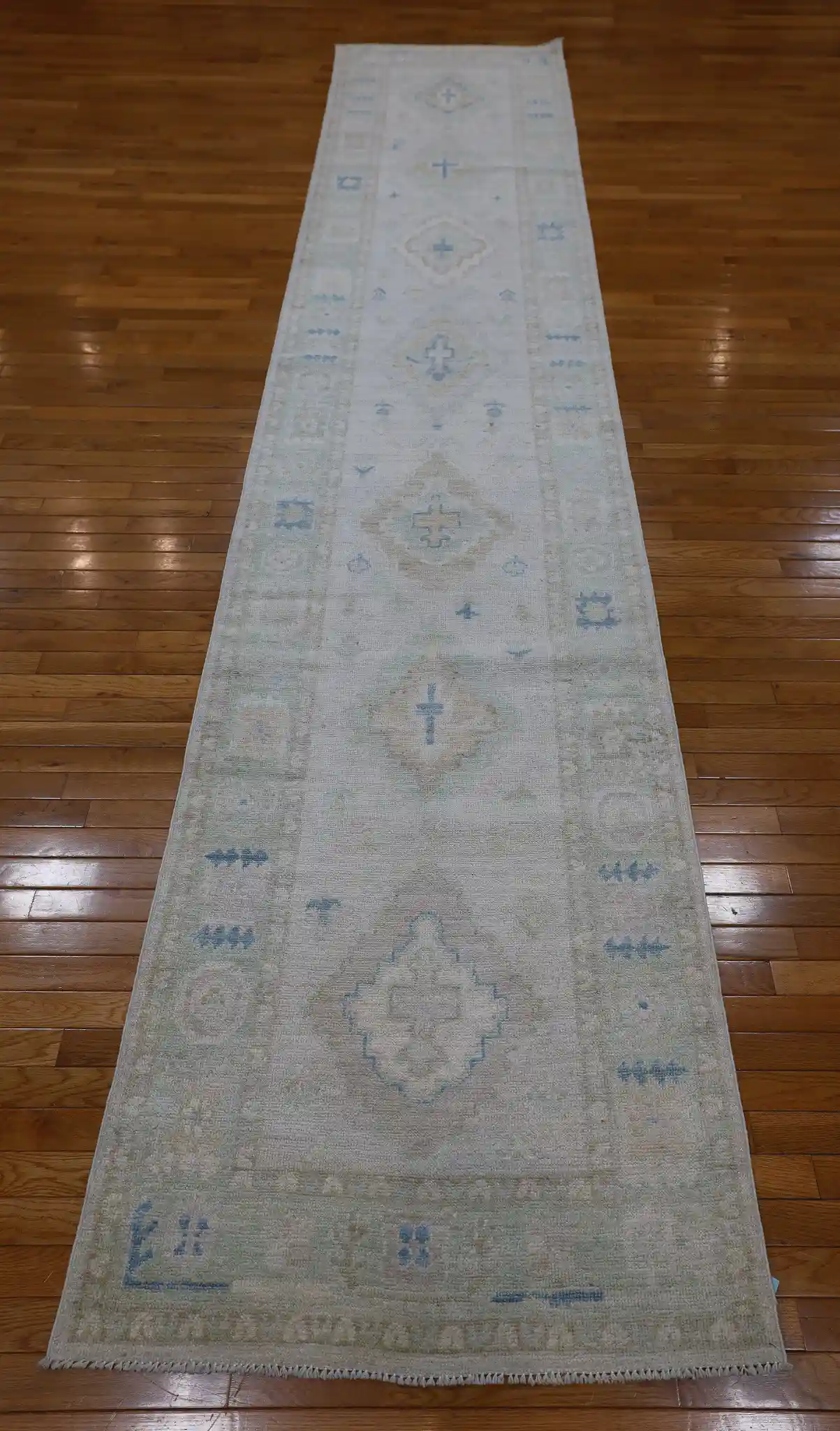 This elegant runner showcases a very open and spacious Oushak design with a light, airy feel. The main field features large central diamond medallions and smaller geometric crosses, surrounded by scattered smaller motifs like stars, arrows, and floral elements in soft blue tones. The wide borders contain repeating geometric and vine patterns that keep the look balanced and timeless.