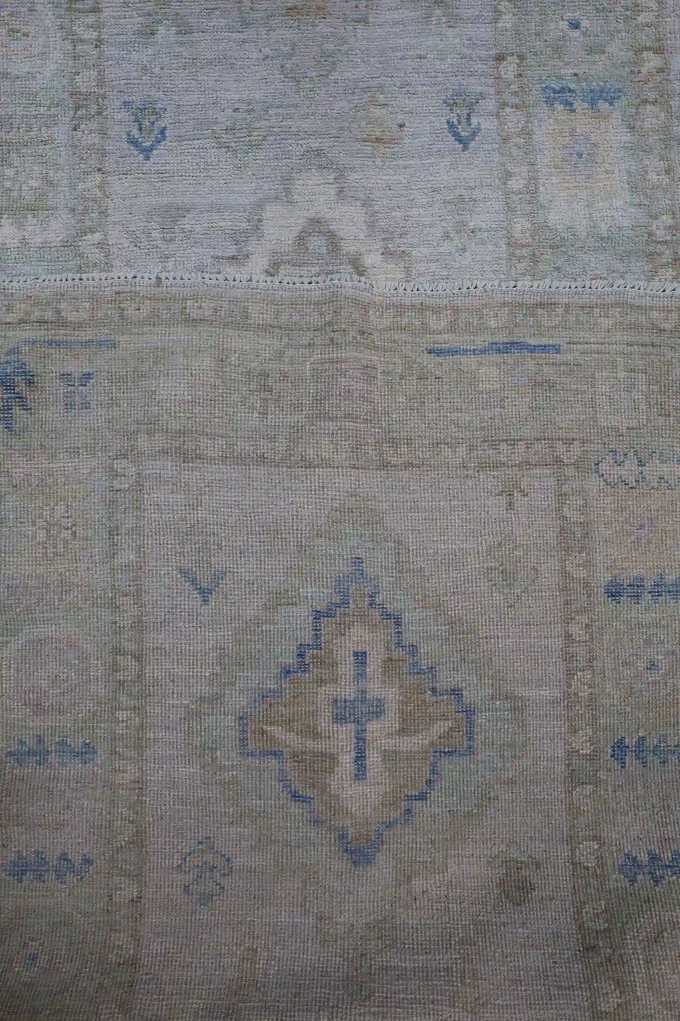 Oushak rugs have a long history dating back to the Ottoman period in Turkey, known for their large-scale patterns and gentle color ways that create a sense of calm and openness. This modern Afghan-made version follows that tradition closely but uses a lighter, more contemporary palette with gentle distressing for an aged, lived-in appearance. The hand-knotting process results in a sturdy yet soft pile that holds up well over time.