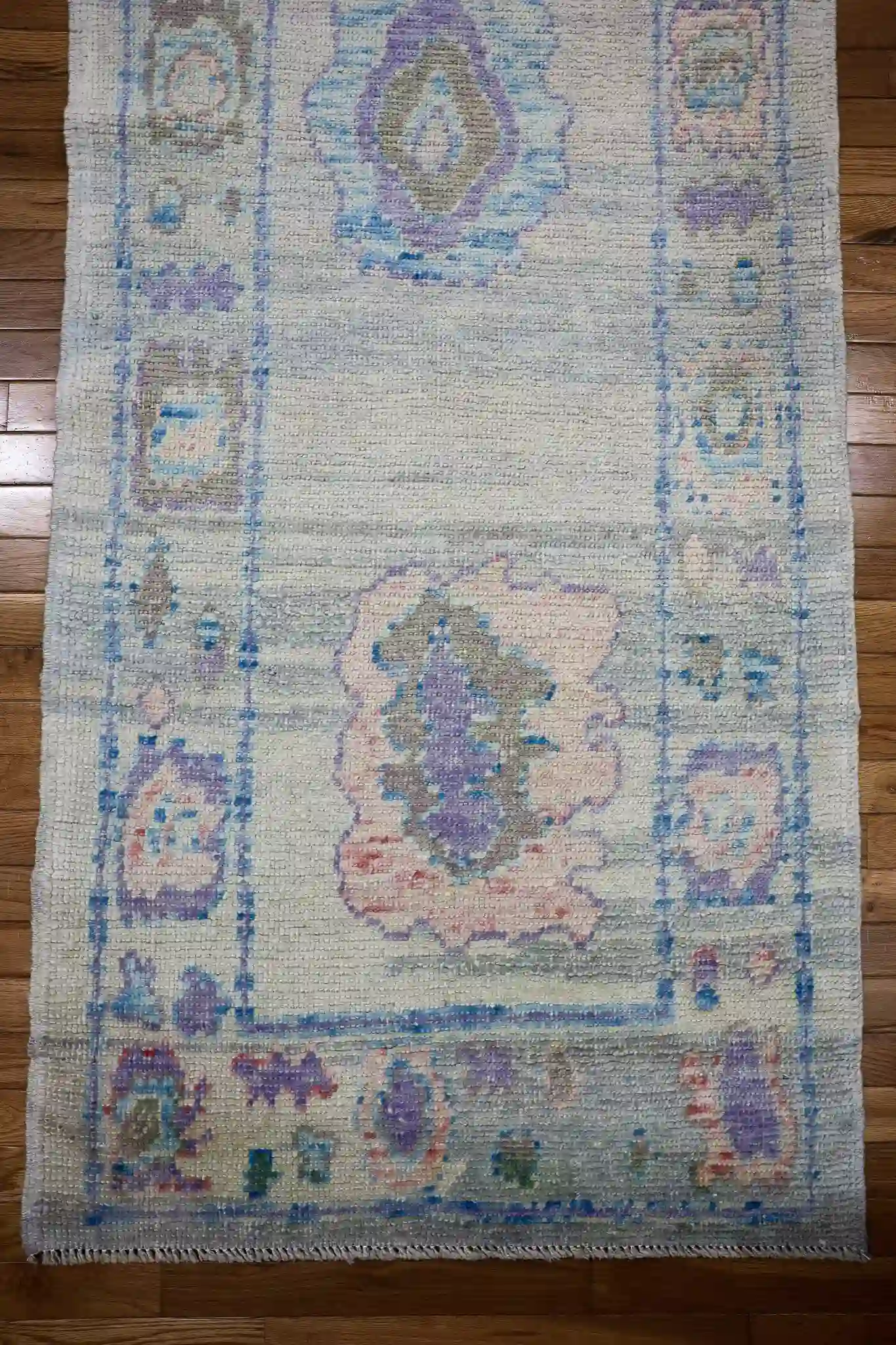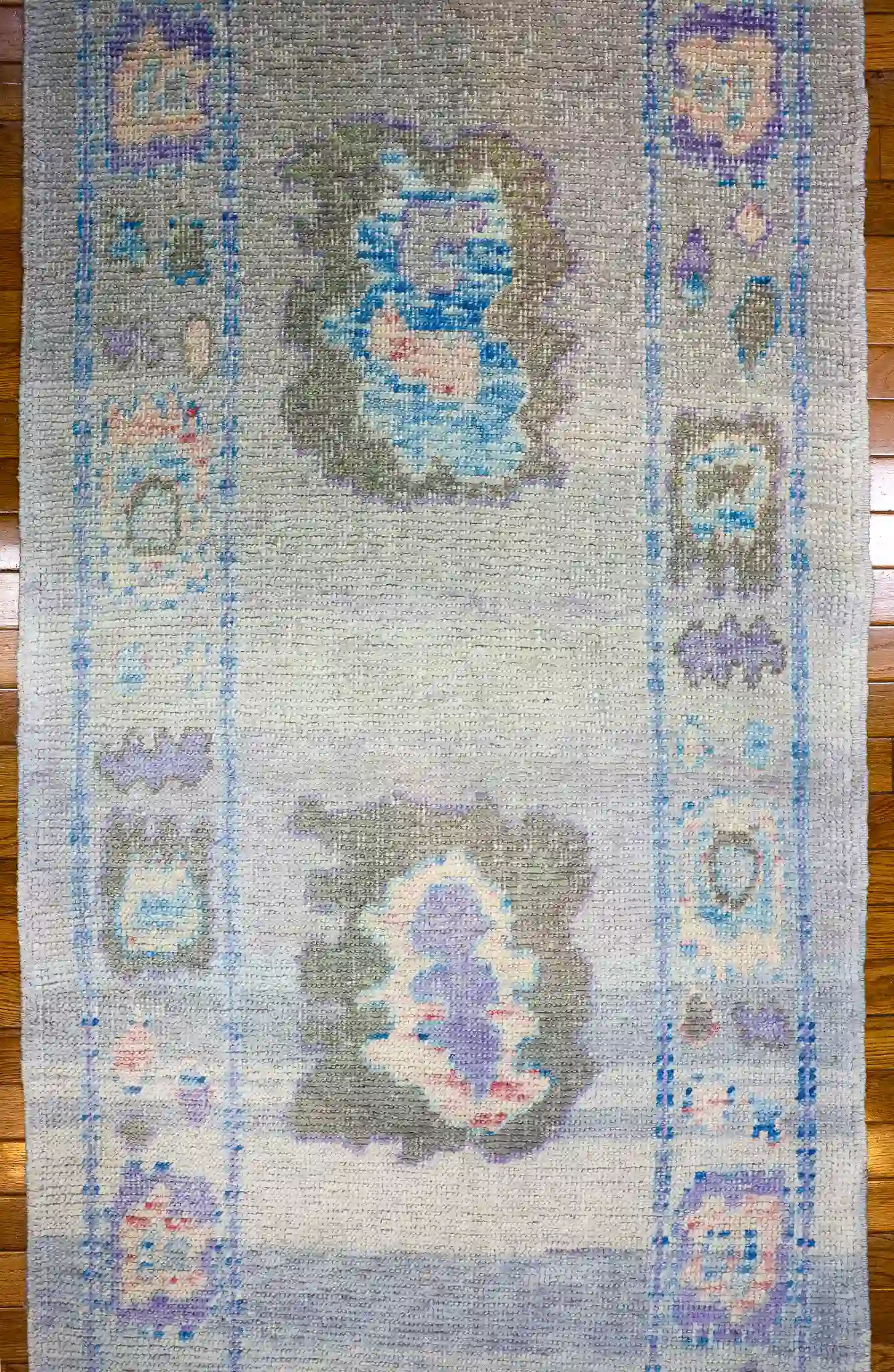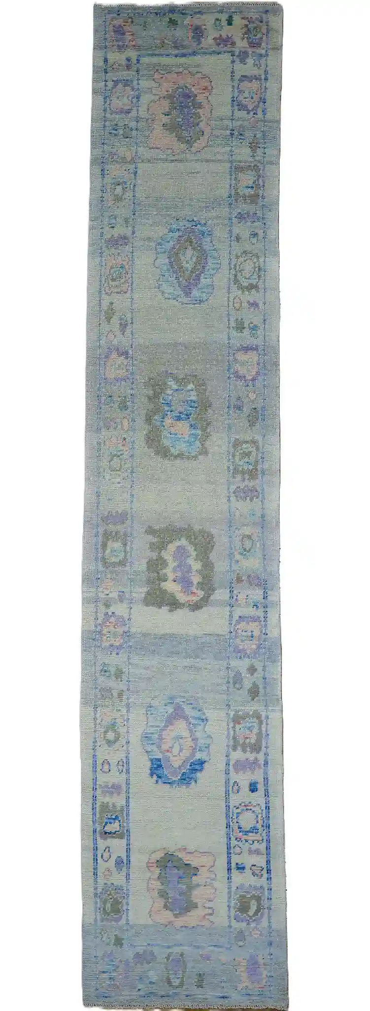This new Turkish Oushak runner presents a repeating central design of large medallions connected by flowing vines, each medallion filled with layered floral rosettes and small geometric details in lavender and peach. The light blue field allows the motifs to stand out gently, while the side borders feature continuous scrollwork, small blossoms, and repeating diamond patterns in mint and ivory tones. The washed, soft edges and color blending create a peaceful, vintage-inspired flow along the entire length.