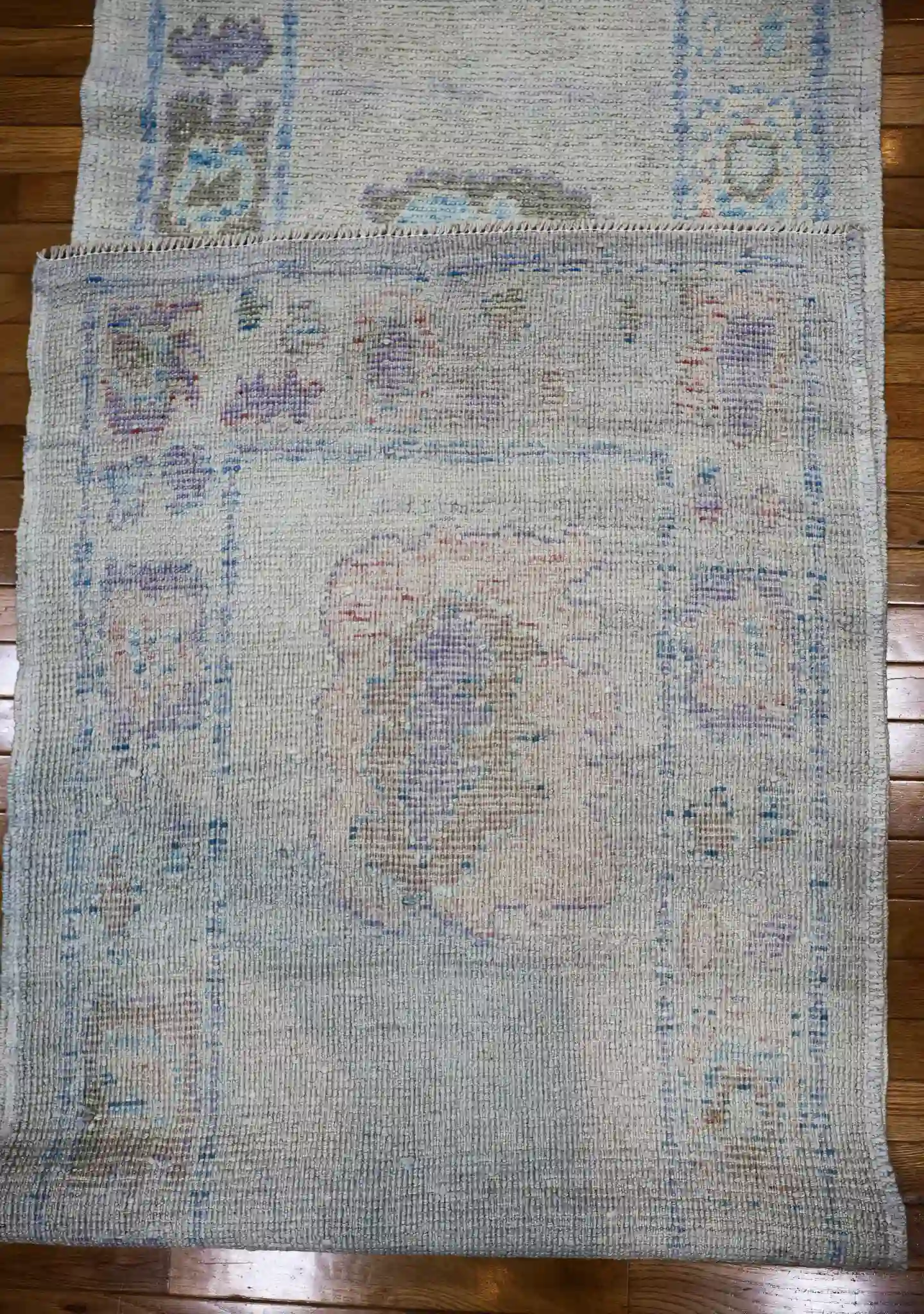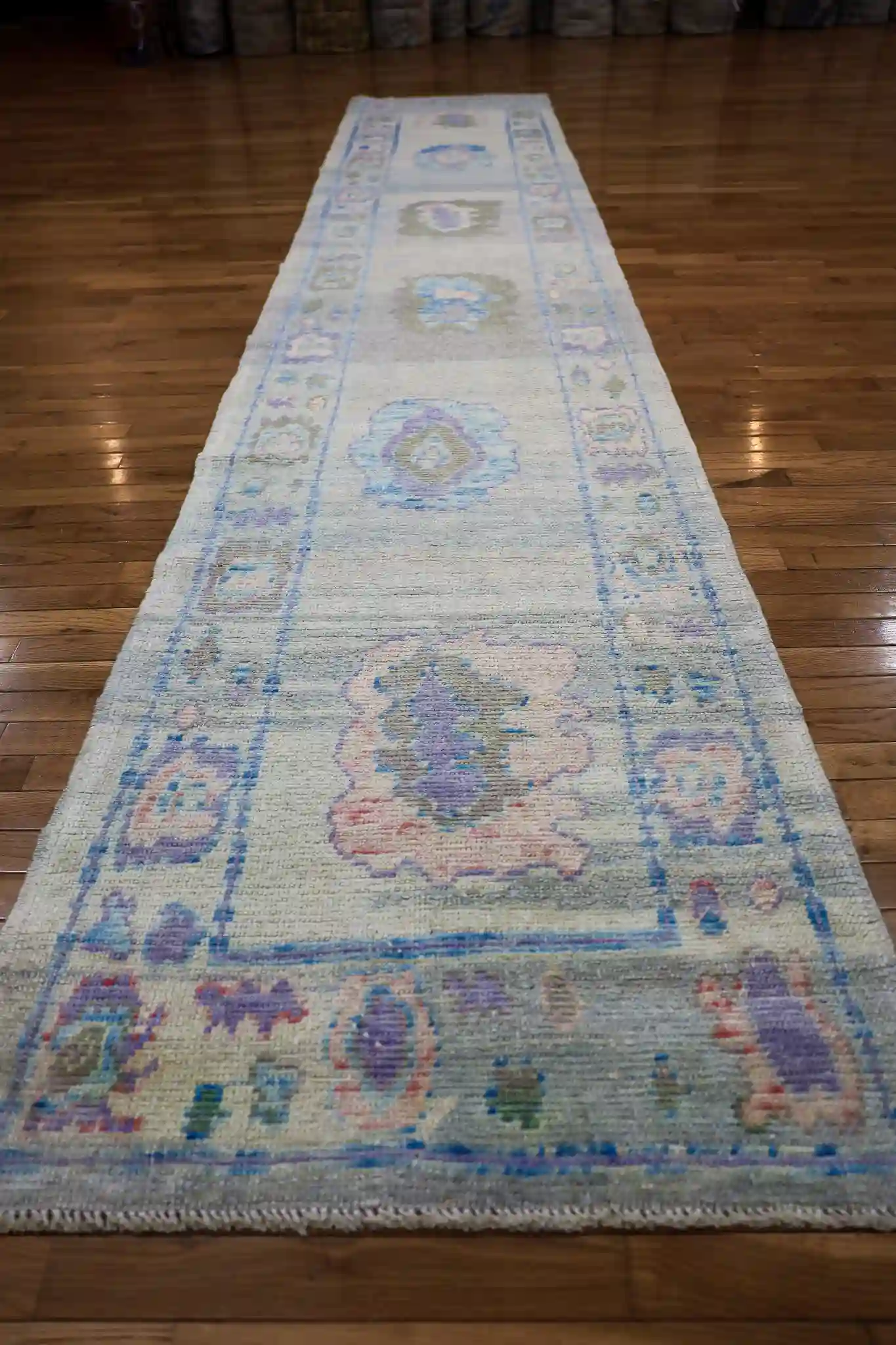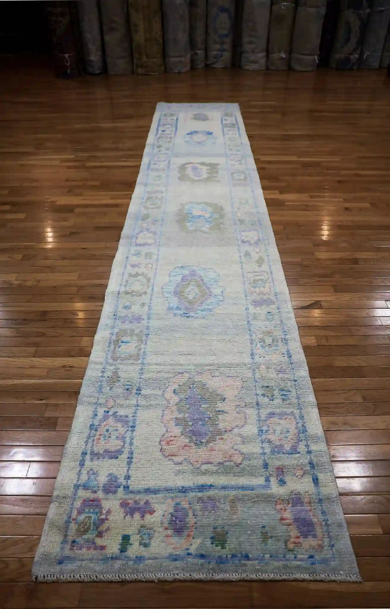 This new Turkish Oushak runner presents a repeating central design of large medallions connected by flowing vines, each medallion filled with layered floral rosettes and small geometric details in lavender and peach. The light blue field allows the motifs to stand out gently, while the side borders feature continuous scrollwork, small blossoms, and repeating diamond patterns in mint and ivory tones. The washed, soft edges and color blending create a peaceful, vintage-inspired flow along the entire length.
