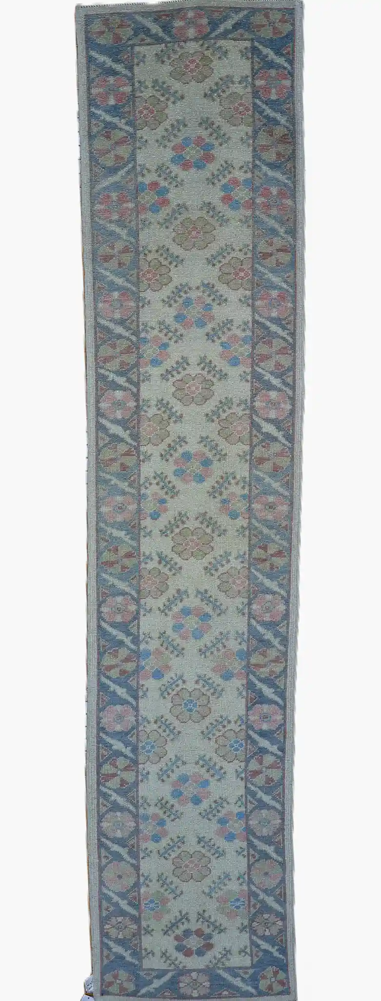 This long Turkish Oushak runner features a delicate repeating floral lattice pattern across a serene light blue ground. Small four-petaled flowers in soft pink, green, and coral are arranged in neat rows, connected by thin vines and tiny geometric elements. The wide border displays larger stylized blossoms and leaves in the same gentle palette, framed by narrow guard borders for a clean, balanced finish.