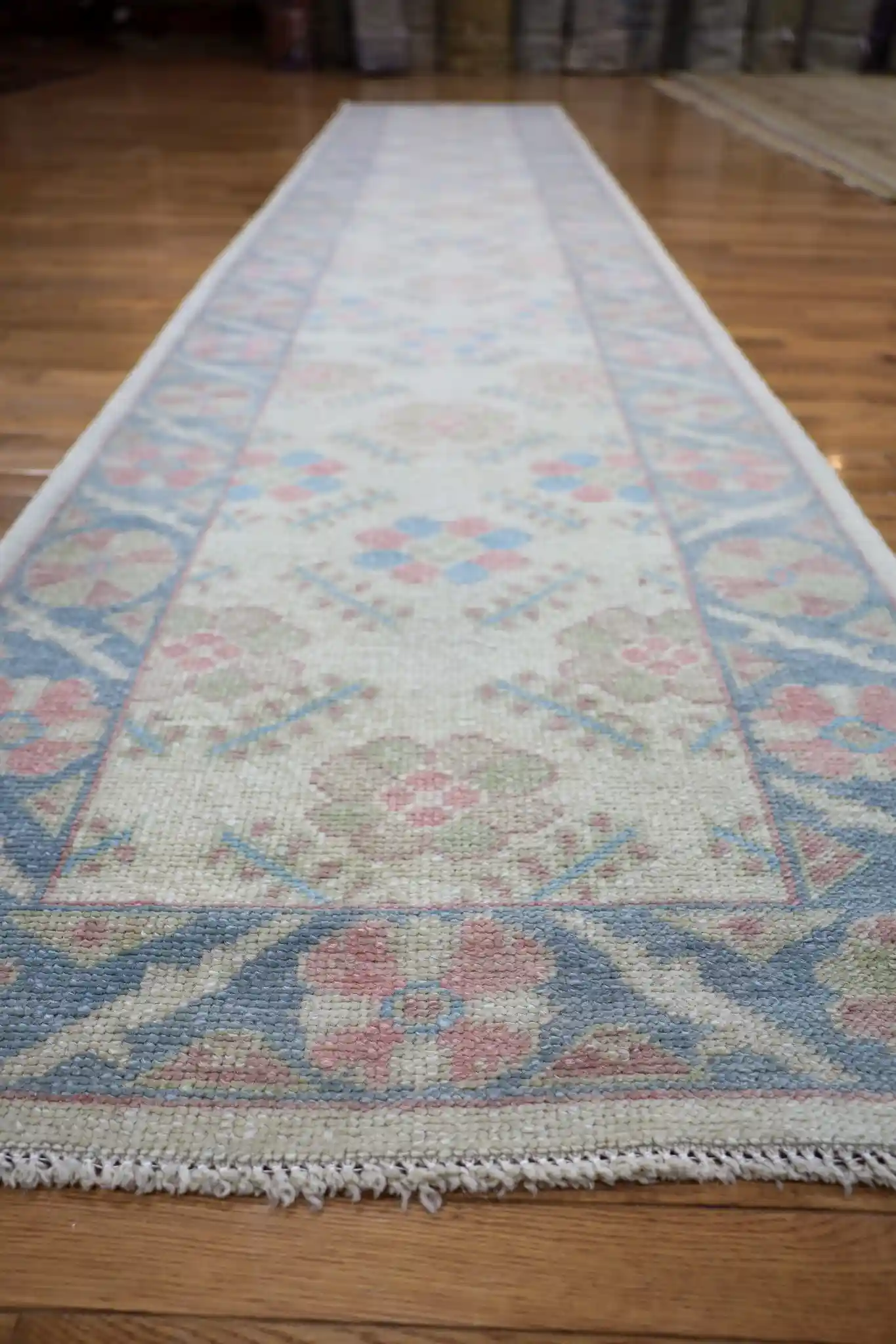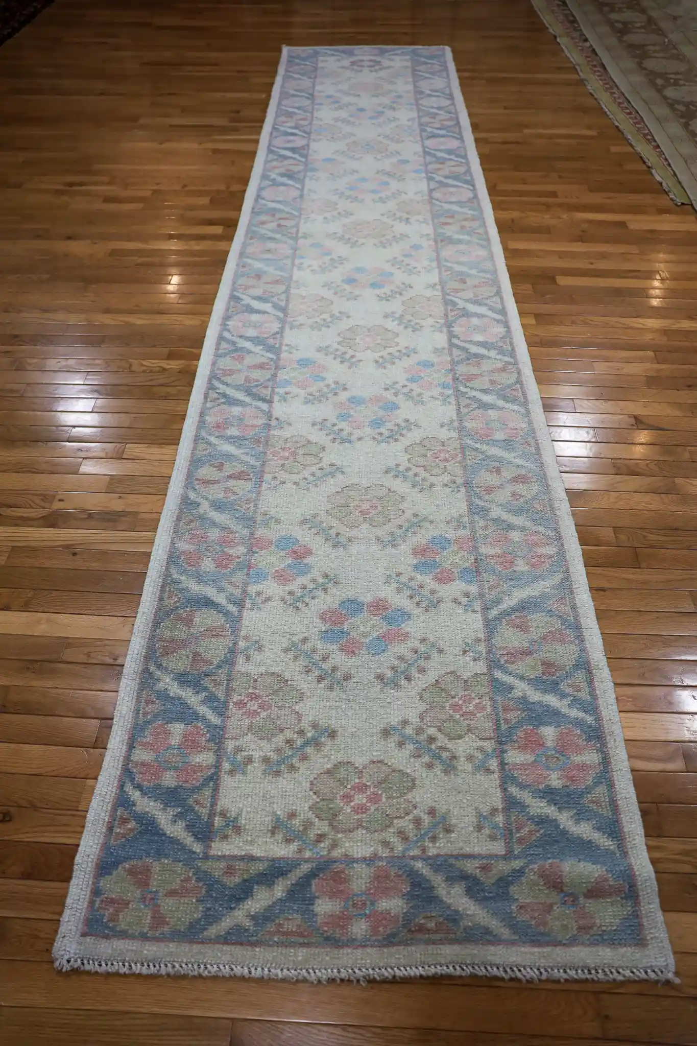 The wool is finely spun with a low to medium pile, creating a smooth, comfortable surface that’s durable for hallway use. This narrow runner format is ideal for long corridors, gallery spaces, or beside kitchen islands where a subtle pop of color and pattern is desired without dominating the floor. The pale blue base brings a calming, spacious feel to any narrow area, and the faded floral motifs add understated charm. Regular vacuuming and spot cleaning as needed will keep the soft colors looking fresh.