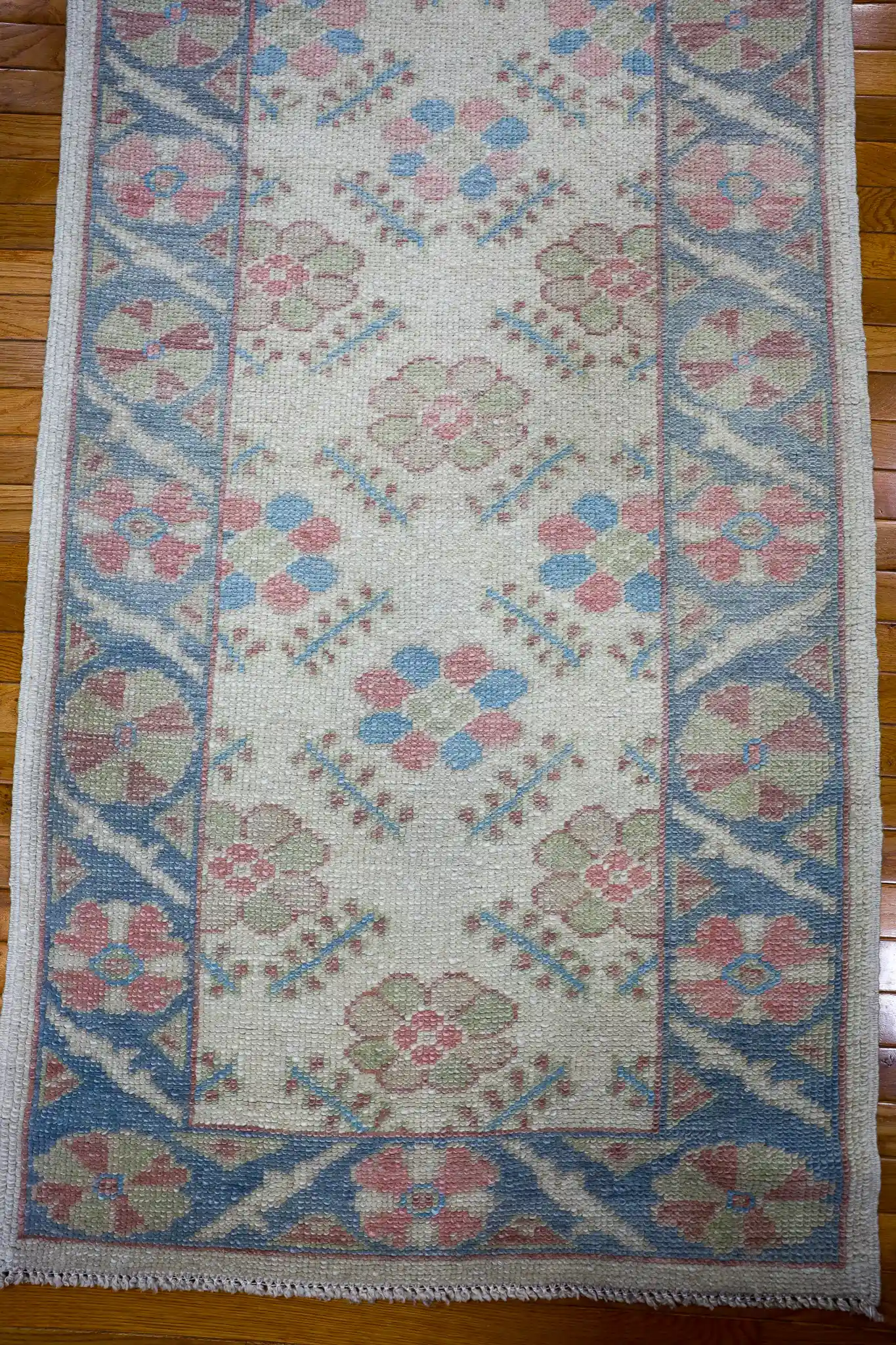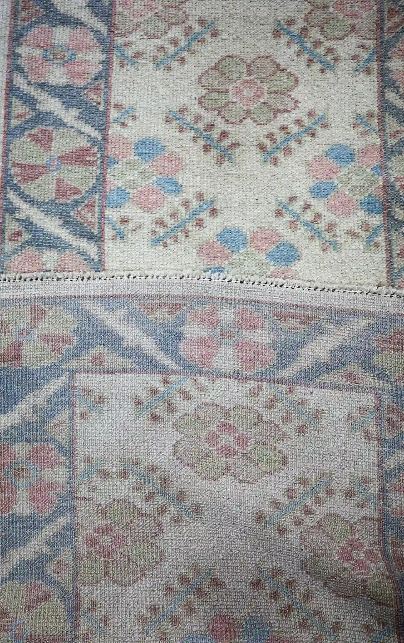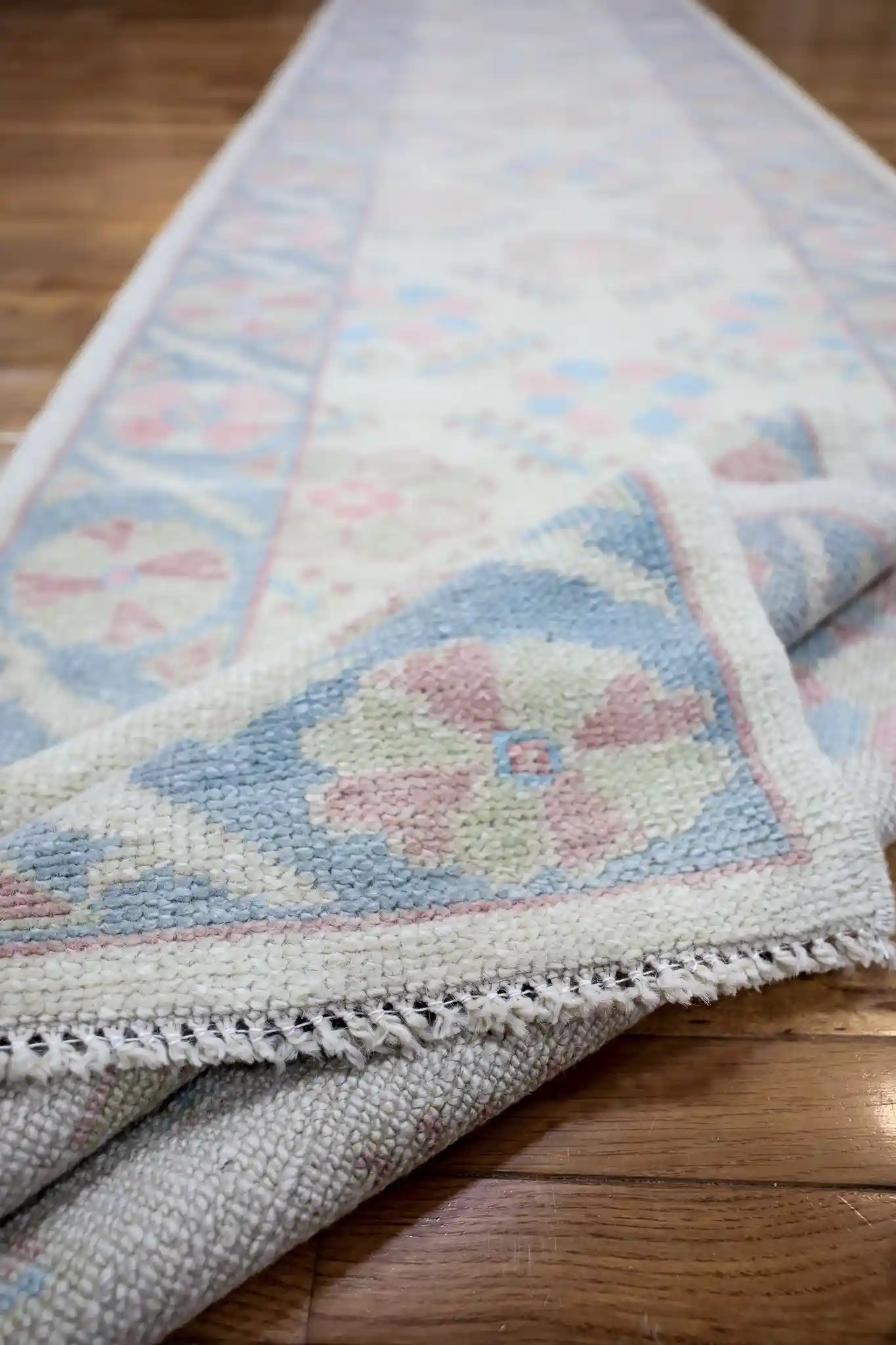 Oushak rugs from western Turkey have been woven since the 16th century, originally for Ottoman courts with large-scale medallions and rich colors. Over time, especially in the 20th century, weavers shifted toward softer, pastel tones and more open, repeating designs like this one, influenced by European tastes and lighter interiors. The result is an airy, elegant style that feels timeless yet fresh.