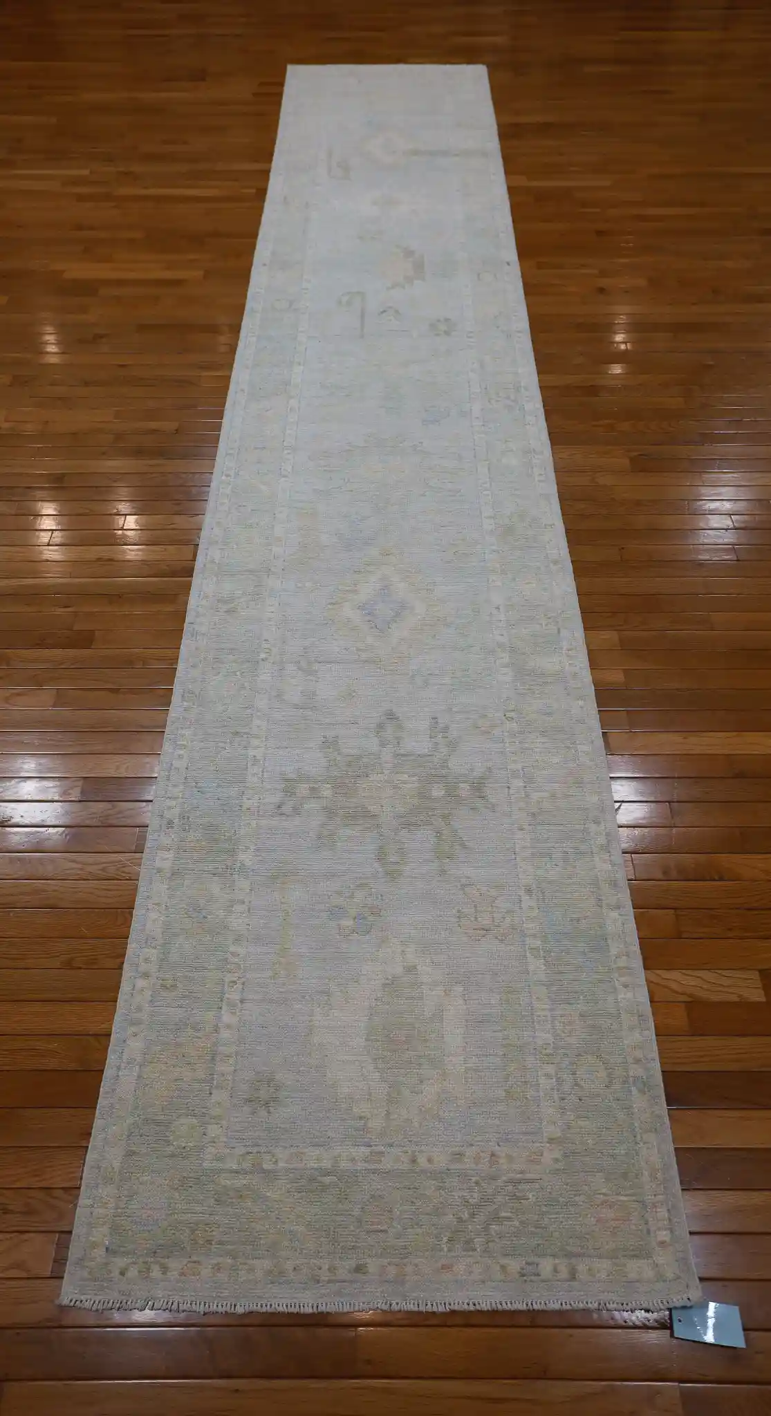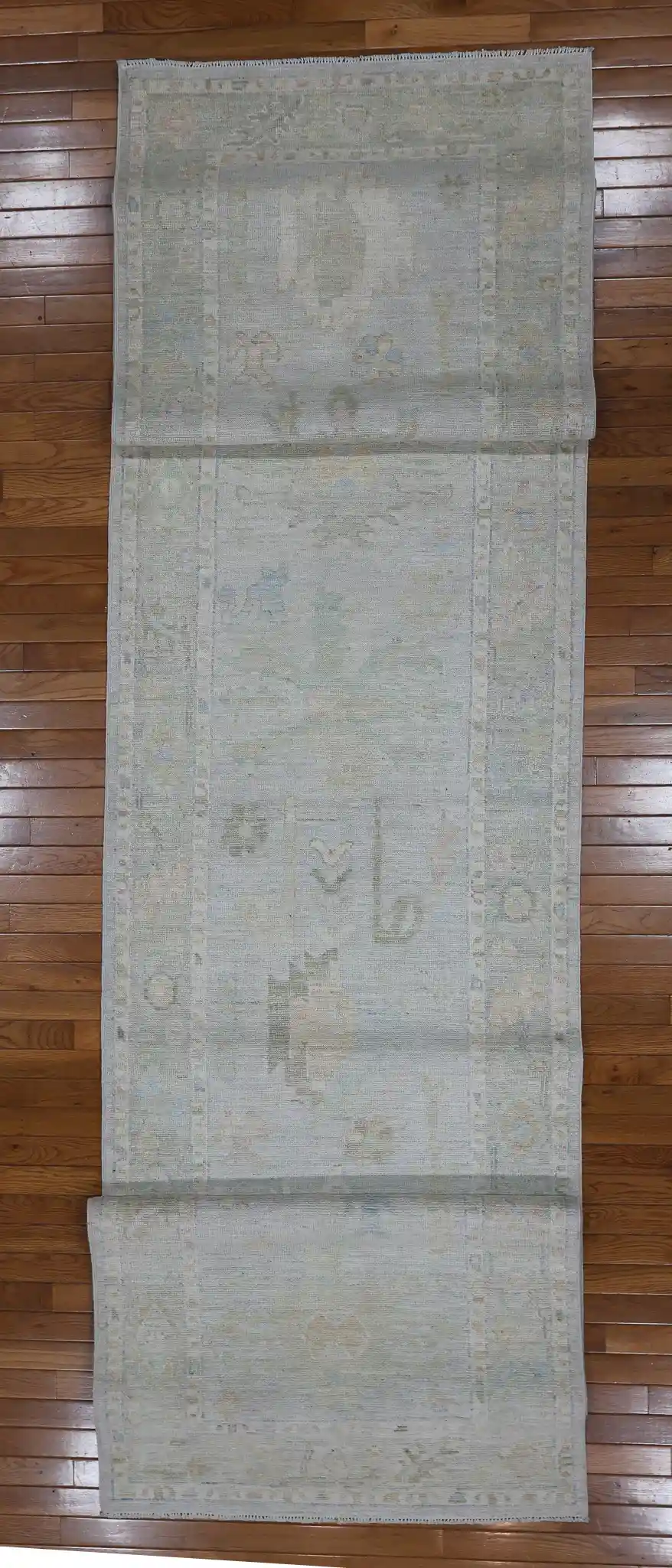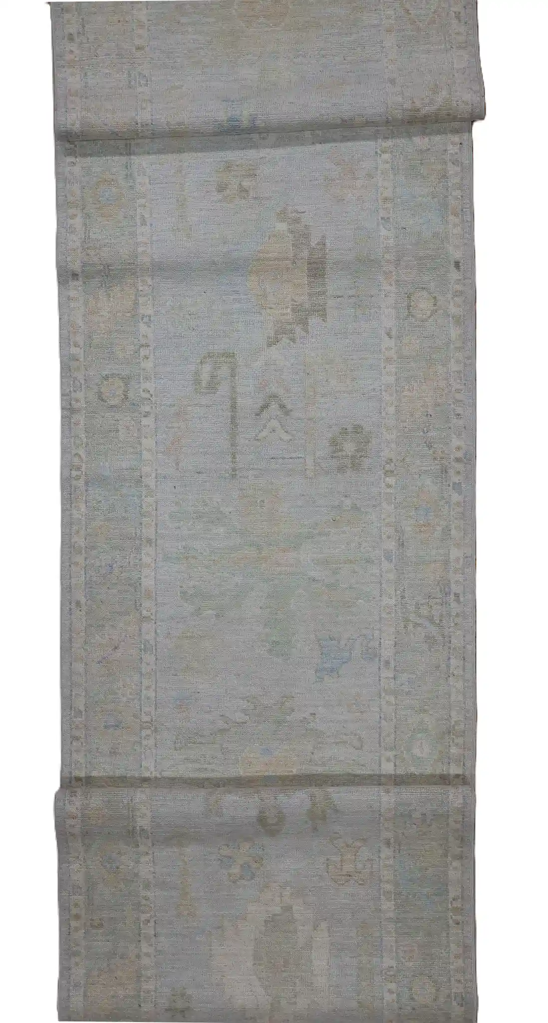 This long runner rug displays the classic Oushak style with its open, airy composition and large-scale motifs. The main field features scattered floral elements, vines, and small medallions in gentle, distressed tones against the pale blue-gray background, giving it a soft vintage appearance. The border includes repeating flower and leaf designs that frame the piece nicely.