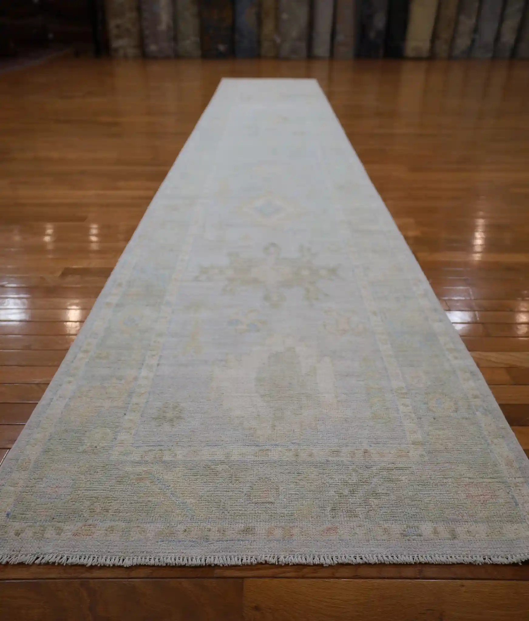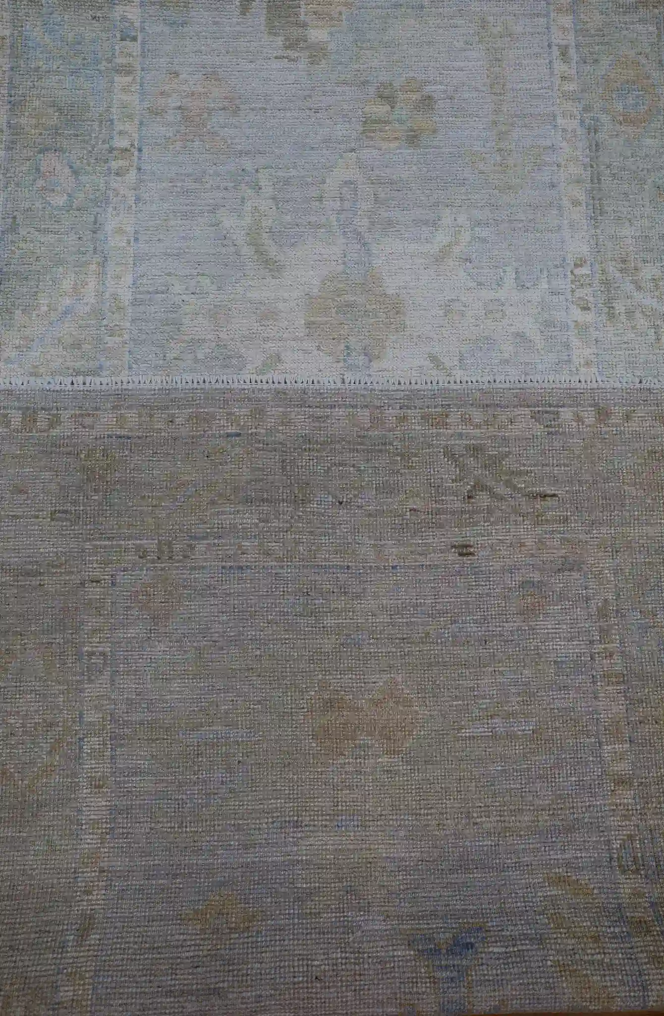 Oushak rugs originally come from the town of Uşak in Turkey, where they were produced as early as the 15th century for Ottoman palaces and European nobility. Modern versions like this one are hand-knotted in Afghanistan using the same traditional techniques, often with softer color palettes and a slightly more relaxed feel. Afghan weavers have adapted the style, keeping the large open spaces and flowing patterns that make Oushak rugs feel light and elegant.