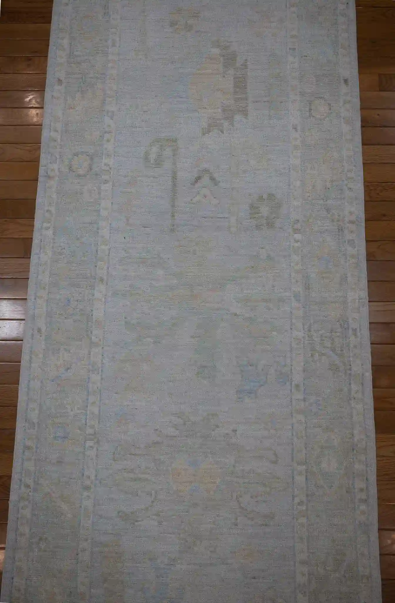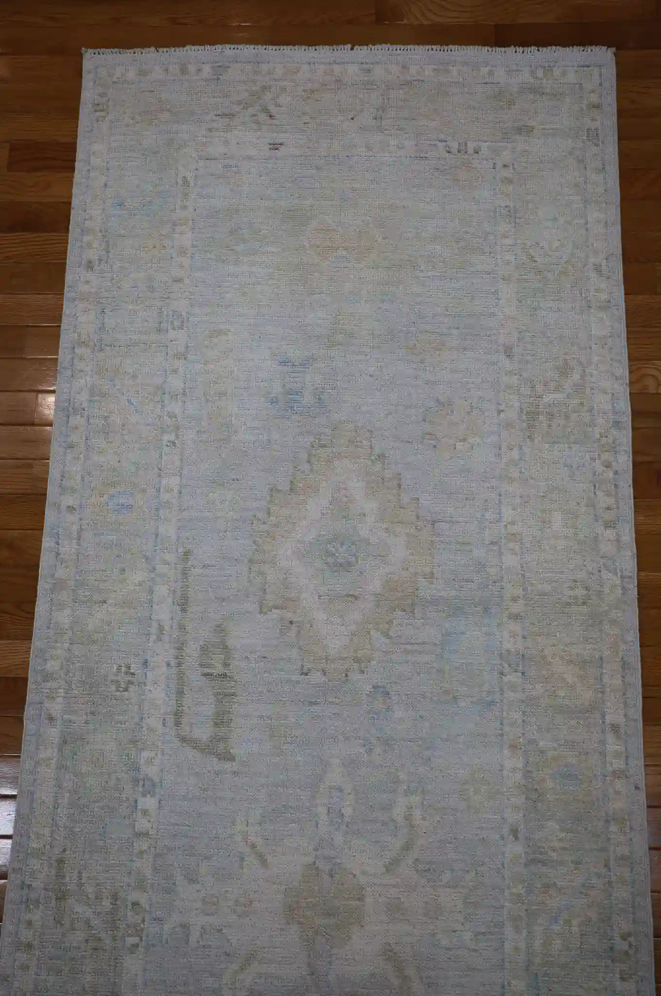 The wool pile is medium and durable, suitable for hallways, entryways, or long corridors with moderate foot traffic. Its muted tones make it easy to pair with neutral furniture, light wood floors, or coastal and farmhouse decor. The distressed look adds character without being too bold, and the hand-knotted construction ensures it will last for years with proper care.