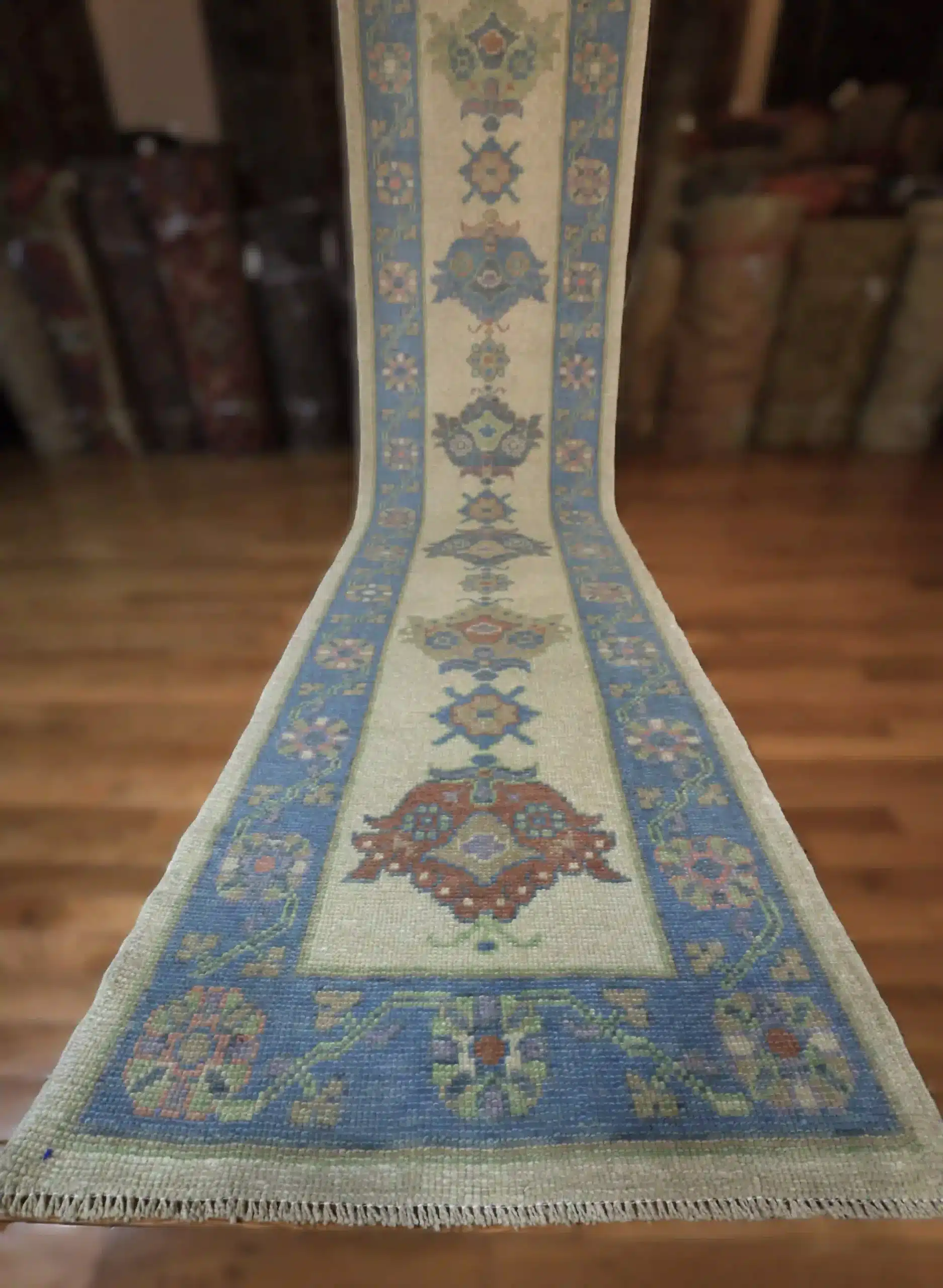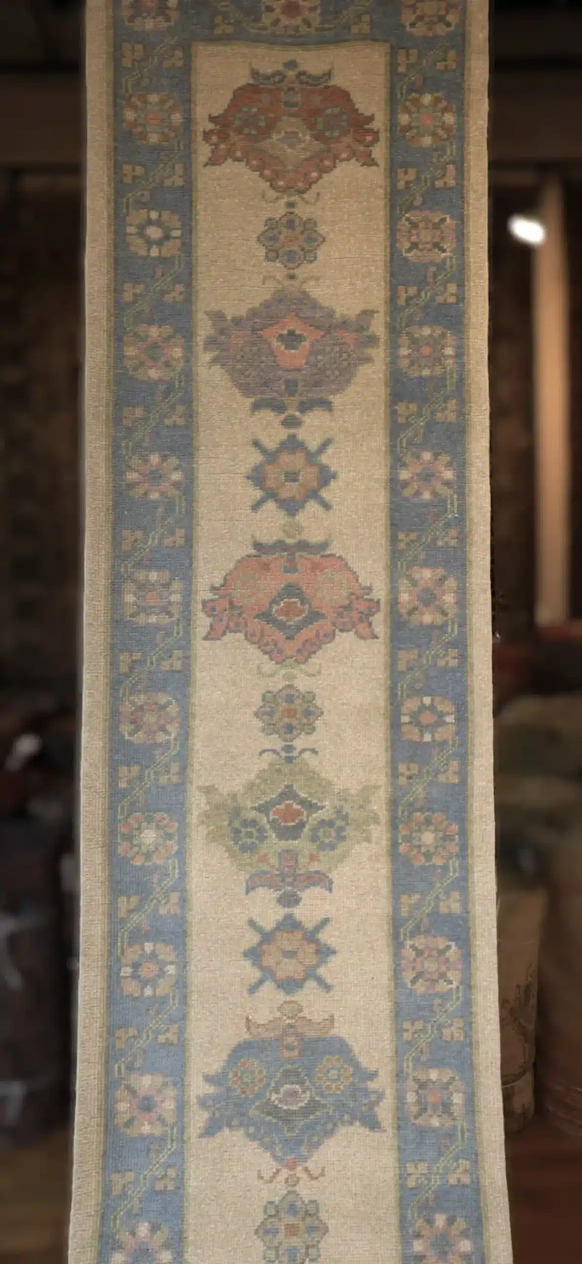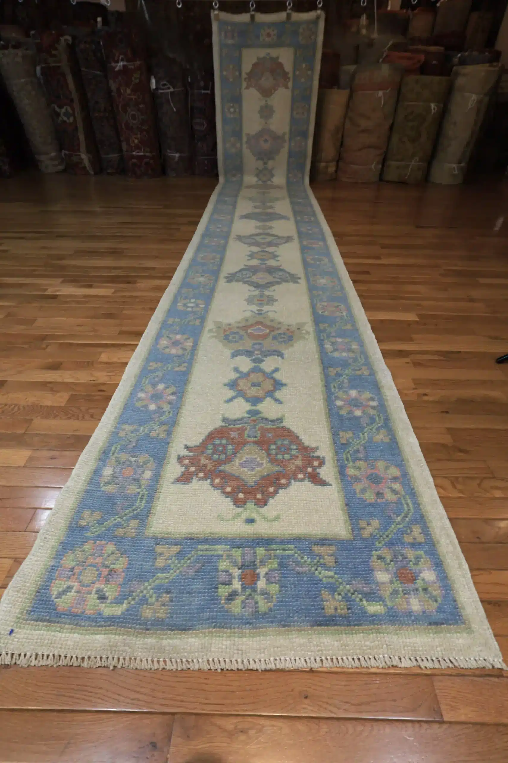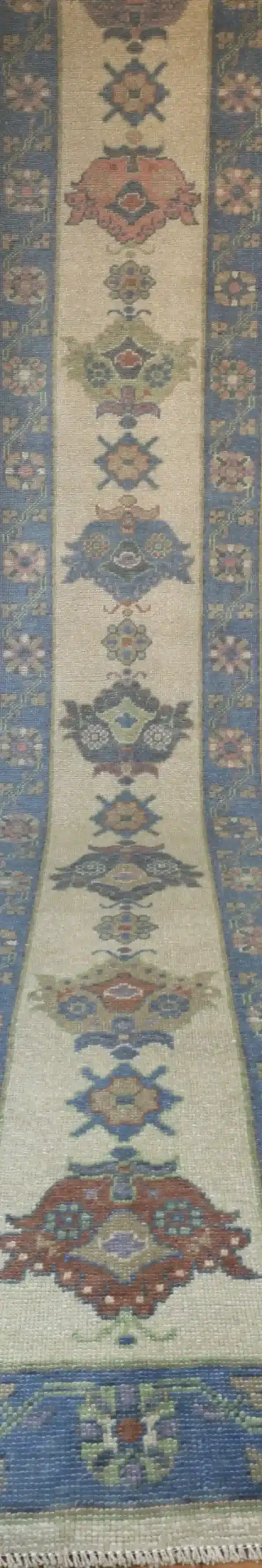 Oushak runners like this draw from Turkish village traditions, where weavers create narrow pieces with repeating classical motifs scaled for hallways and corridors. The hand-knotted wool technique ensures tight, even knots that keep the details crisp, and the light color scheme gives a fresh, contemporary twist to traditional elements. Abrash variations in the blue borders add natural character without overpowering the simplicity.