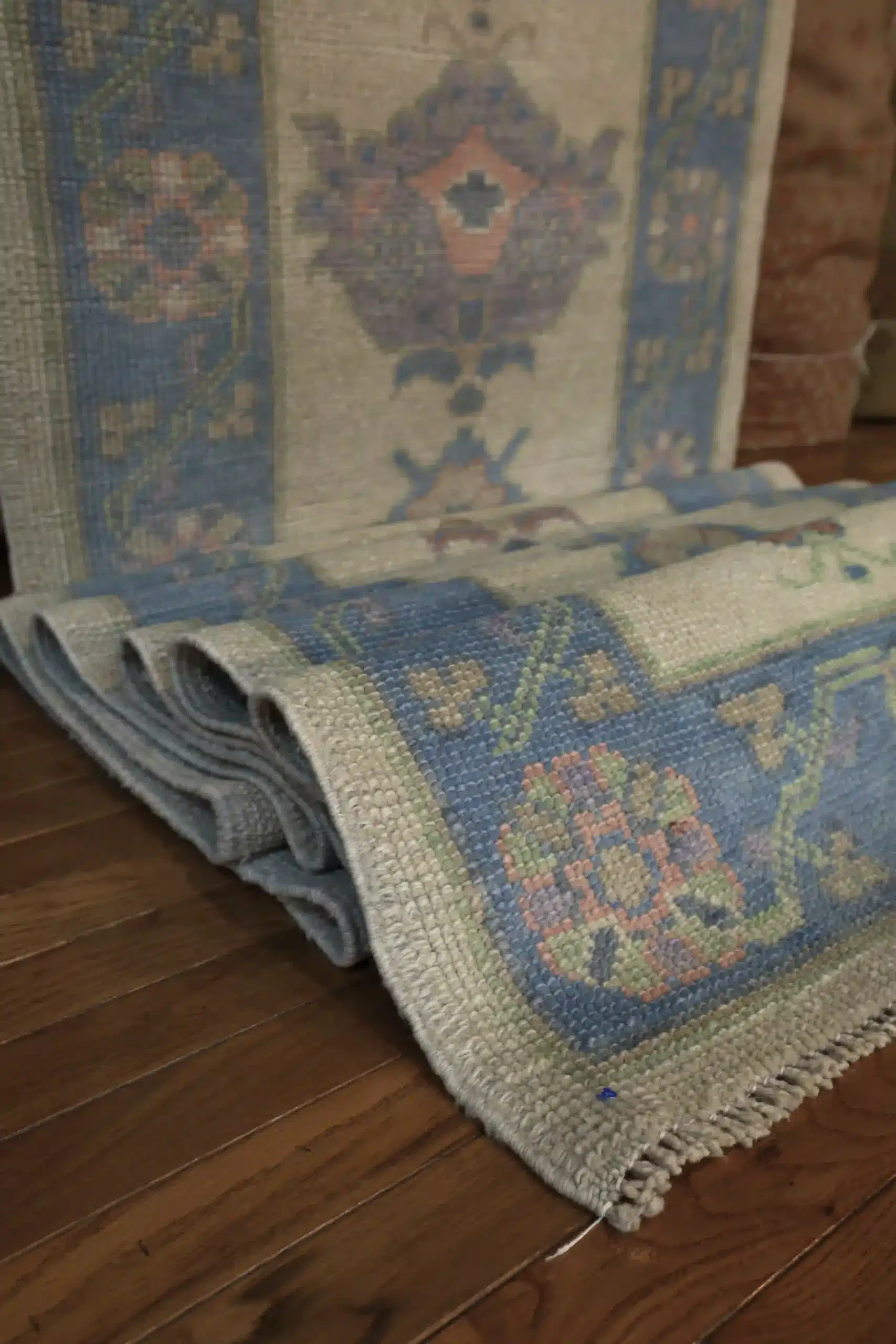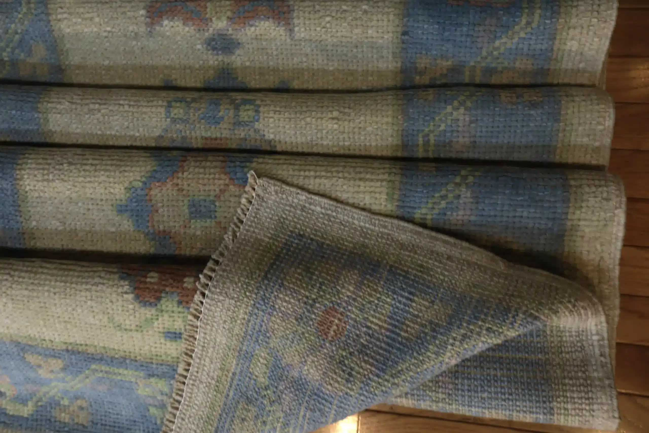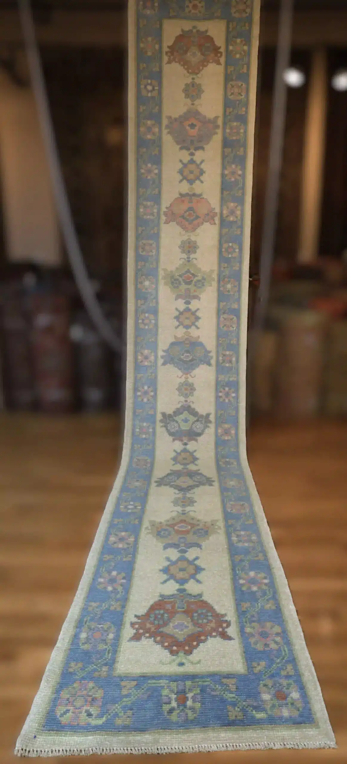 Oushak runners like this draw from Turkish village traditions, where weavers create narrow pieces with repeating classical motifs scaled for hallways and corridors. The hand-knotted wool technique ensures tight, even knots that keep the details crisp, and the light color scheme gives a fresh, contemporary twist to traditional elements. Abrash variations in the blue borders add natural character without overpowering the simplicity.