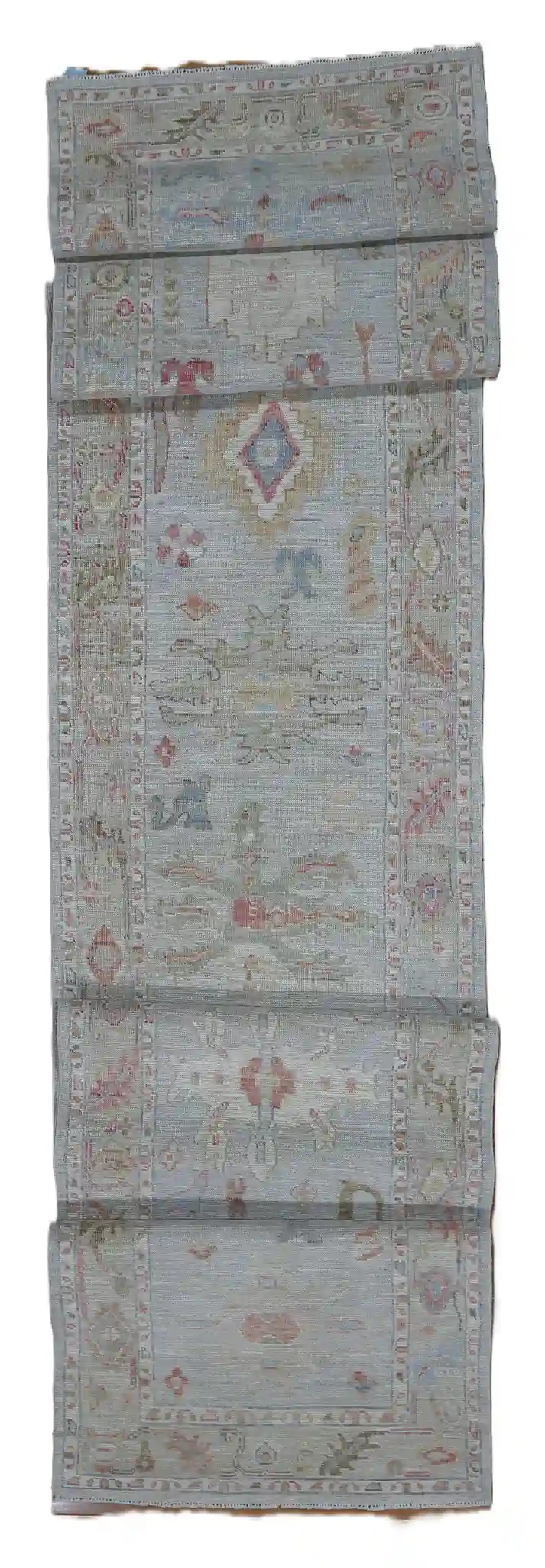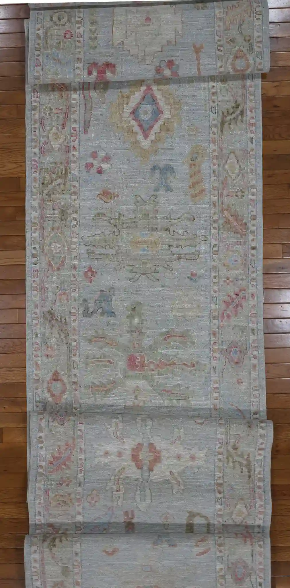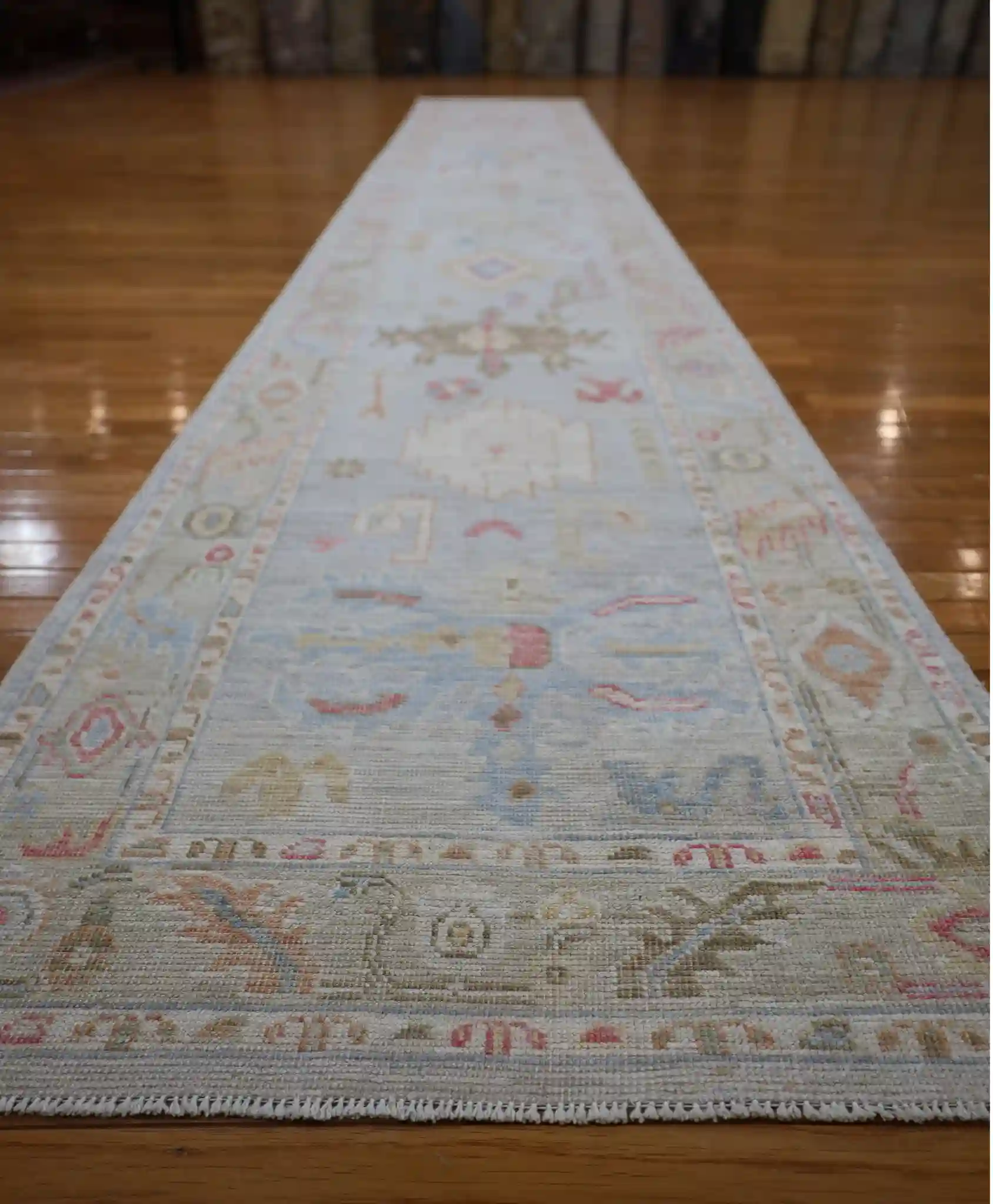 The wool pile offers solid durability for busy hallways, long entryways, or gallery spaces with regular foot traffic. The light blue-gray base and gentle multicolored accents pair well with modern, bohemian, or traditional interiors, especially those with wood floors or neutral furnishings. Its generous length and lively but not overpowering motifs make it a standout choice for narrow, extended areas.