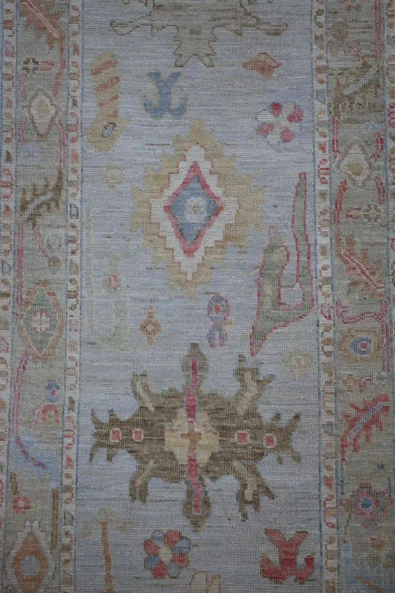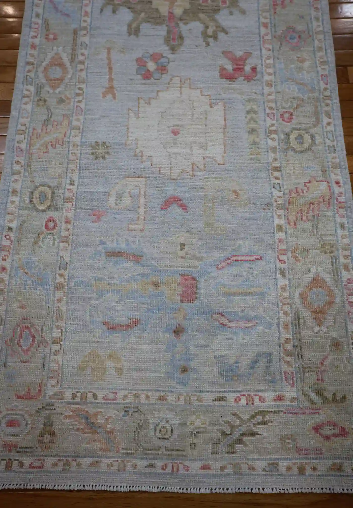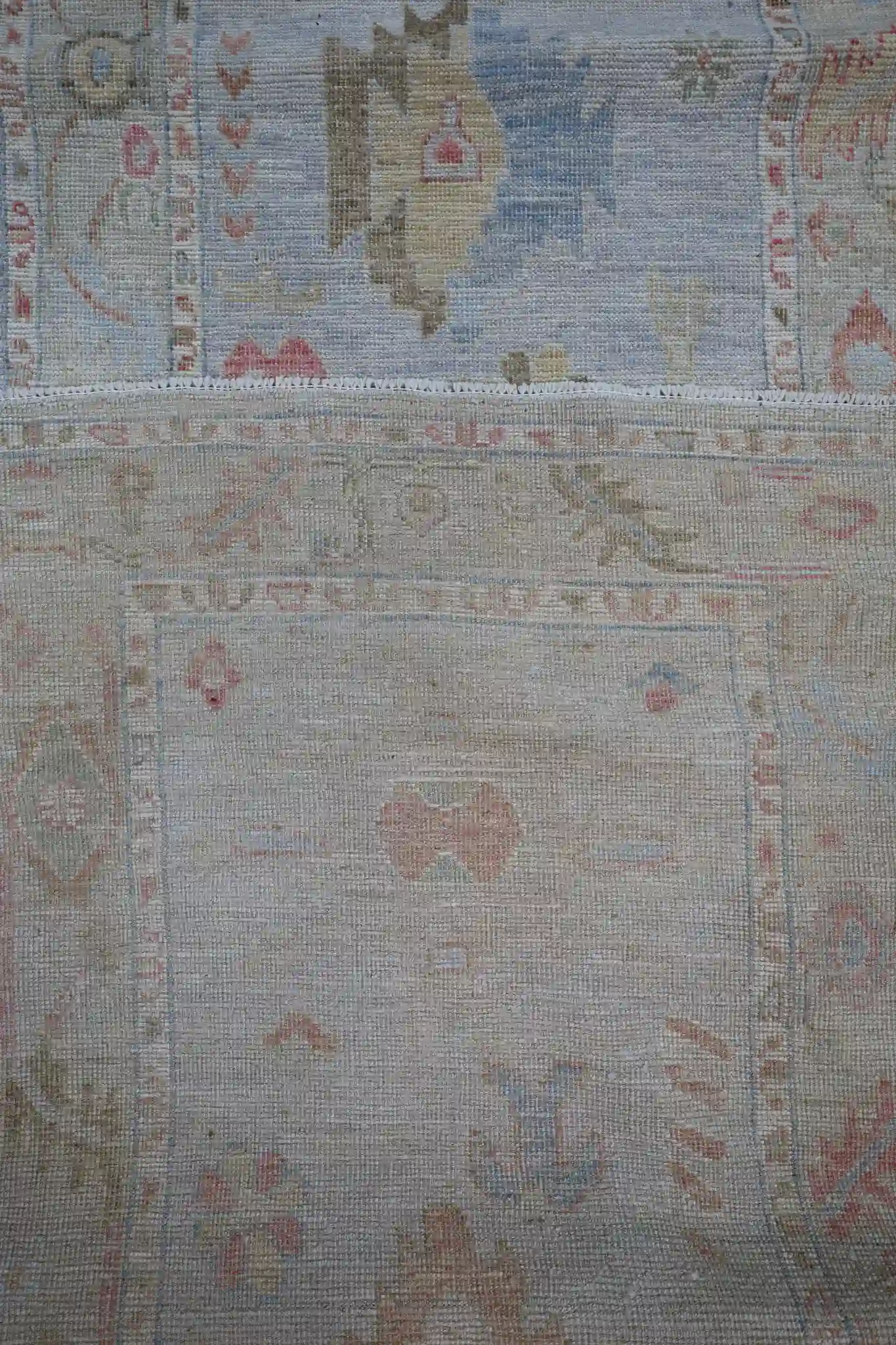 Oushak rugs trace their roots to 16th-century Turkey, where they were valued for their grand scale and harmonious palettes in palace settings. Afghan weavers today recreate this style with their own twist, using softer wool and faded tones to achieve a vintage, relaxed aesthetic. This example shows careful hand-knotting with good density for lasting wear.