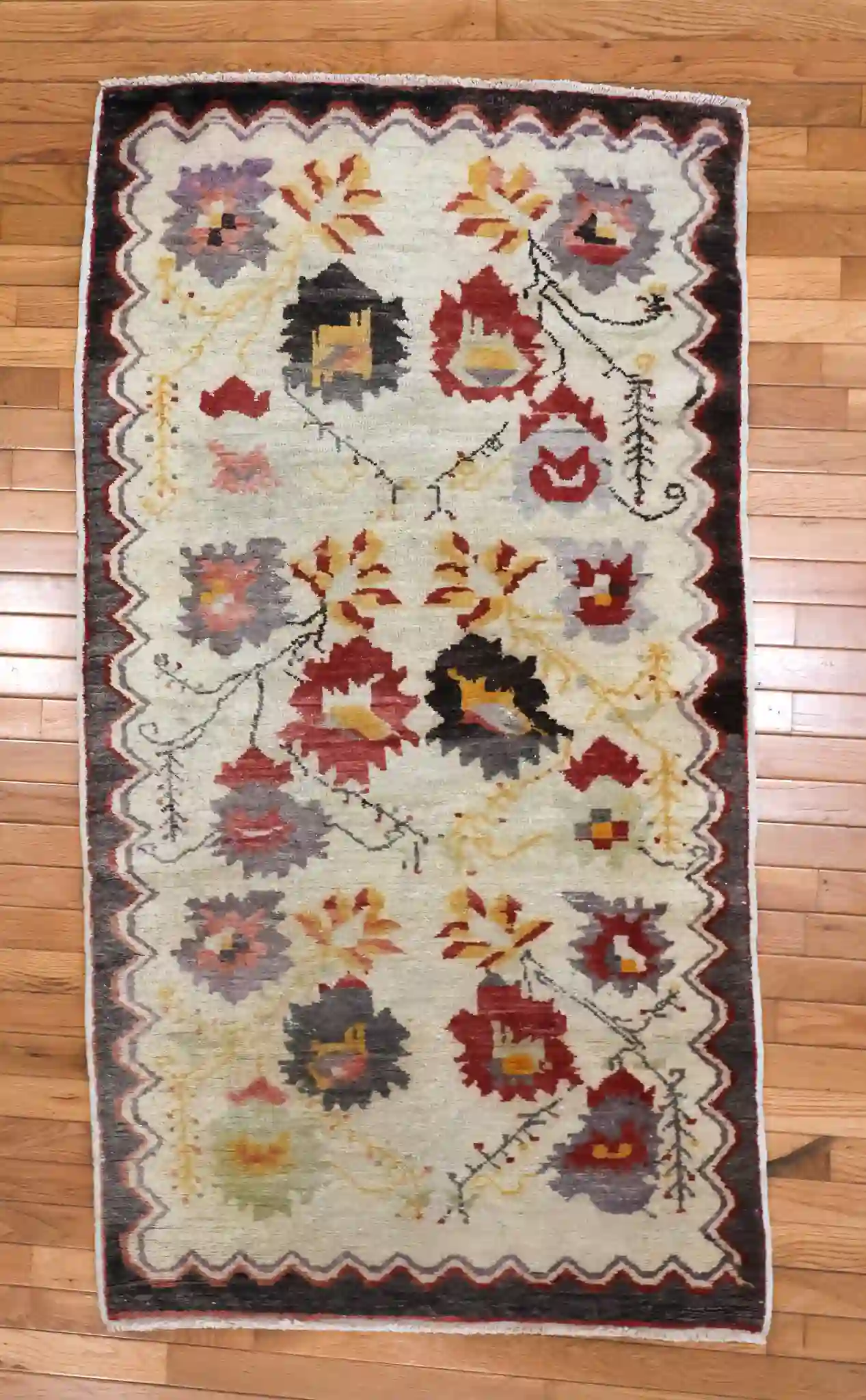 This small vintage Oushak rug features a lively scattered floral design with large blooming flowers, leaves, and vine tendrils spread freely across an open ivory background. The bold blossoms in red, yellow, and lavender connect with thin curving stems, creating an organic, garden-like feel without a strict medallion or border emphasis. A wide wavy scalloped border in dark charcoal frames the field with subtle color echoes, adding playful movement to the composition.