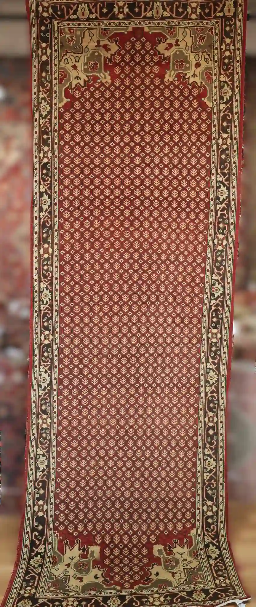 Vintage Oushak runners from the mid-20th century are valued for their light, washed palettes and spacious geometric designs drawn from Anatolian village traditions. Natural fading and abrash in this piece create a soft, lived-in patina, with thick wool pile that has aged gracefully while retaining good structure. The pattern emphasizes bold repetition and open spacing ideal for extended narrow areas.