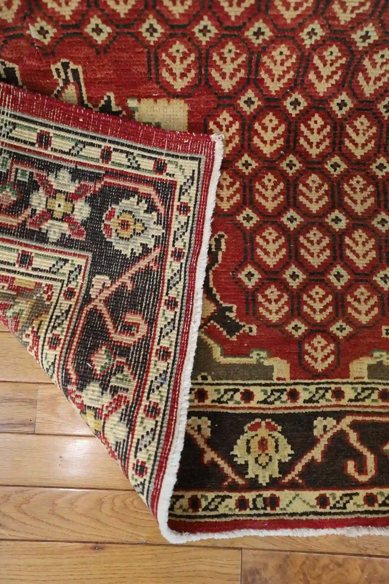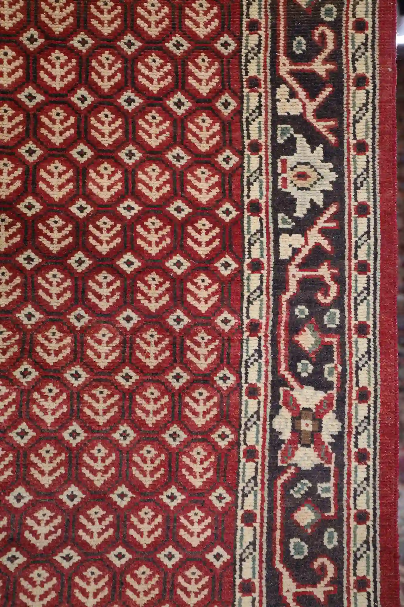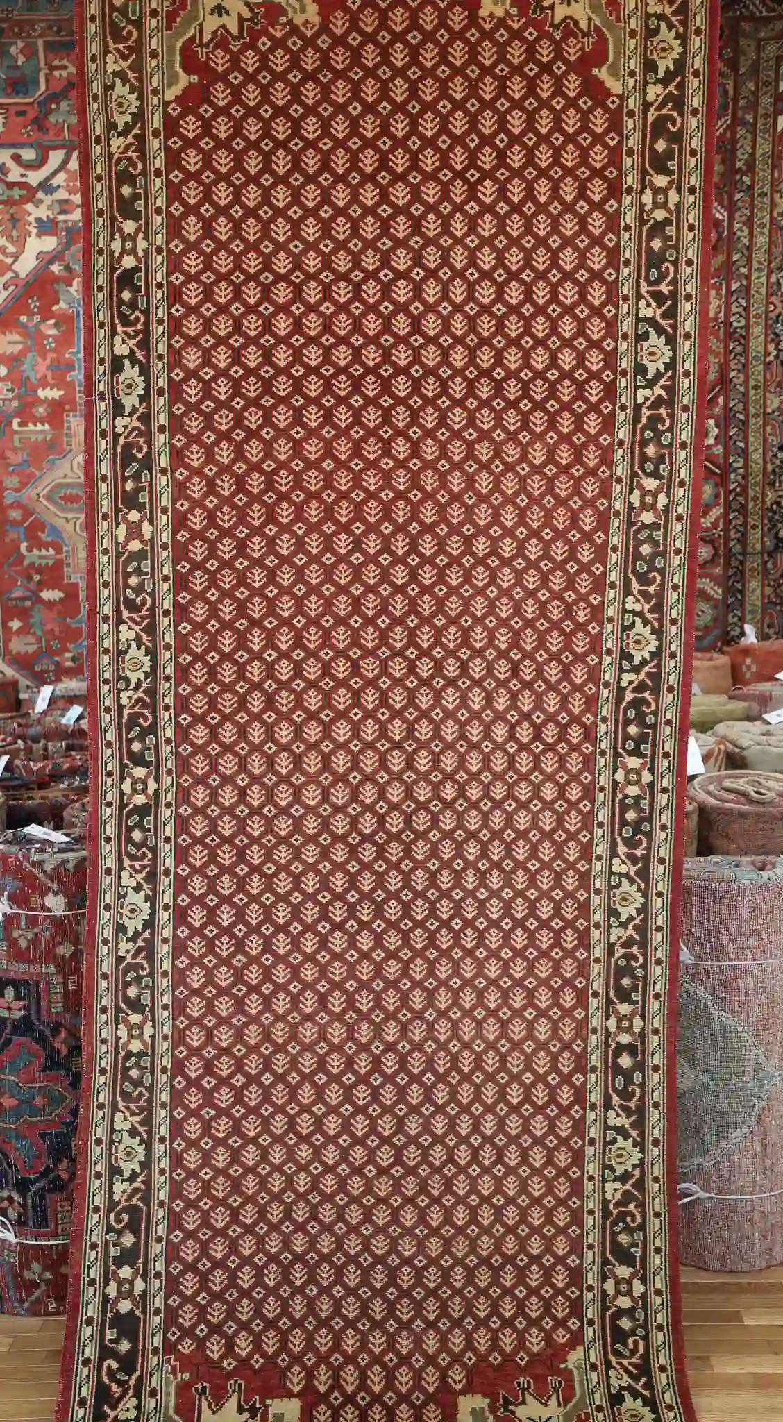 A 4×12 runner fits well in medium-length hallways, entry corridors, or along kitchen islands, providing pattern and protection over a generous stretch. The aged beige with black and terracotta accents complements rustic, industrial, or transitional spaces, grounding the area against wood floors. Wool offers natural cushioning, durability, and easy maintenance through gentle vacuuming to preserve its vintage character.