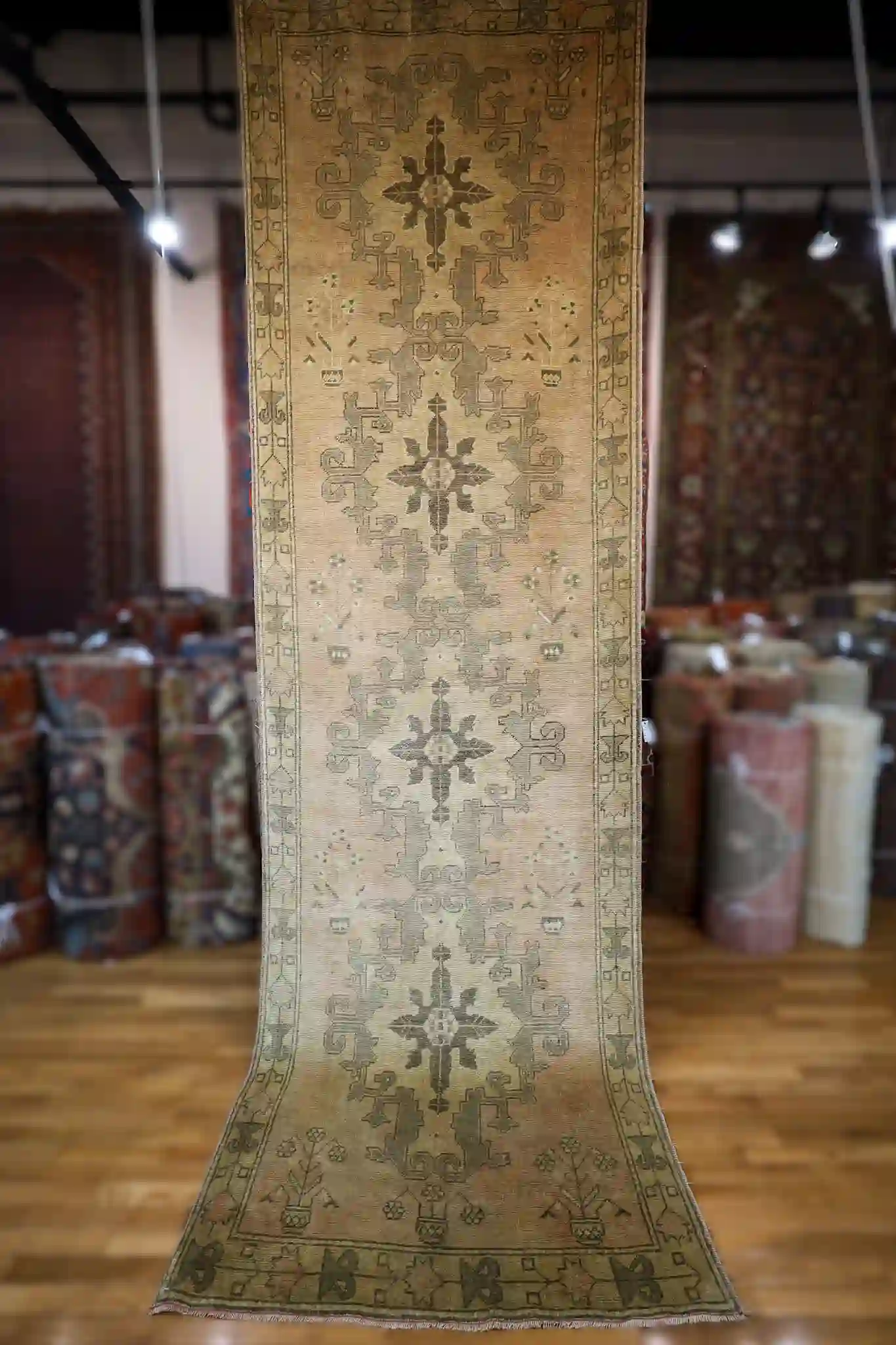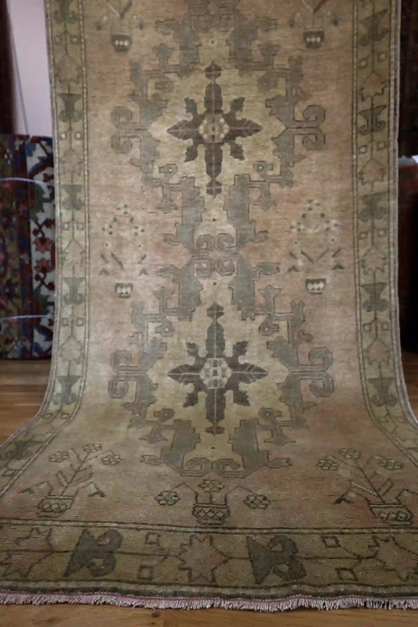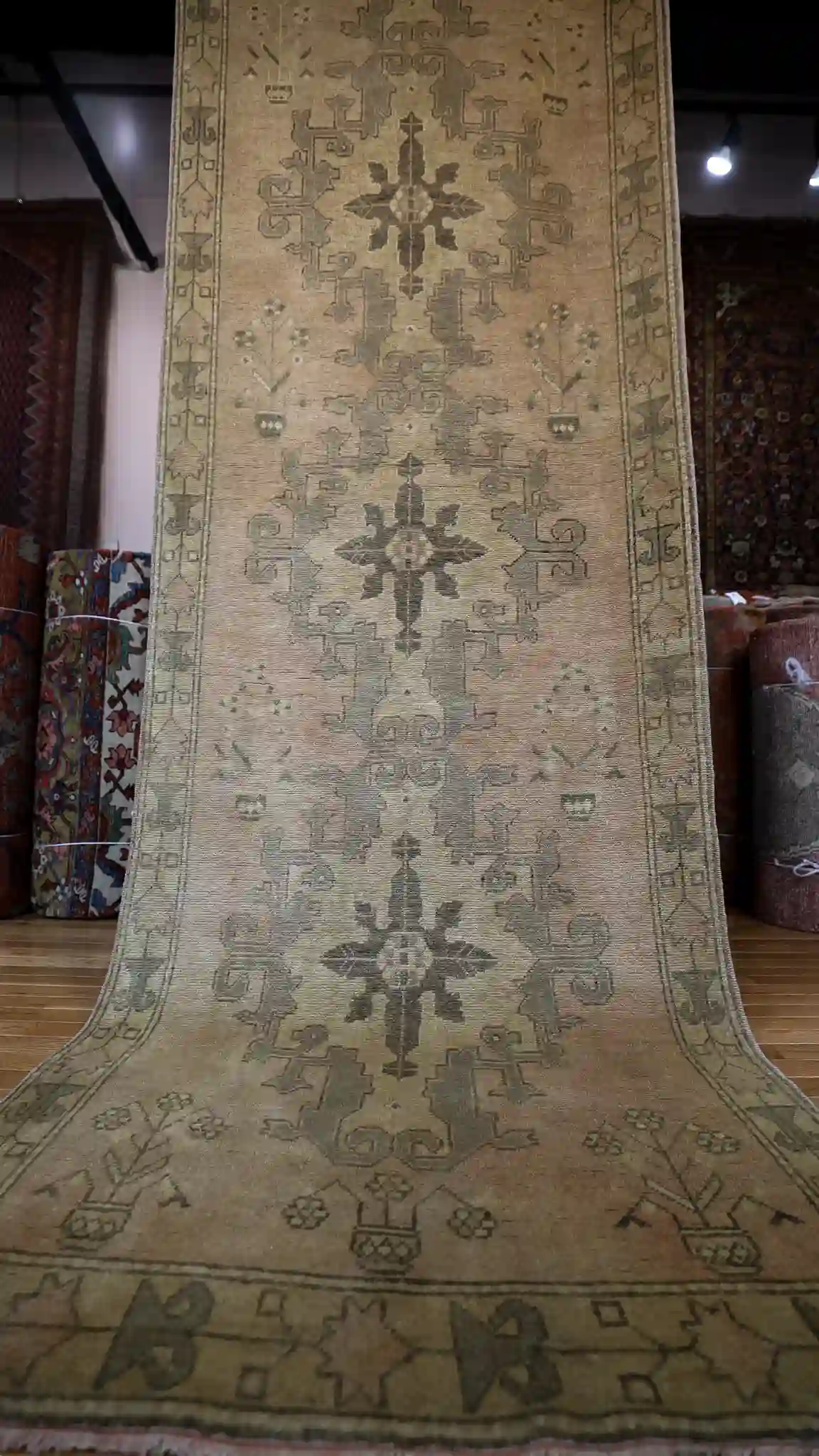 Turkish Oushak runners from the mid-20th century often use light fields and bold geometric designs inspired by village weaving traditions. This antique piece shows natural fading and abrash that give the colors depth and character, with thick wool pile typical of the region’s sturdy construction. The pattern maintains strong definition despite age, making it a durable and visually striking runner.