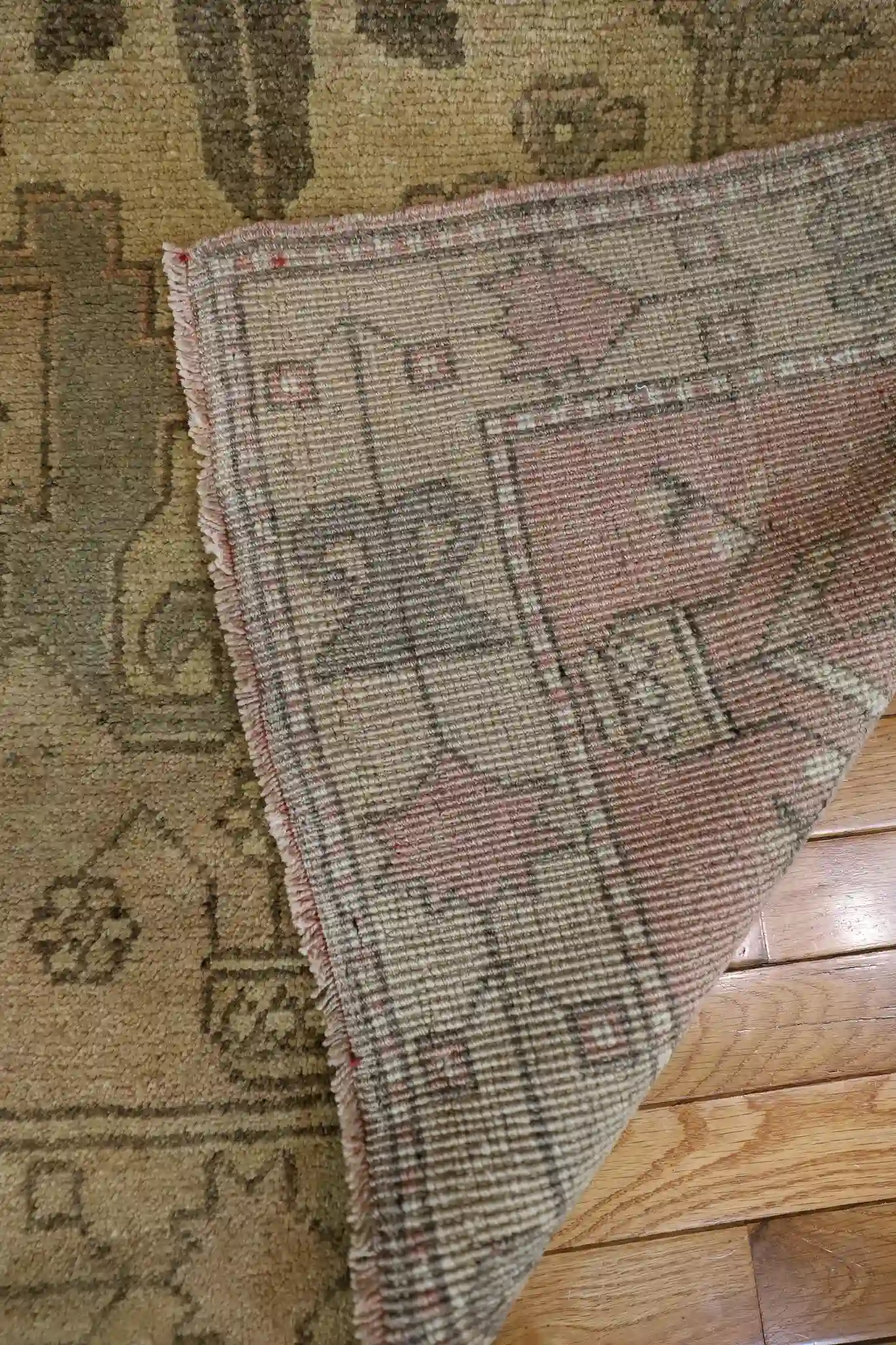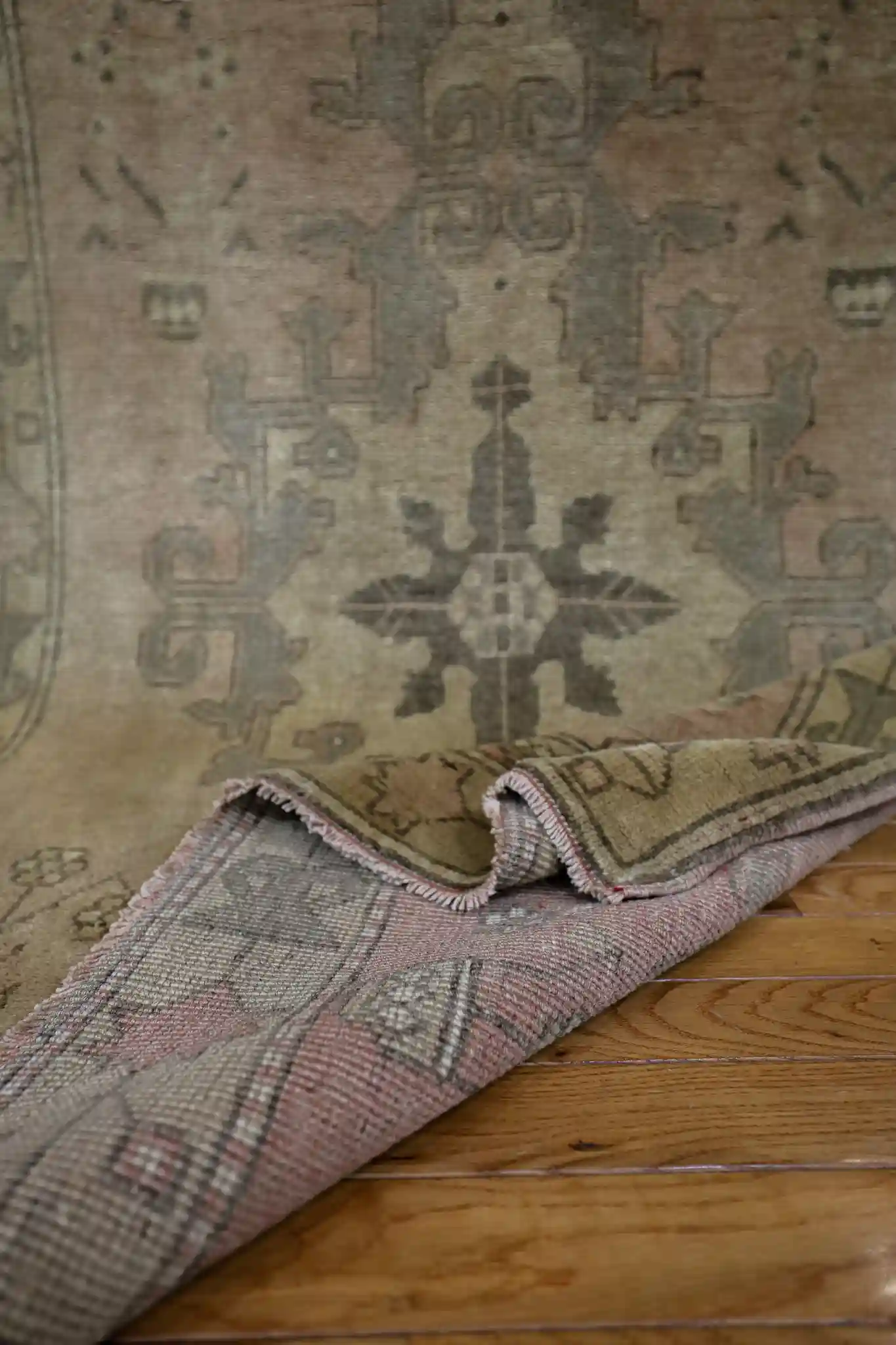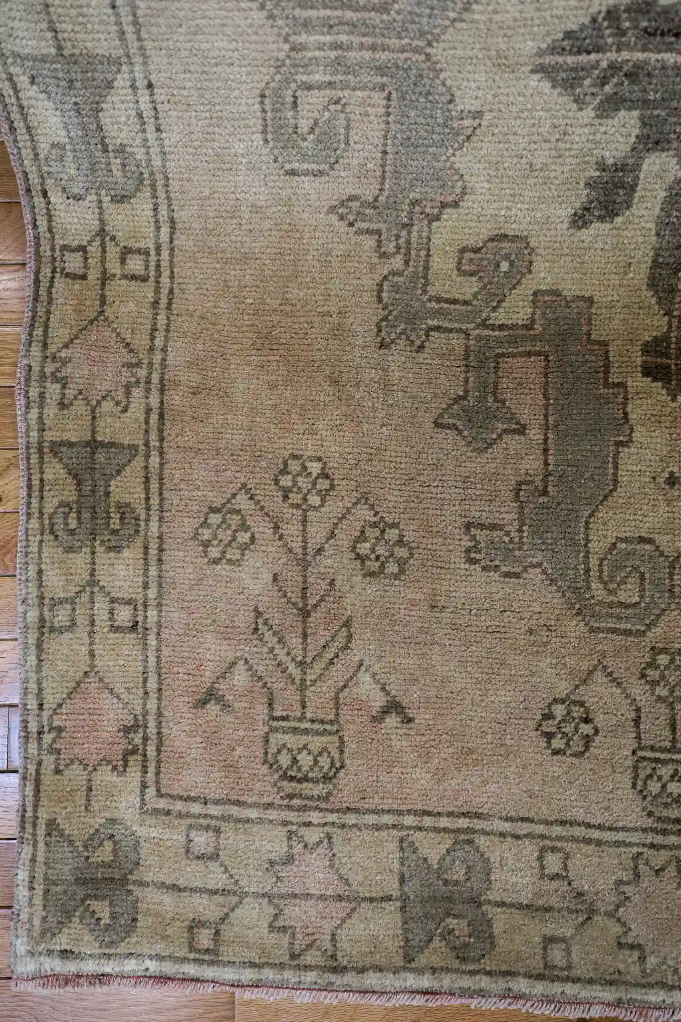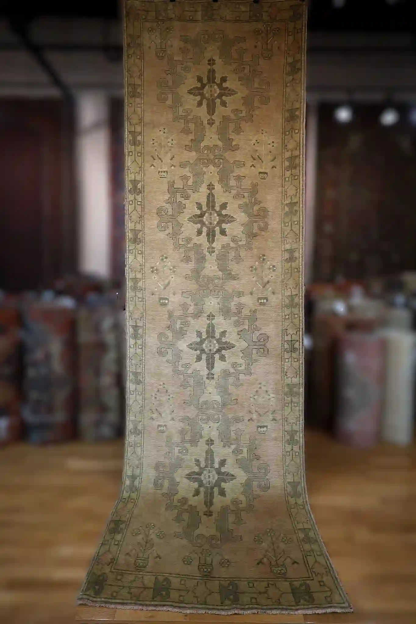 Turkish Oushak runners from the mid-20th century often use light fields and bold geometric designs inspired by village weaving traditions. This antique piece shows natural fading and abrash that give the colors depth and character, with thick wool pile typical of the region’s sturdy construction. The pattern maintains strong definition despite age, making it a durable and visually striking runner.