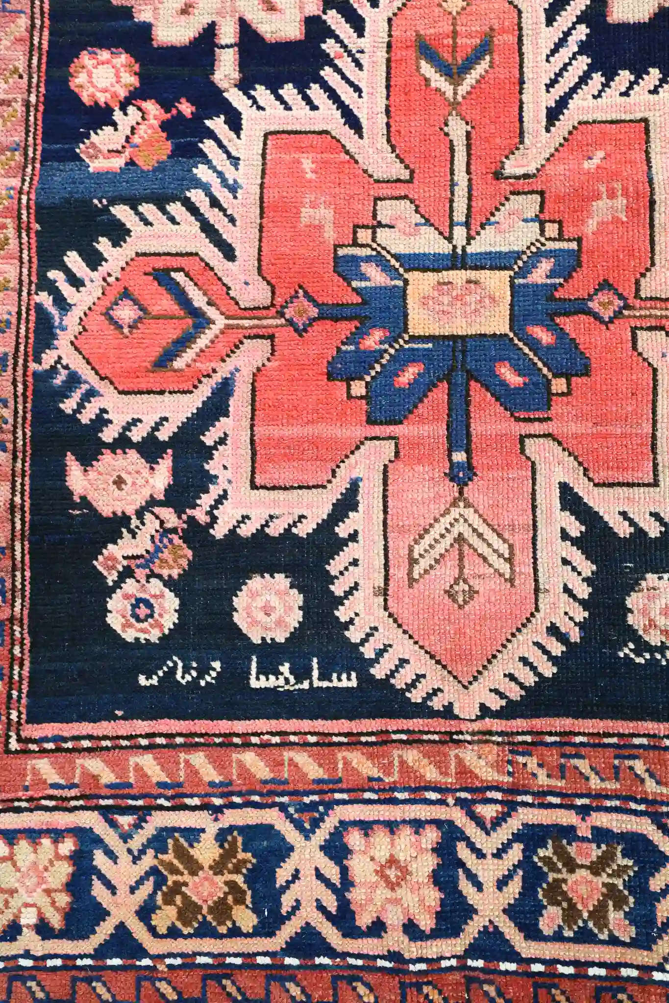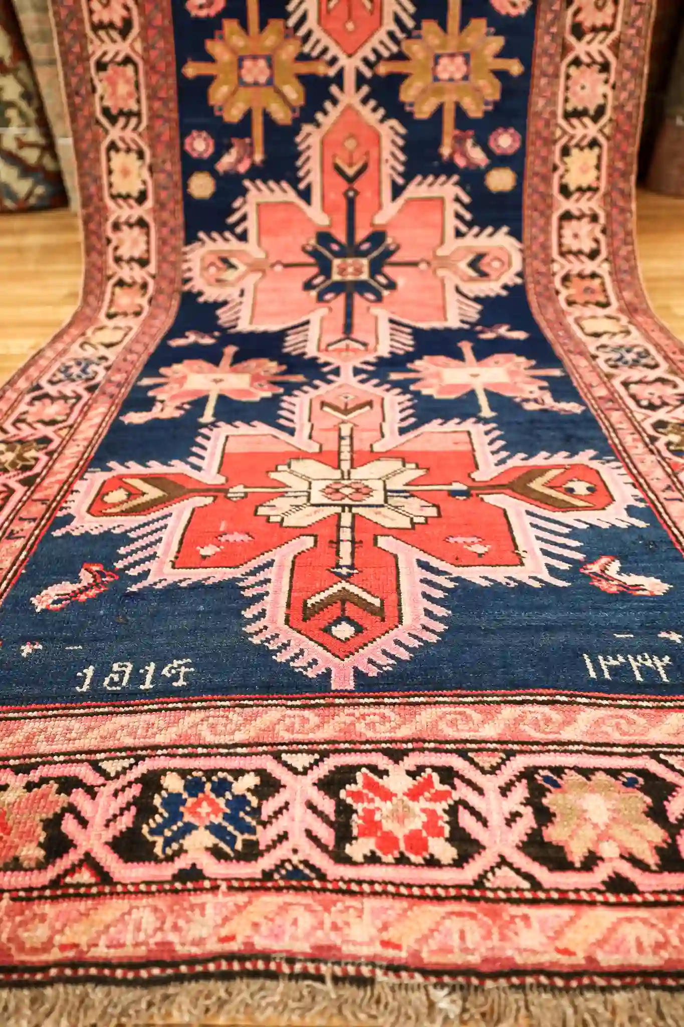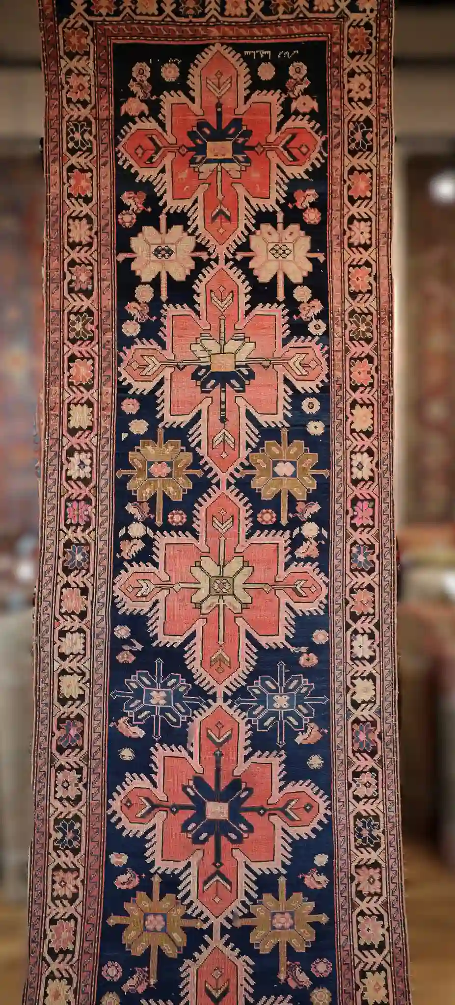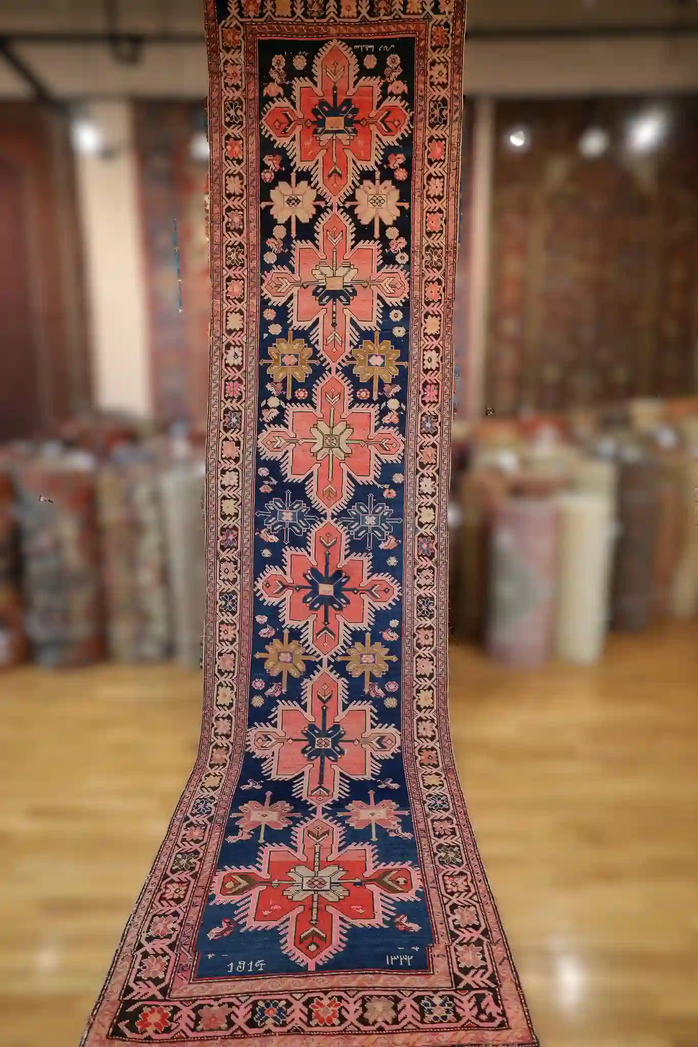 A 4×15 runner suits extended hallways, long entryways, or beside large dining tables, adding dramatic pattern and warmth to narrow spaces. The deep red field brings energy and richness, while the navy borders provide grounding contrast against wood or stone floors. Wool ensures exceptional durability, comfort, and natural stain resistance, with gentle vacuuming preserving its antique character.