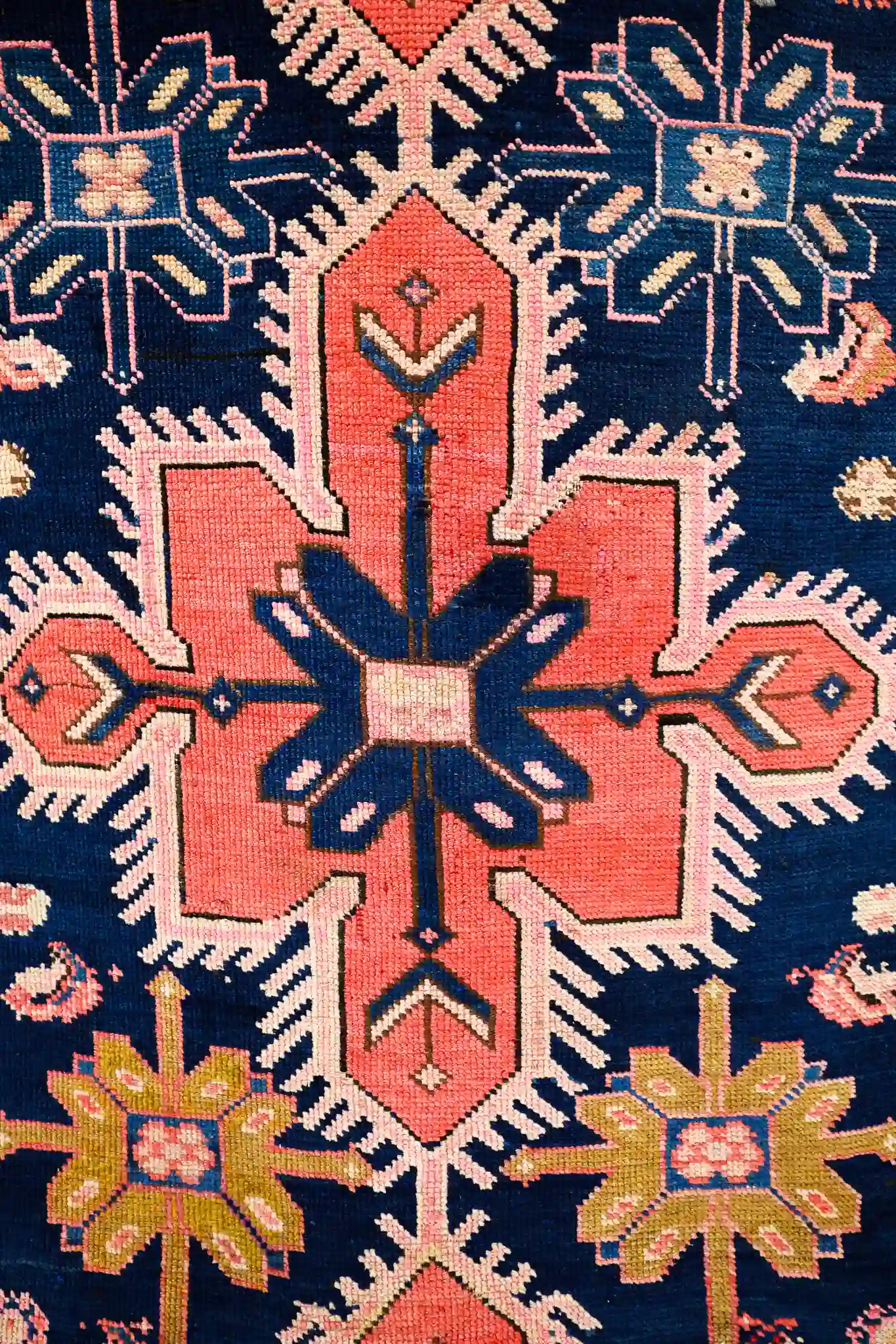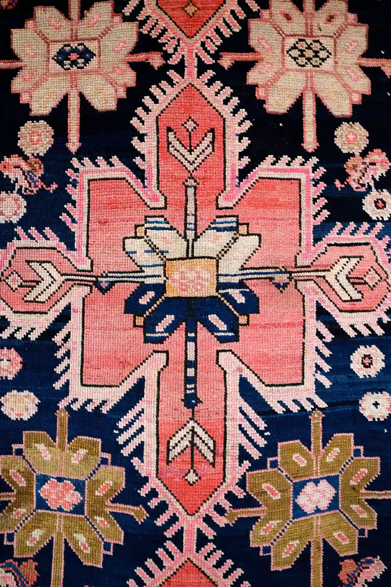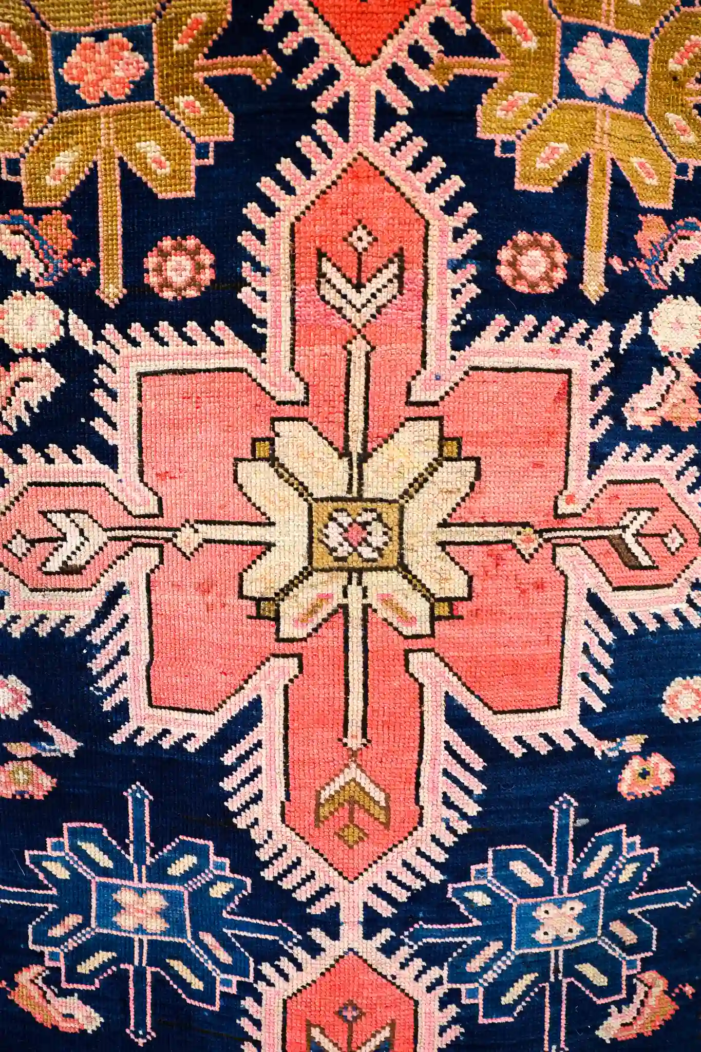 Karabagh rugs from the Caucasus region (late 19th to early 20th century) blend Persian influences with nomadic tribal styles, known for their vivid colors, thick wool construction, and geometric boldness. These pieces often show natural dye variations and abrash that develop rich patina over time. This example captures the classic Karabagh characteristics with tight knotting and substantial pile that has softened gracefully with age.