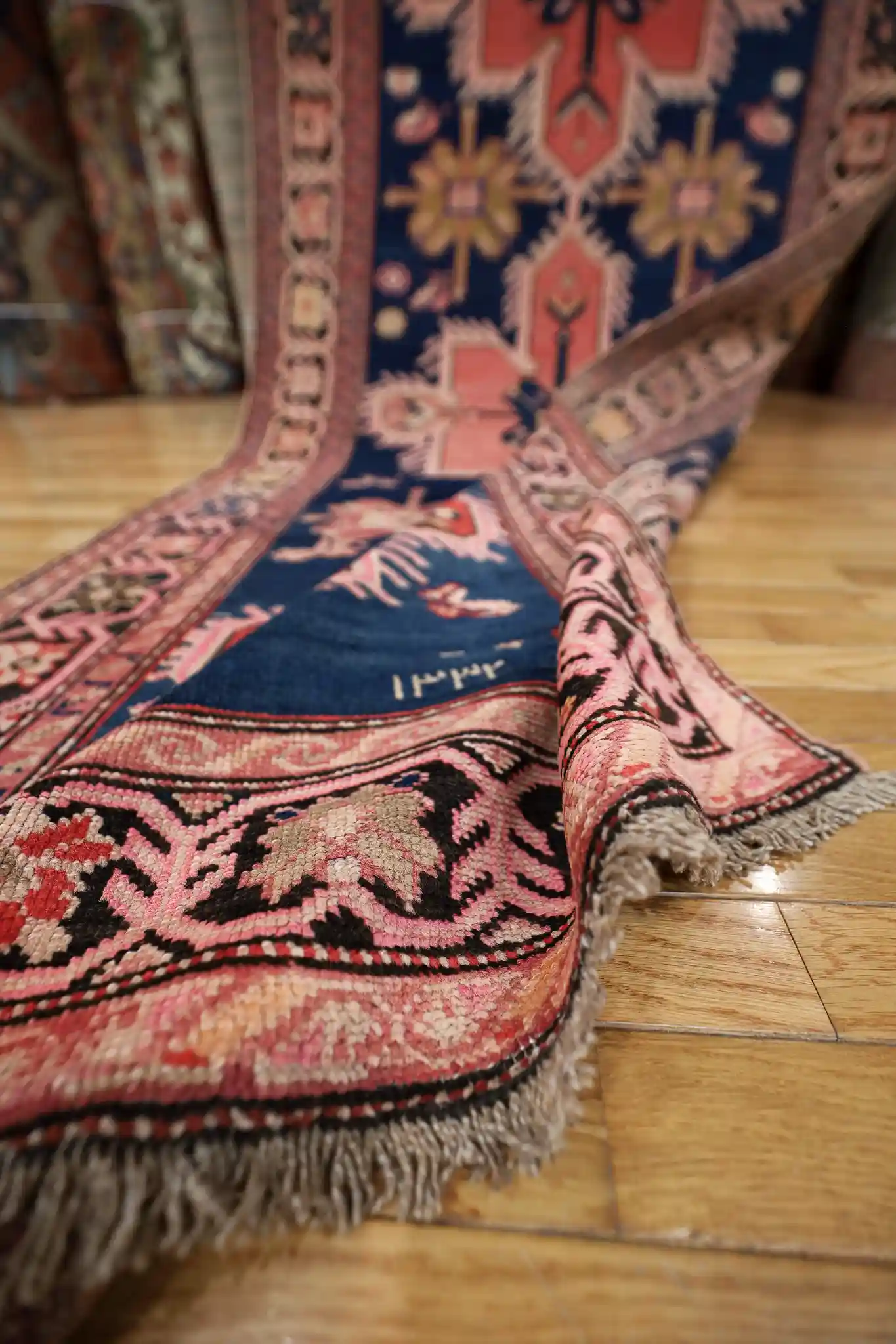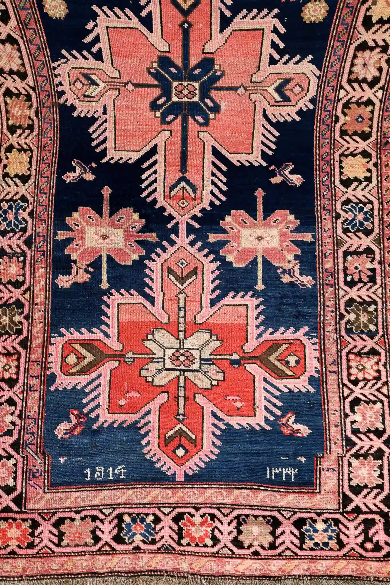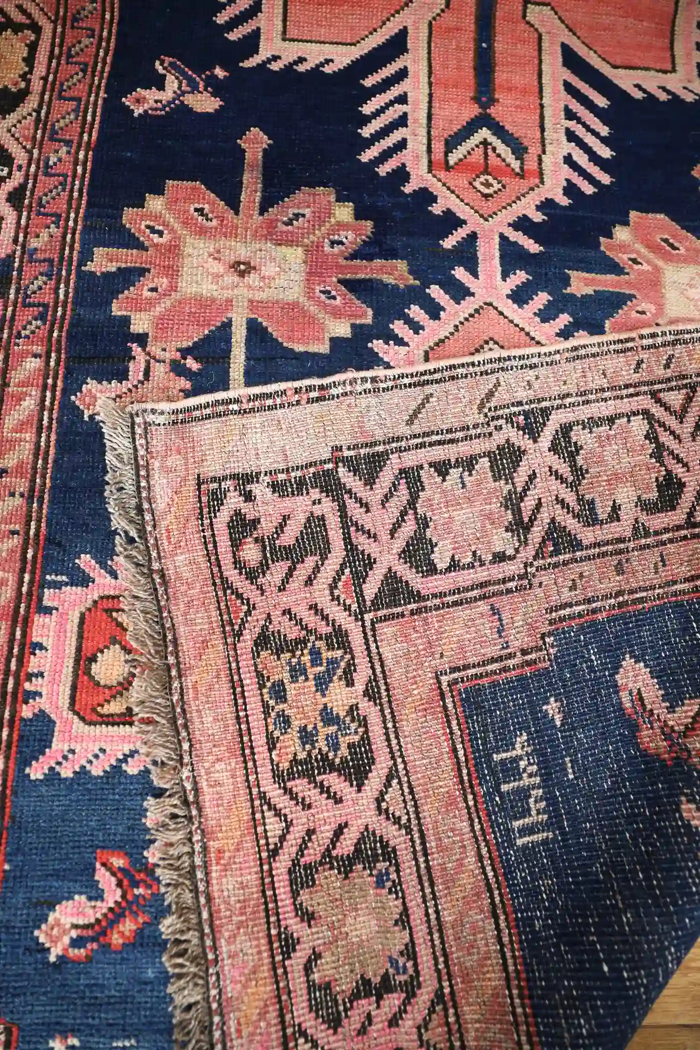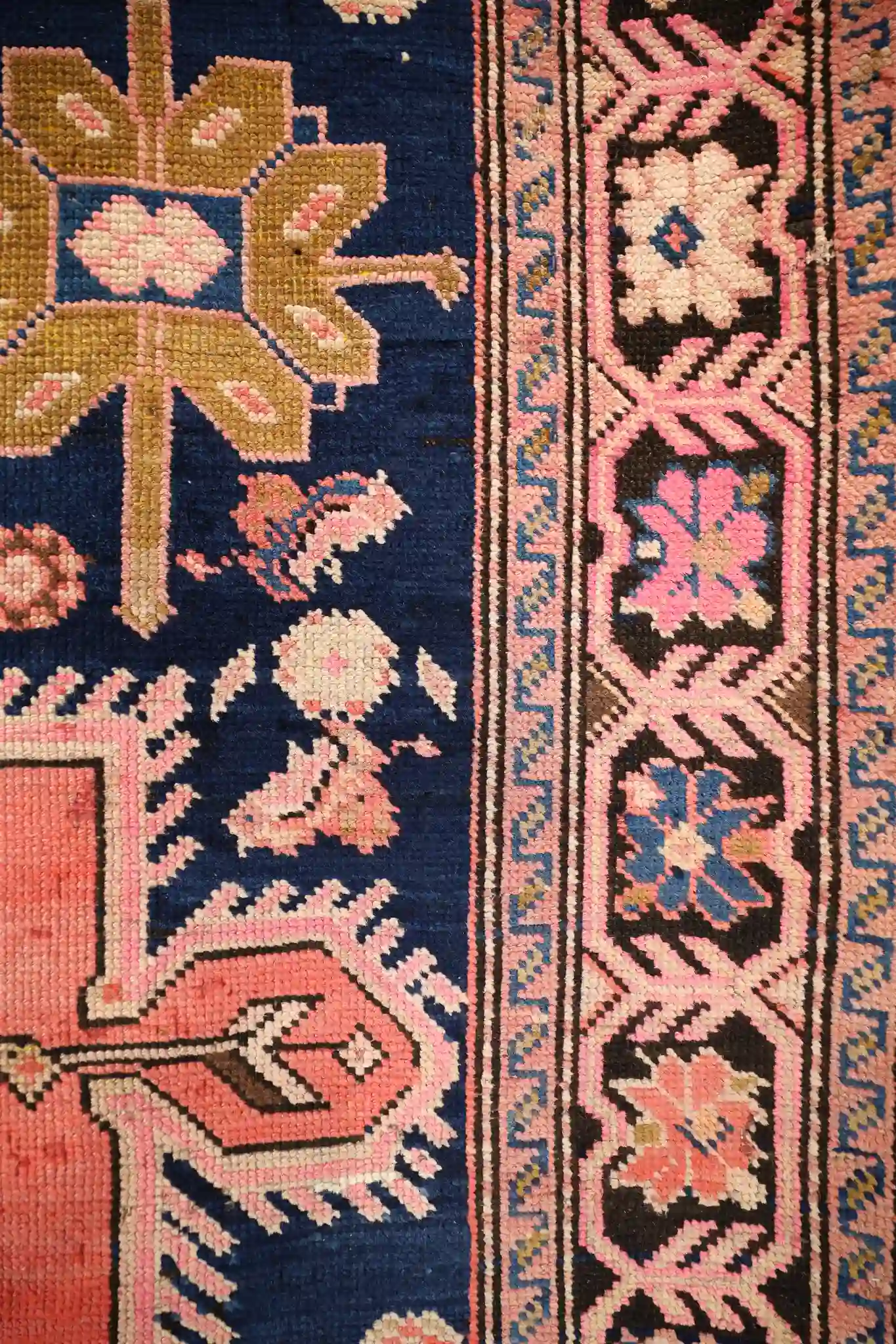 Karabagh rugs from the Caucasus region (late 19th to early 20th century) blend Persian influences with nomadic tribal styles, known for their vivid colors, thick wool construction, and geometric boldness. These pieces often show natural dye variations and abrash that develop rich patina over time. This example captures the classic Karabagh characteristics with tight knotting and substantial pile that has softened gracefully with age.