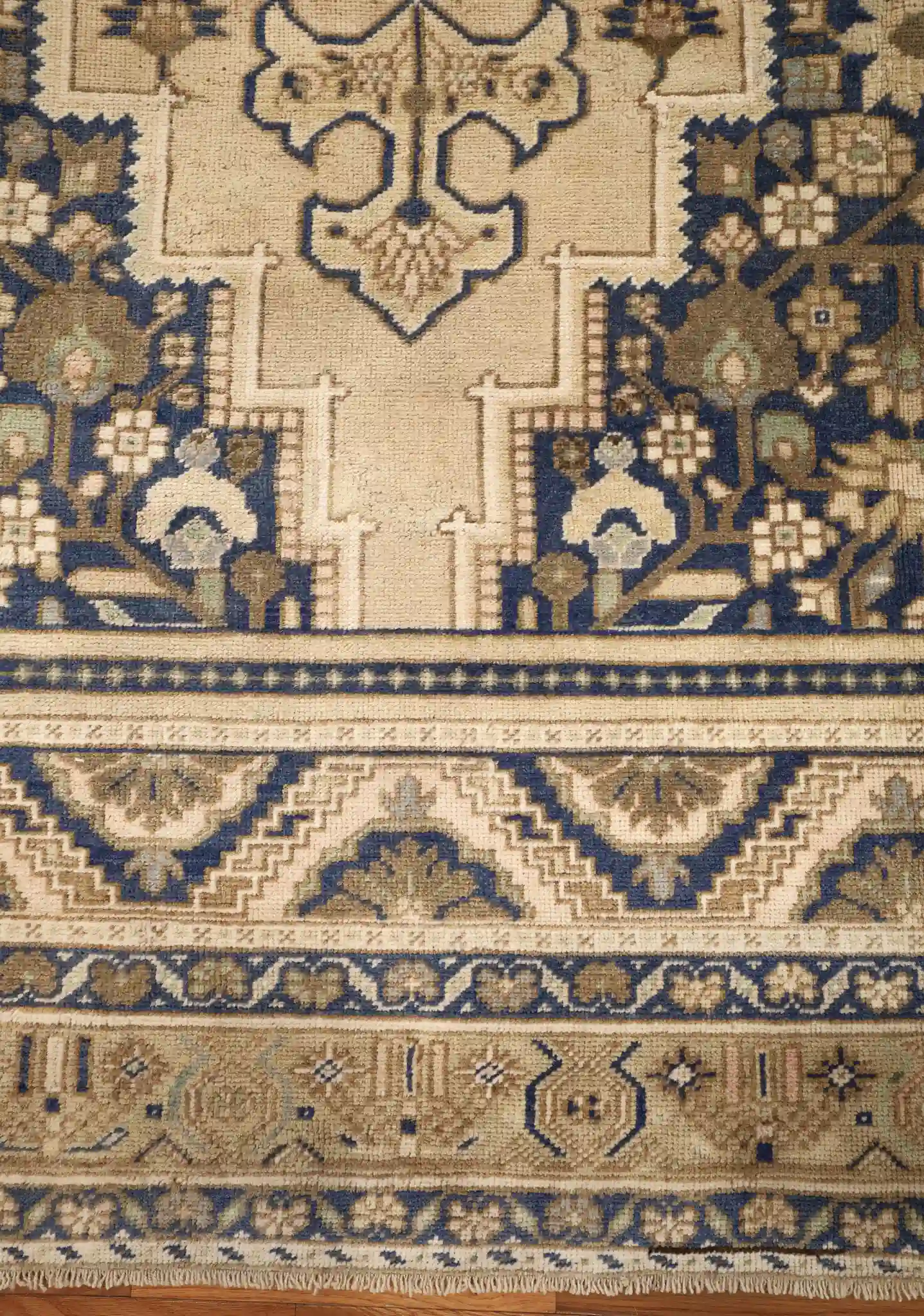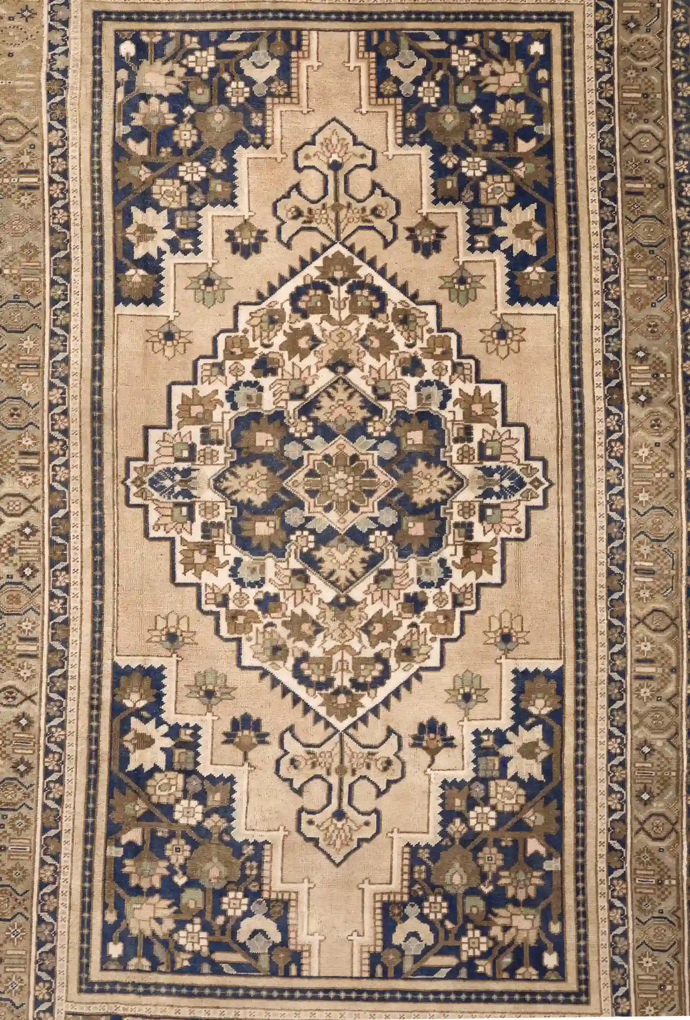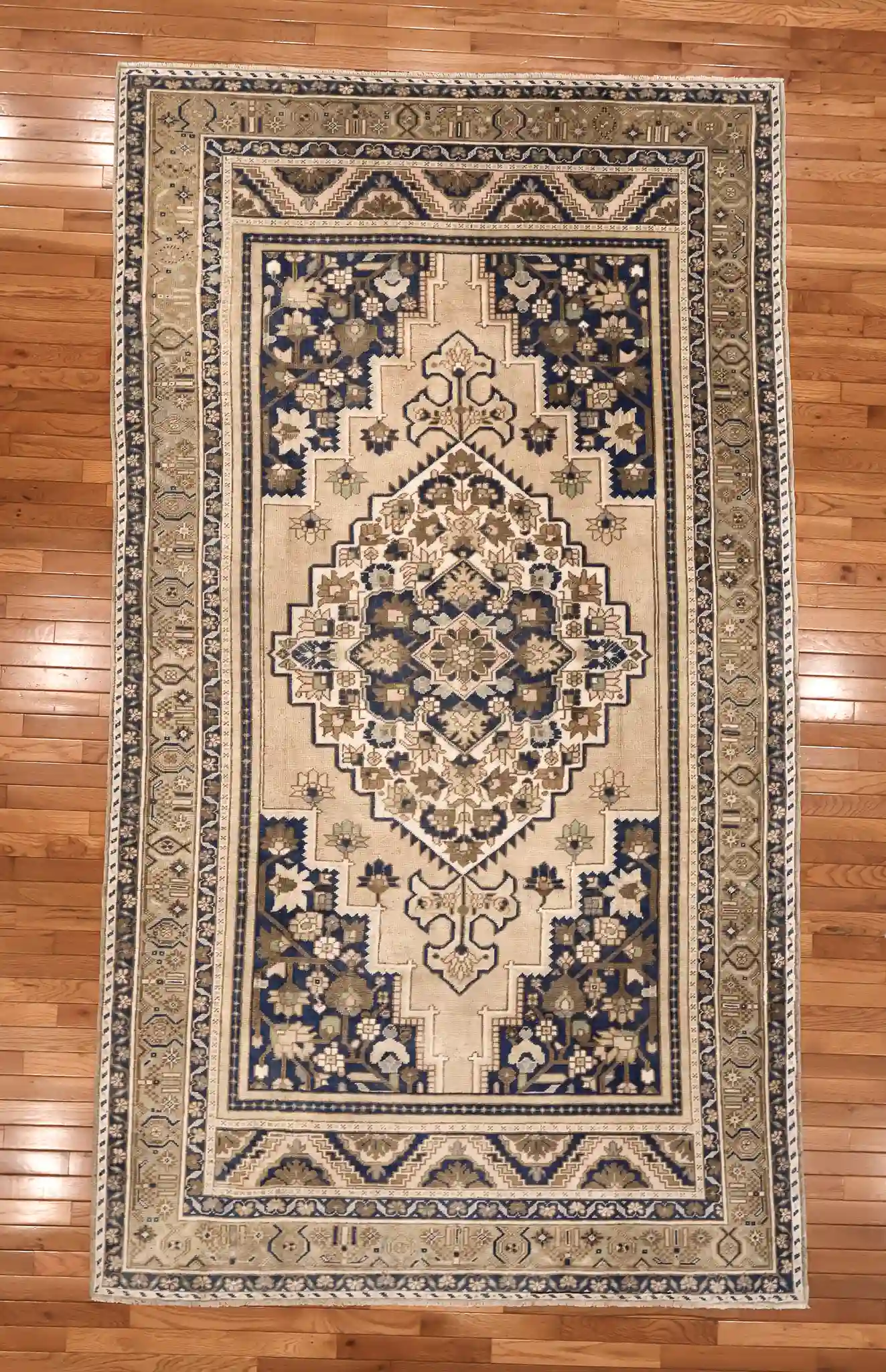 This attractive Anatolian rug features a classic central diamond medallion design on a light beige field. The large medallion contains layered floral and geometric elements in navy, sage, and gold, surrounded by smaller corner pieces and delicate flowering vines that fill the space. Multiple borders frame the field with repeating geometric patterns, stepped motifs, and meandering vines in contrasting navy and beige tones.