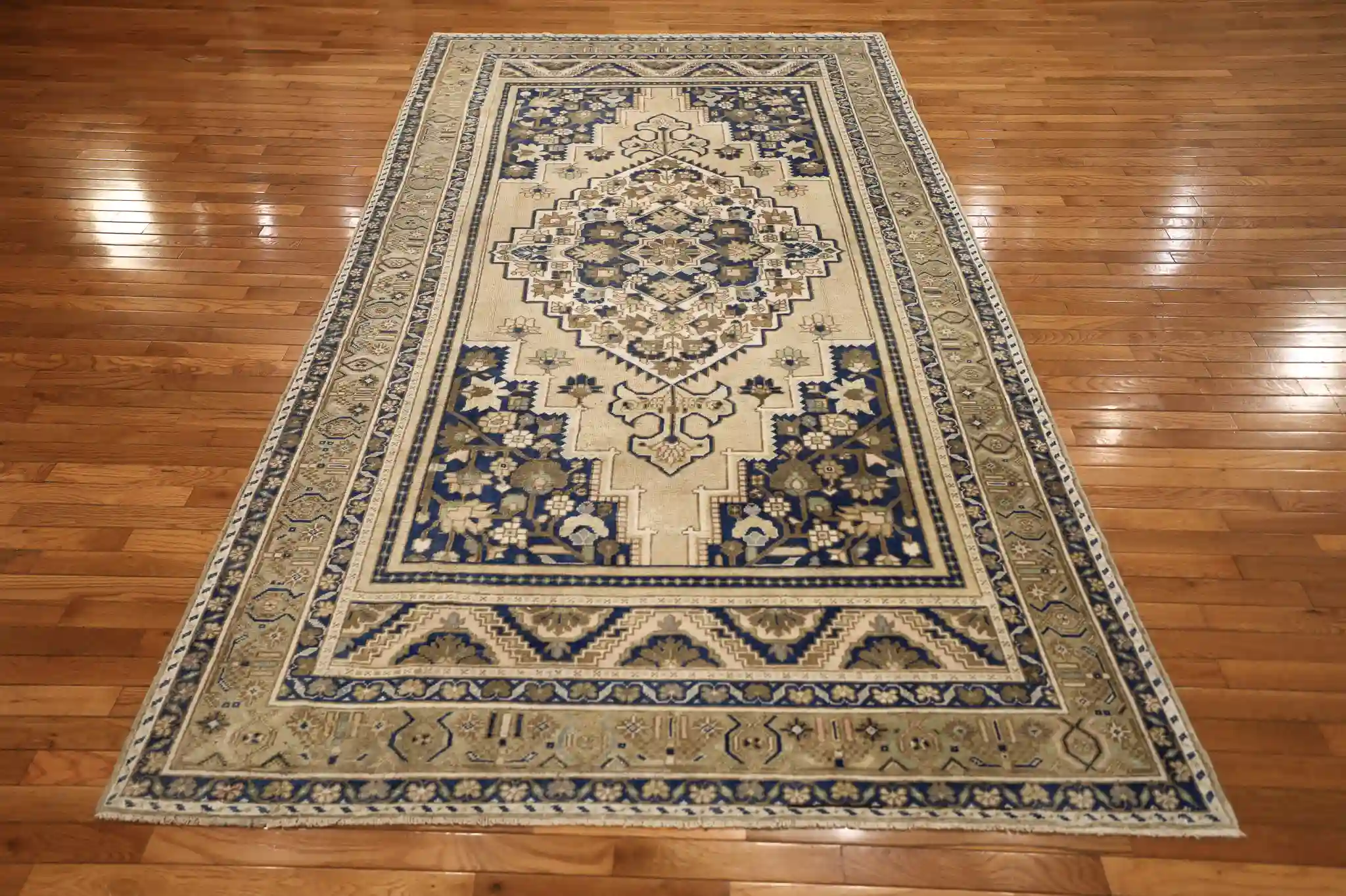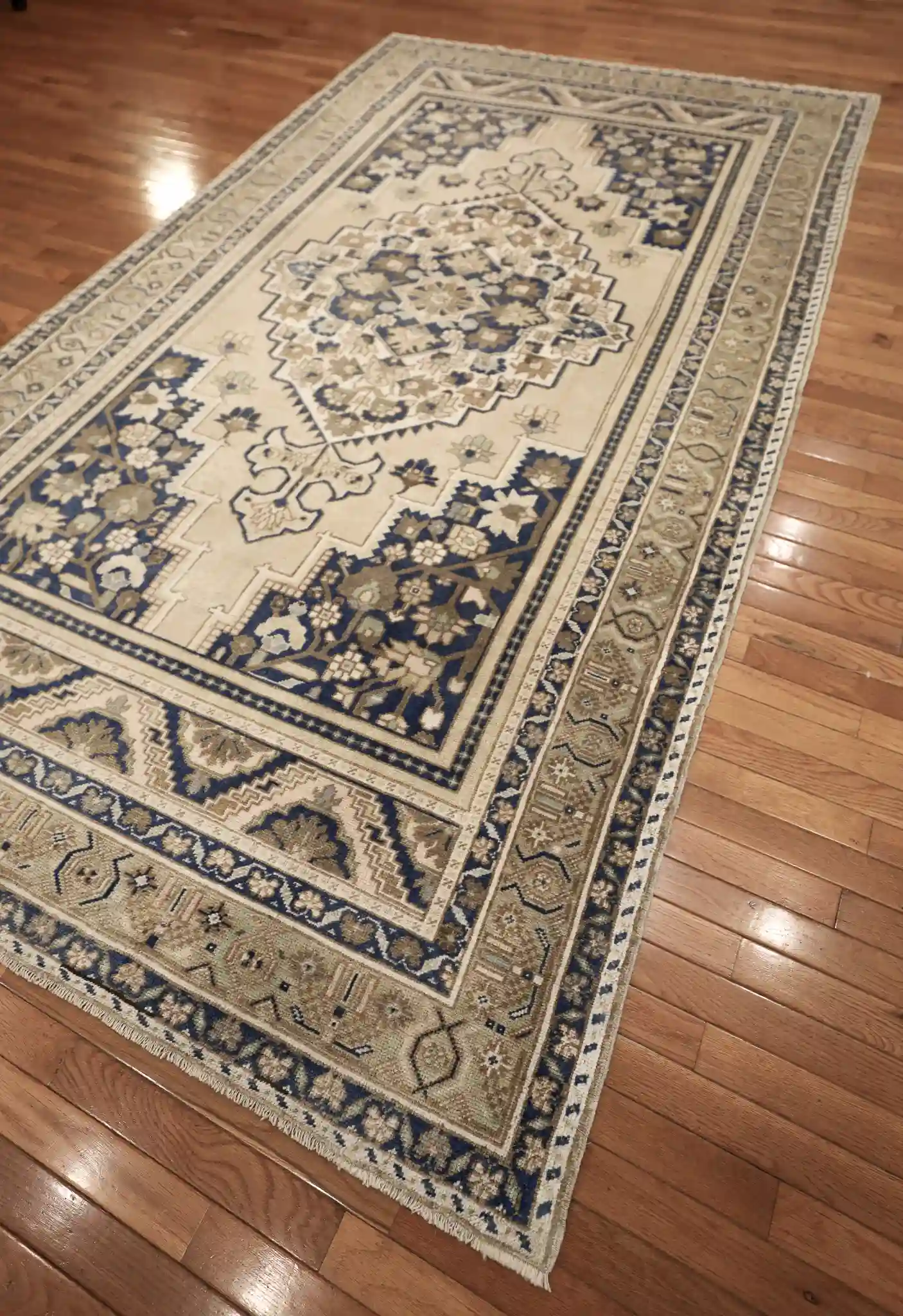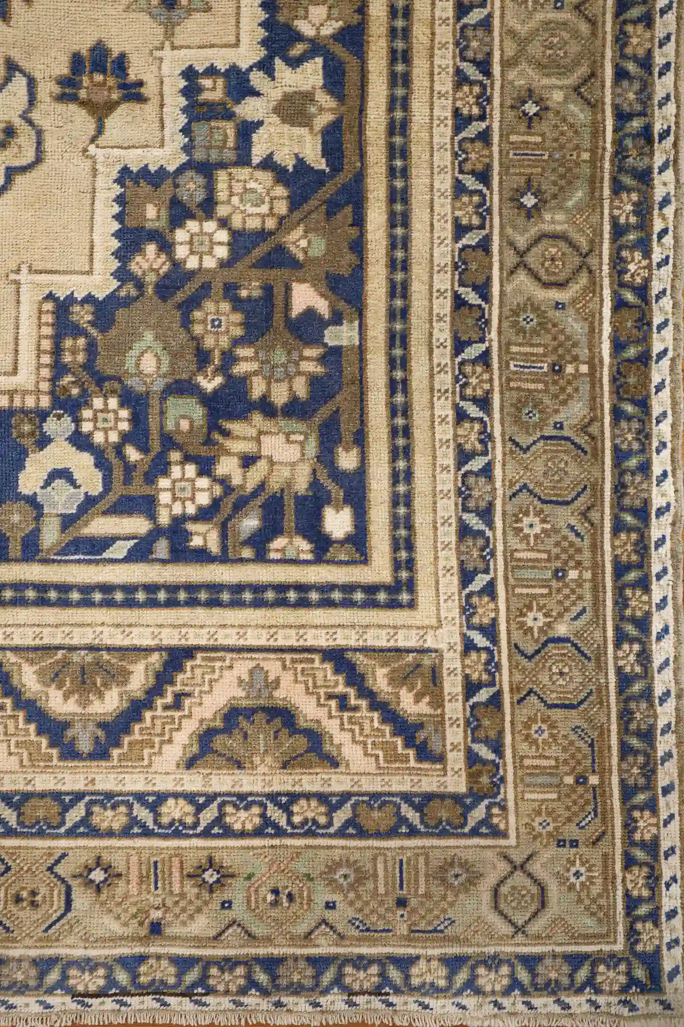 This attractive Anatolian rug features a classic central diamond medallion design on a light beige field. The large medallion contains layered floral and geometric elements in navy, sage, and gold, surrounded by smaller corner pieces and delicate flowering vines that fill the space. Multiple borders frame the field with repeating geometric patterns, stepped motifs, and meandering vines in contrasting navy and beige tones.