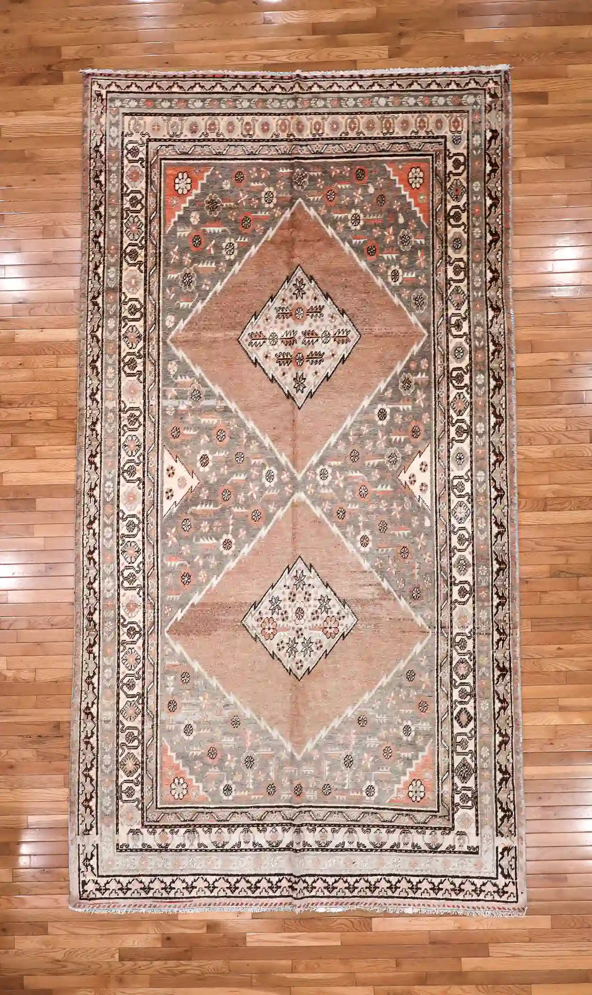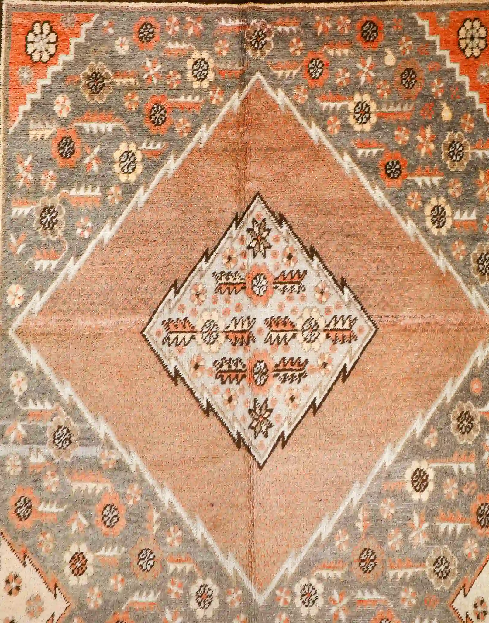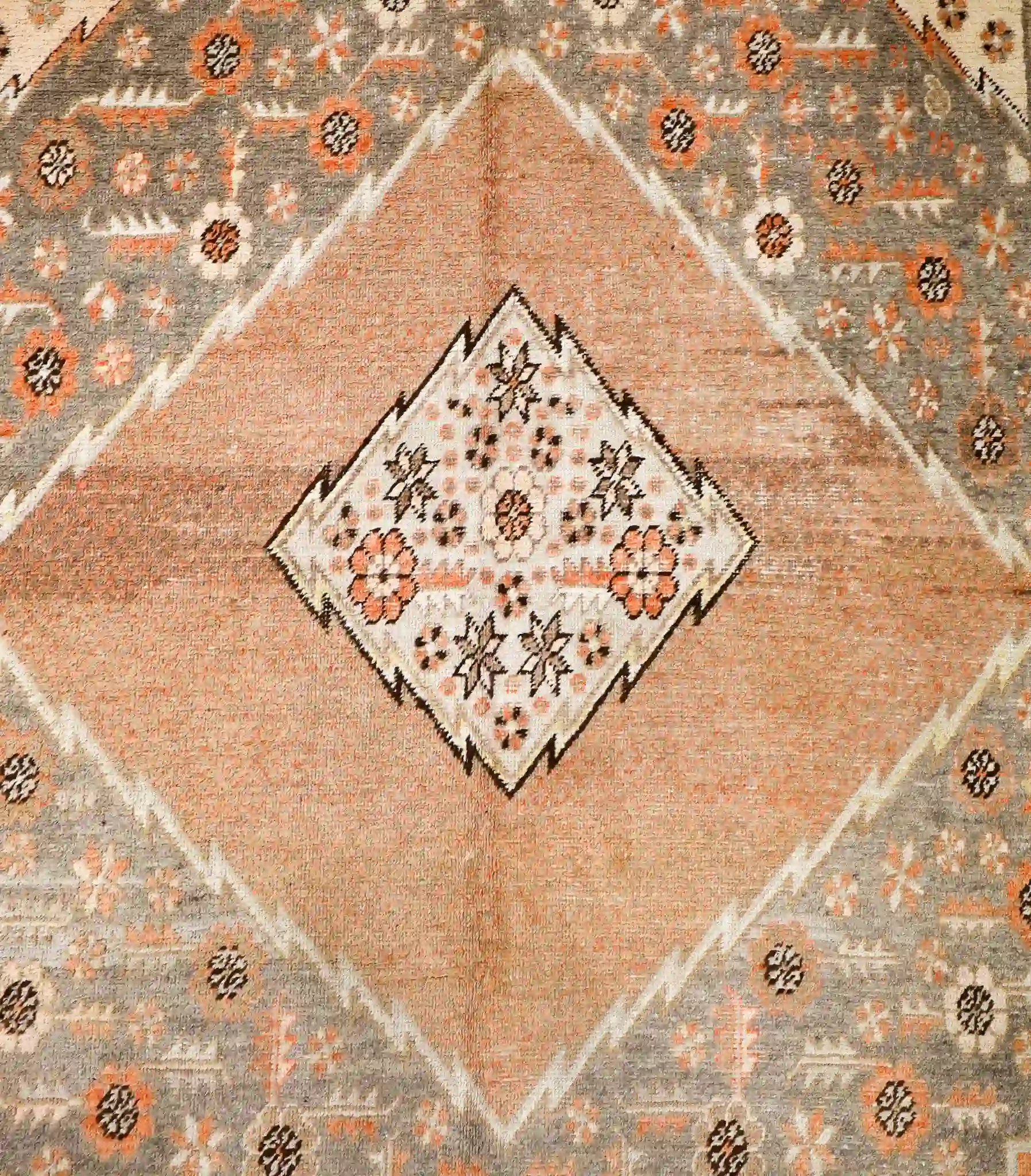 This vintage Khotan rug features a pale gray field with a large terracotta diamond medallion crossed by geometric bands, filled with tribal stars and motifs, framed by detailed multi-layered borders in coral and ivory. Hand-knotted in wool with natural fading and ethnic character, it measures about 6’4″ x 12′. See the long description for more details.