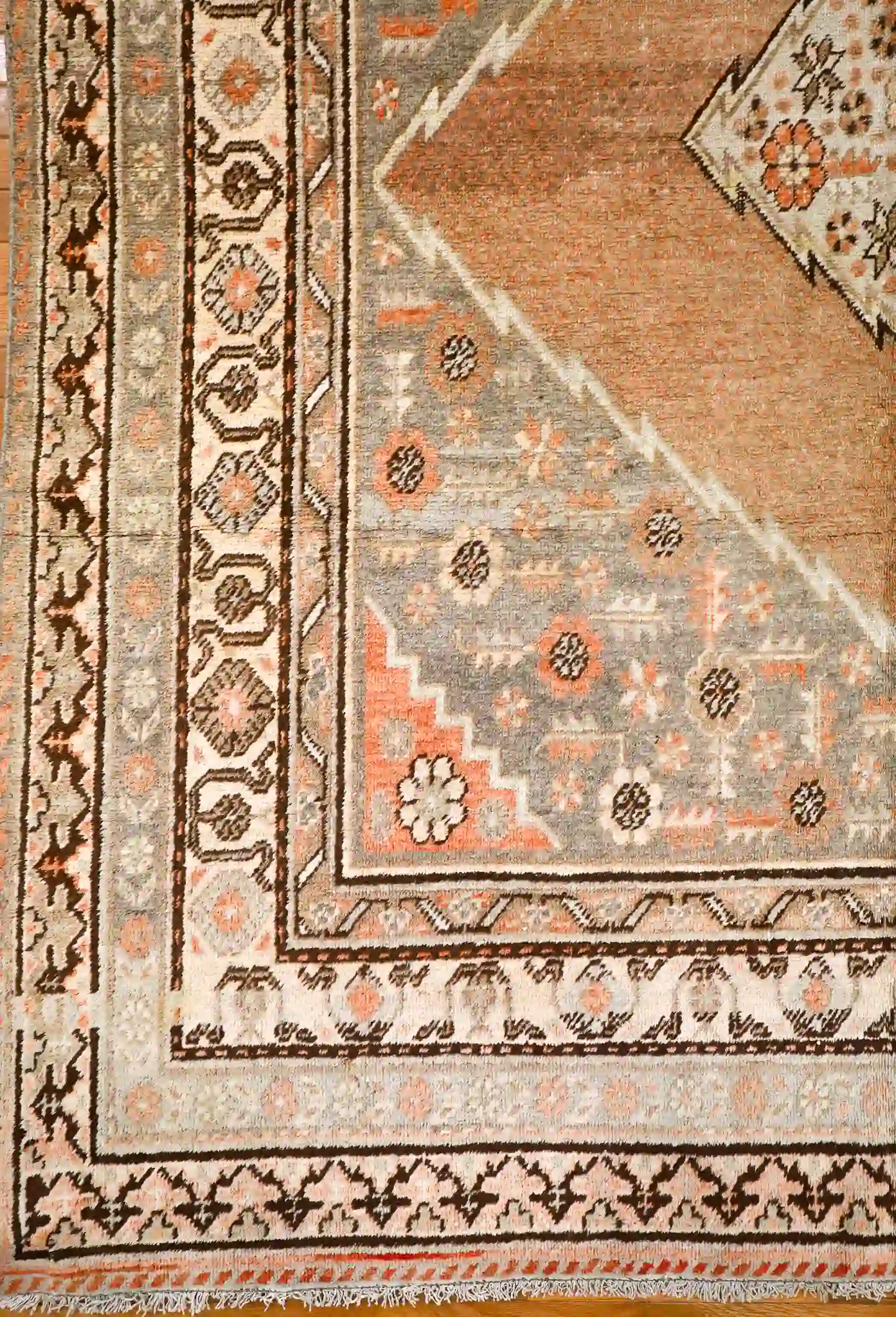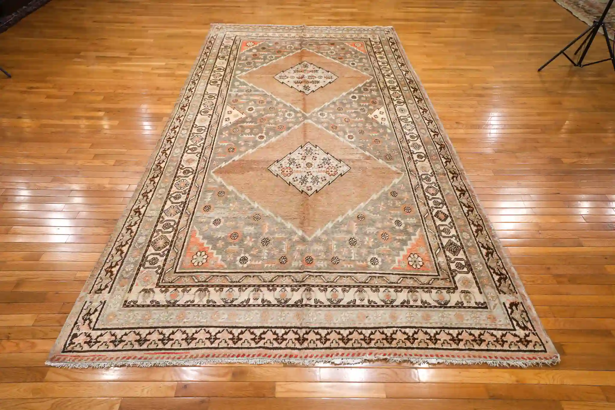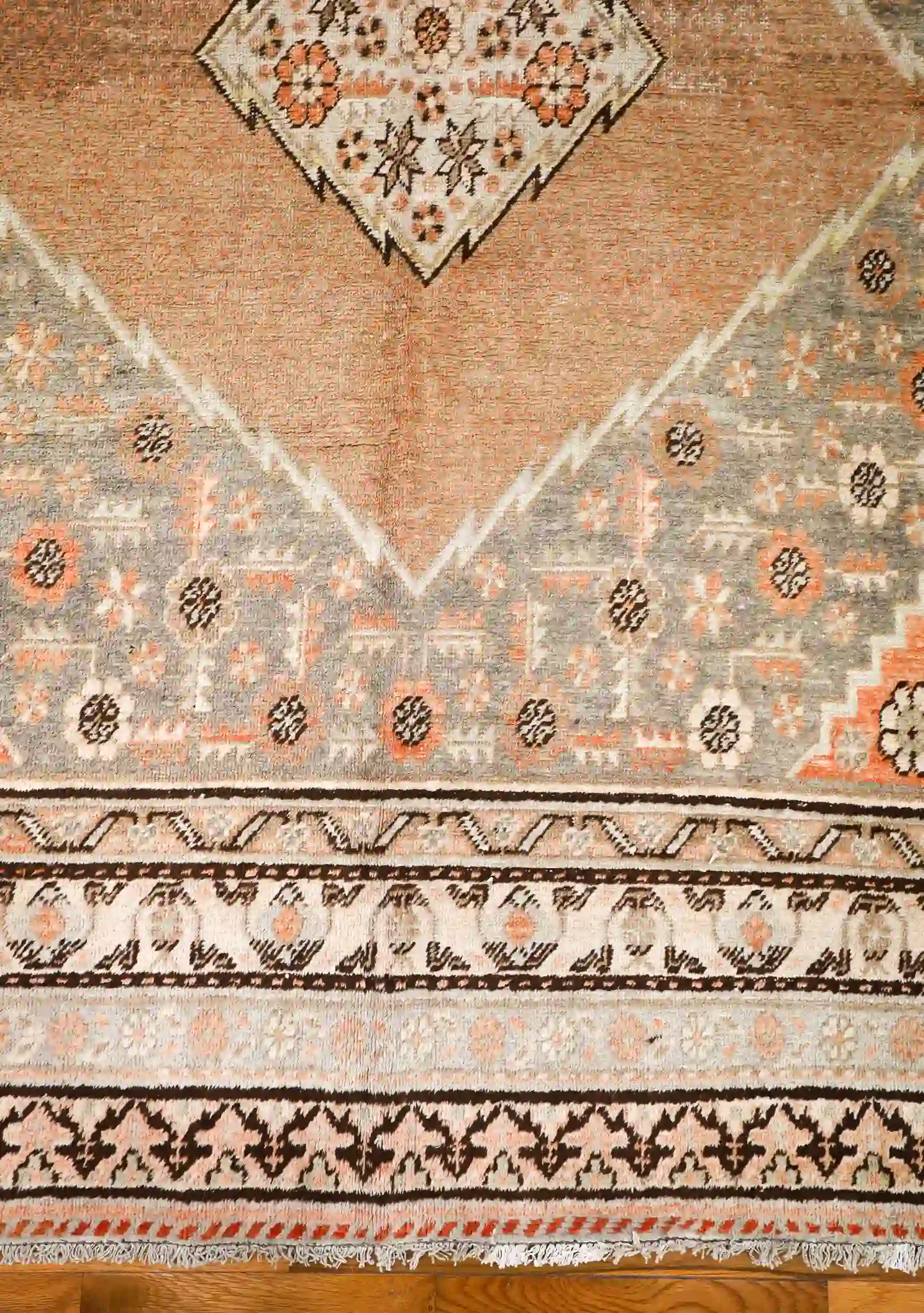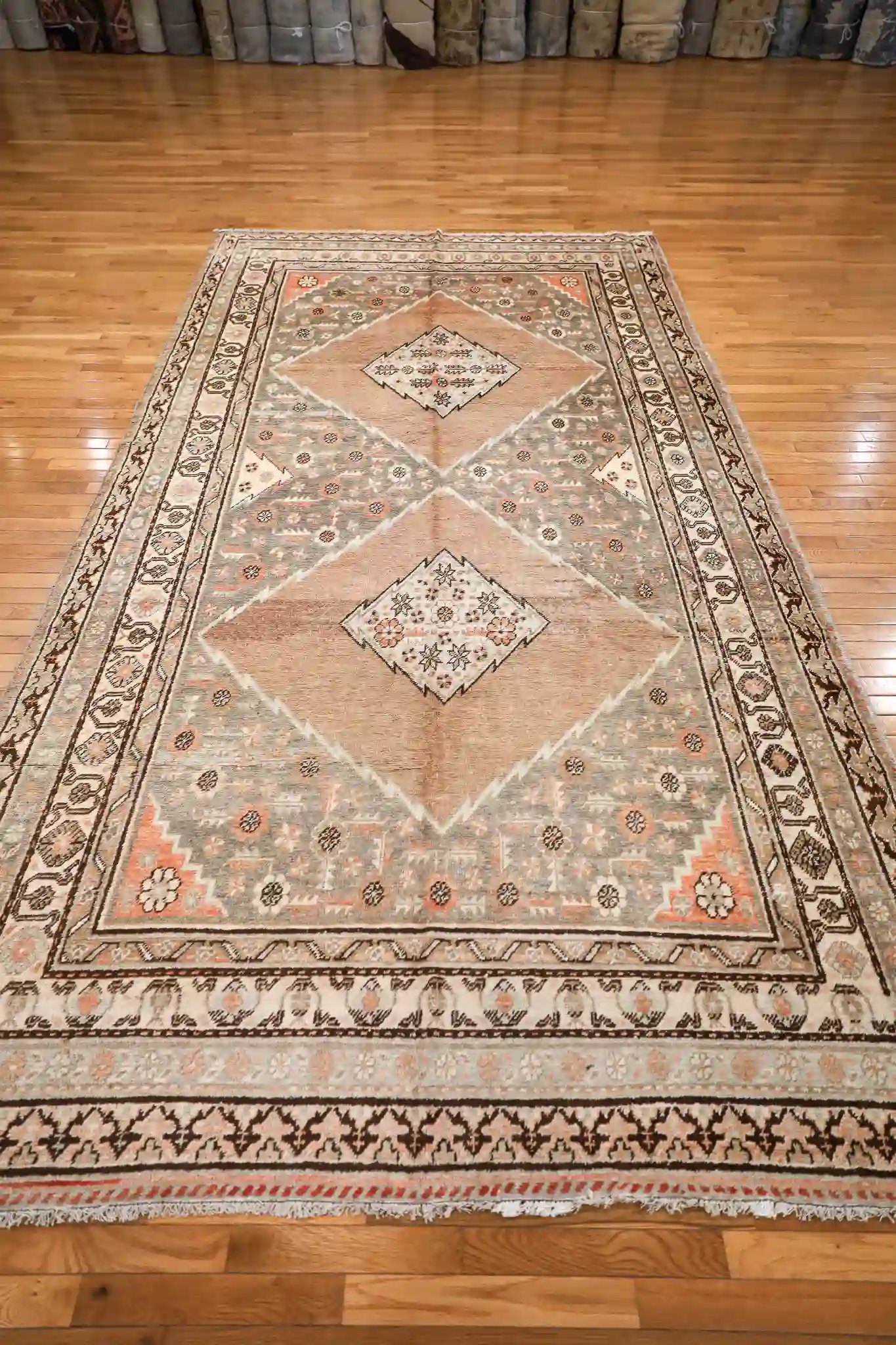 This vintage Khotan rug features a pale gray field with a large terracotta diamond medallion crossed by geometric bands, filled with tribal stars and motifs, framed by detailed multi-layered borders in coral and ivory. Hand-knotted in wool with natural fading and ethnic character, it measures about 6’4″ x 12′. See the long description for more details.
