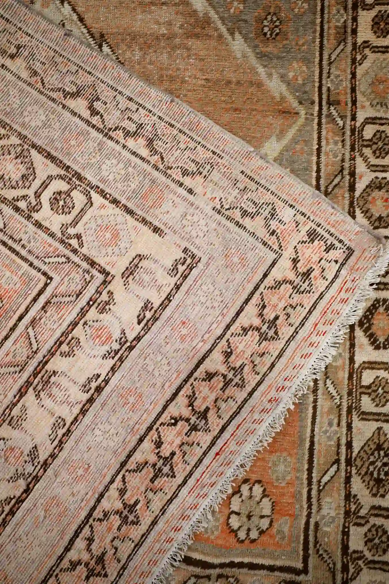 Khotan rugs come from the oasis towns of East Turkestan (Xinjiang), blending influences from Persian, Chinese, and local Turkic weaving traditions, often made by Uzbek or Uyghur weavers. Vintage pieces from the mid-20th century or earlier show bold tribal layouts with softer, naturally faded wool colors and a slightly irregular hand-knotted construction using the asymmetric Persian knot. These rugs have a medium pile that feels sturdy yet soft, with natural abrash adding depth and a lived-in quality.