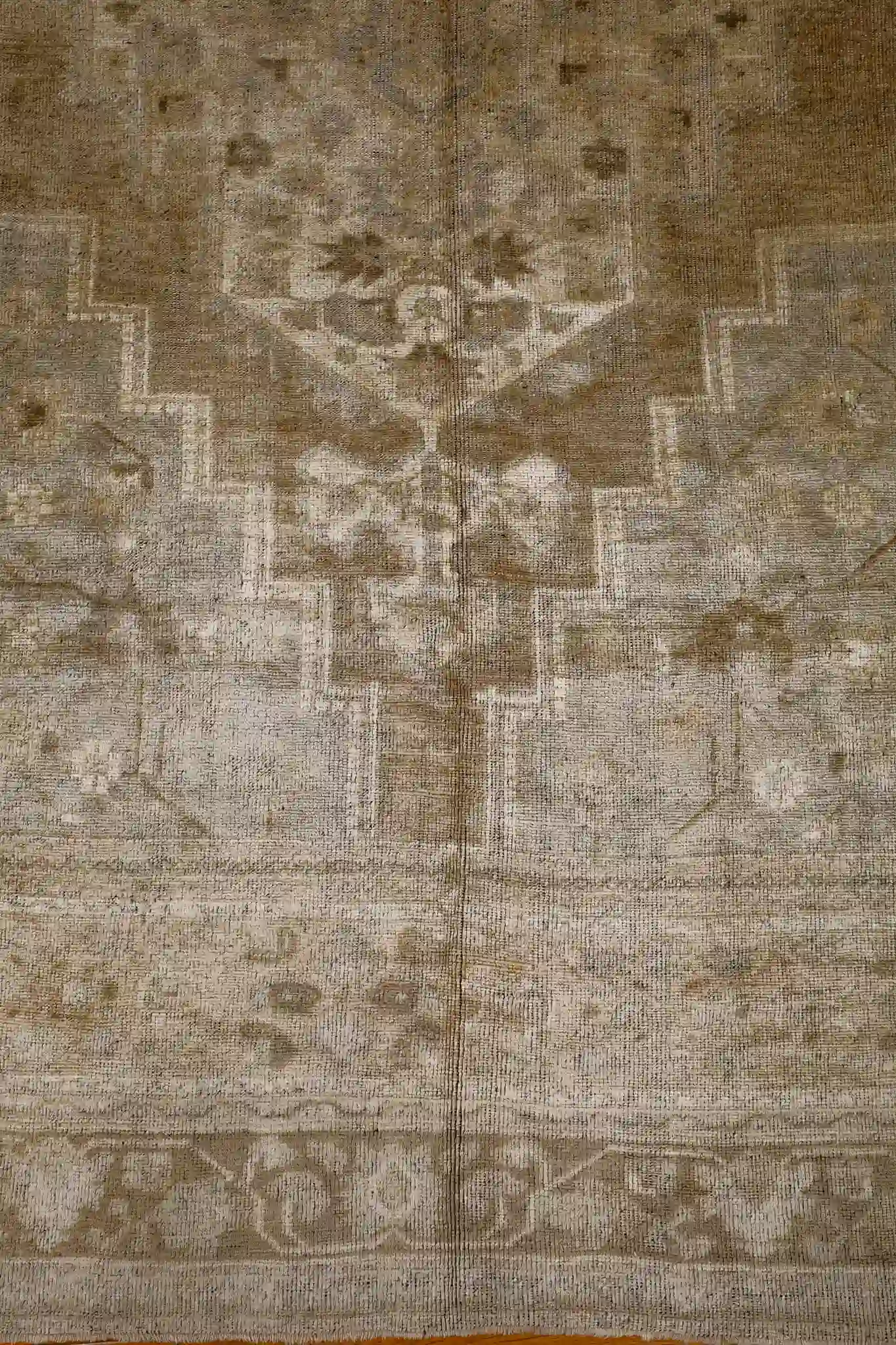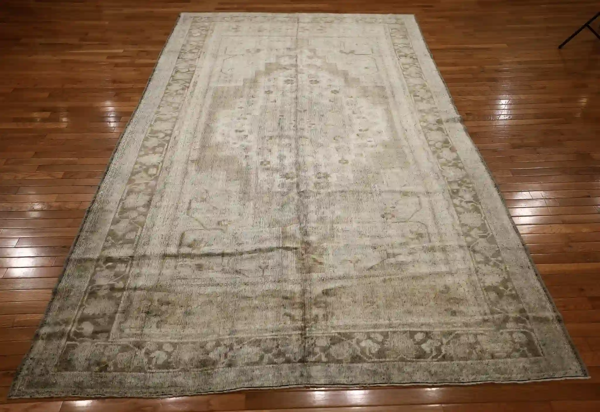 Oushak rugs developed in Ottoman times with large-scale, airy patterns, and vintage pieces from the 20th century often show reduced contrast and gentle abrash from wool dyed with natural materials. The Turkish symmetric knot gives even structure and a low to medium pile that has worn smoothly over time, adding to the rug’s relaxed, authentic feel without heavy damage.
