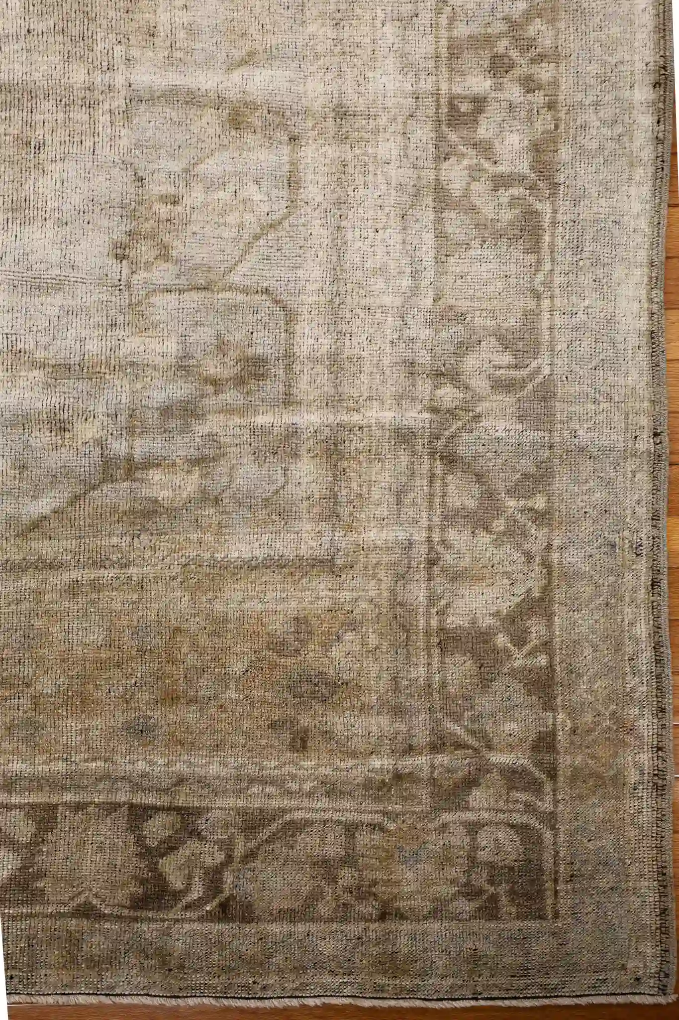 This size suits medium to large living rooms under seating areas, dining spaces for 6-8 person tables, or bedrooms with nice overhang on the sides to bring subtle warmth and texture. The wool offers good durability for normal use, natural softness, and straightforward care through vacuuming and occasional professional cleaning. Vintage Oushaks in these neutral, washed tones are favored for their versatility, blending easily with contemporary, farmhouse, or traditional settings while adding quiet character and timeless appeal.
