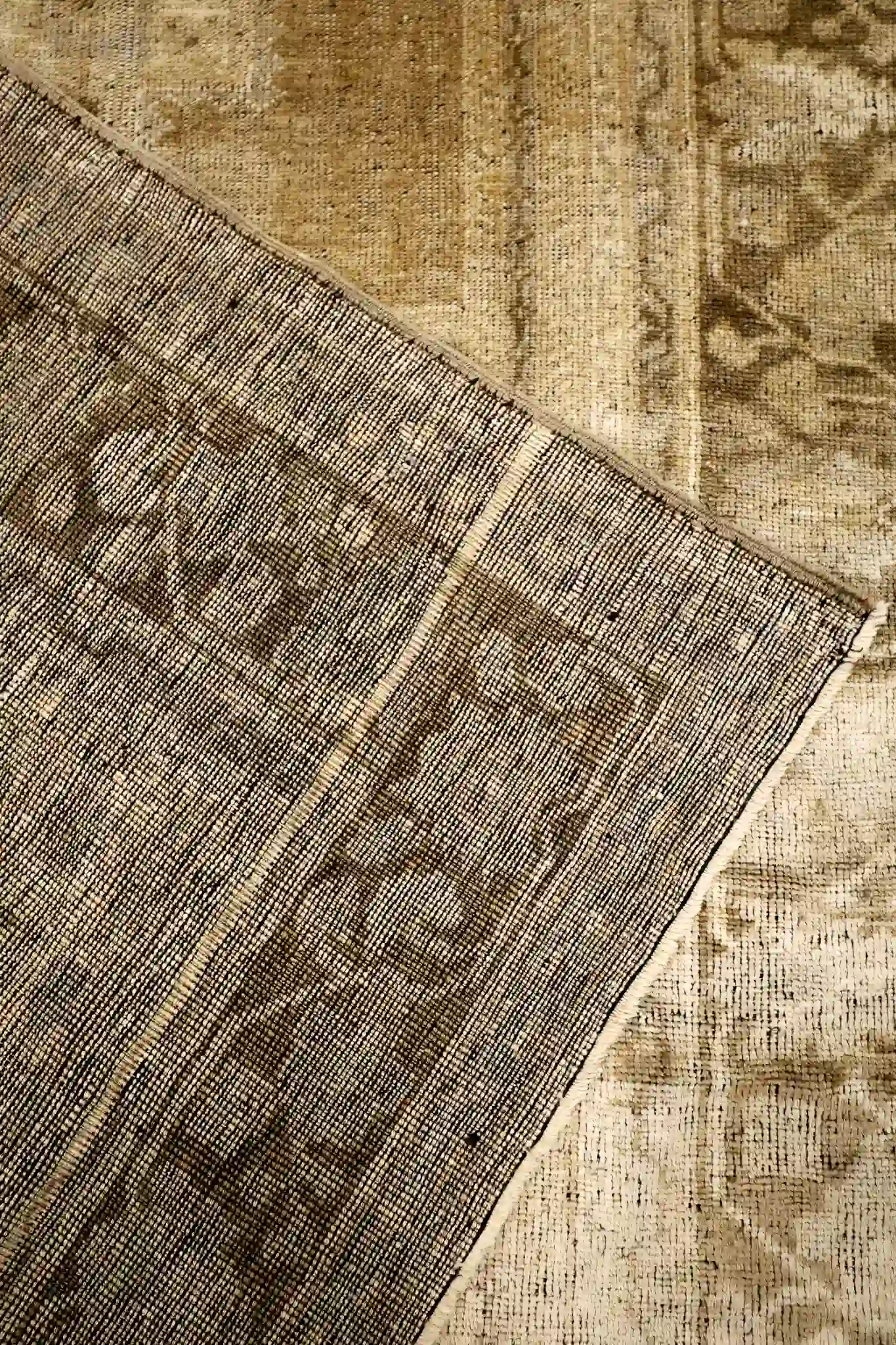 Material: Wool (hand-knotted pile, cotton foundation typical for Oushak rugs)