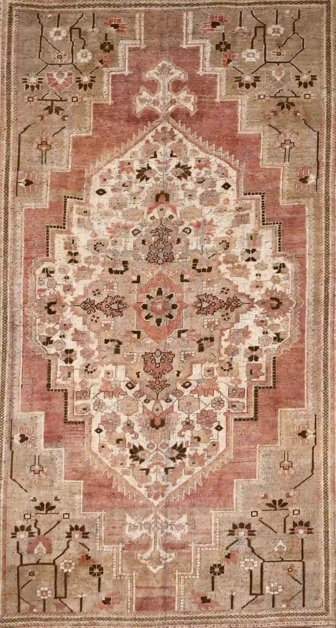 This vintage Turkish Oushak rug displays a wide beige field anchored by a tall, stepped mihrab-style central medallion in deep brown tones that tapers toward the ends. The medallion encloses a large floral cartouche in rose and terracotta with radiating branches, small star motifs, and dense leaf clusters in sage and blue, while the surrounding spandrels fill with delicate vines, blossoms, and geometric elements that create gentle flow. The broad borders consist of repeating palmettes, hooked vines, and intricate geometric chains in browns and beiges, all unified by consistent natural fading that softens the contrasts into a harmonious, aged appearance.