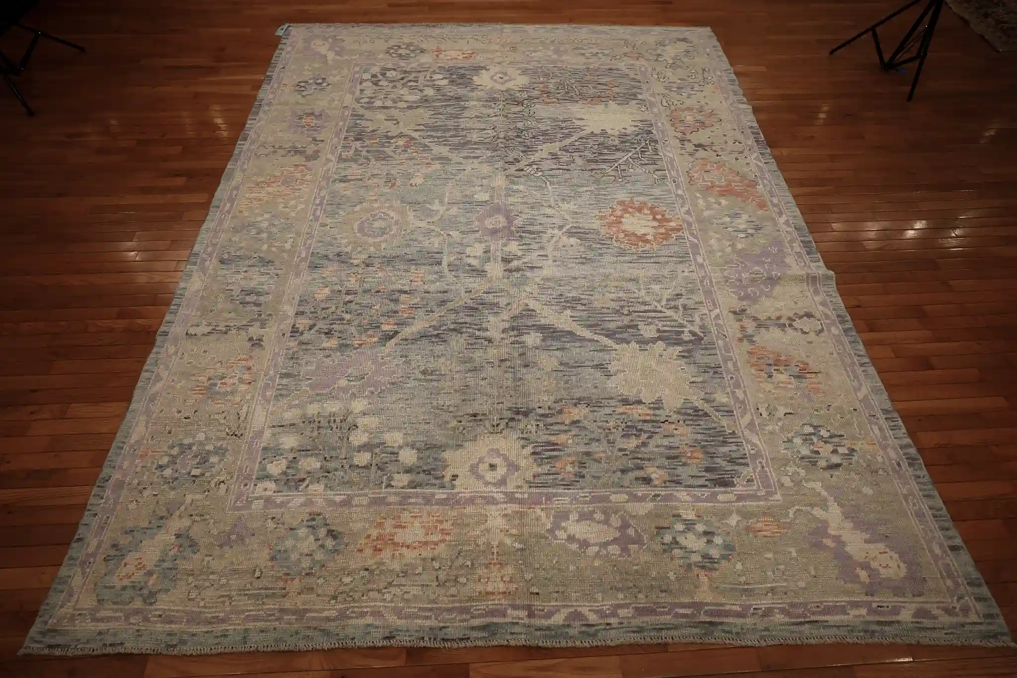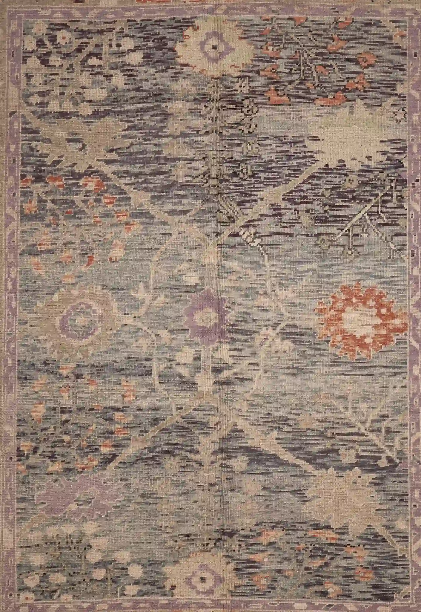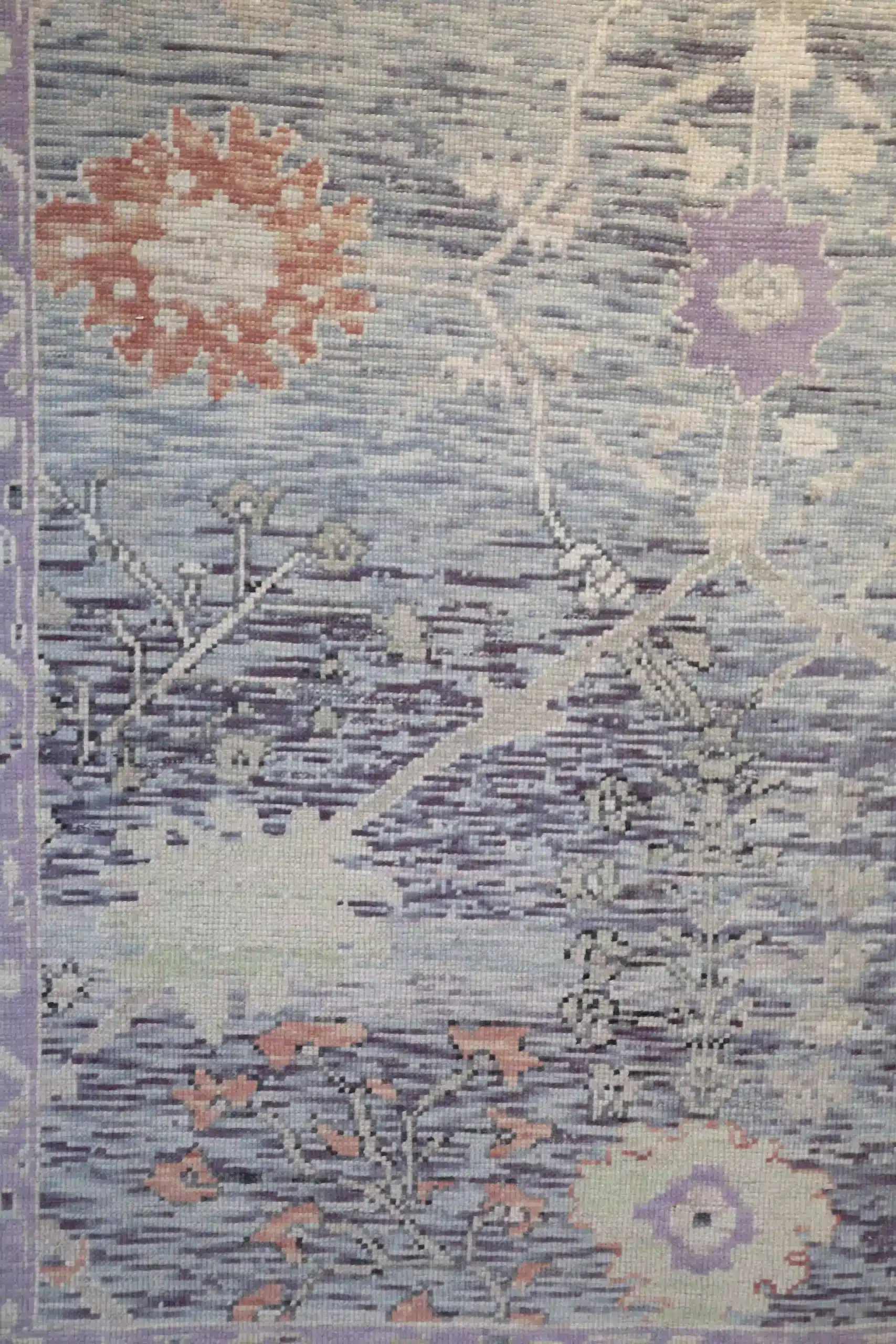 This new Turkish Oushak rug features a gentle, open composition with large-scale floral elements. The main field shows scattered oversized blossoms, curving vines, and small medallions in soft lavender and rose tones that float across the pale blue-gray background, creating a calm and spacious feel. The wide borders include repeating stylized flowers and delicate geometric patterns that frame the design with quiet refinement.