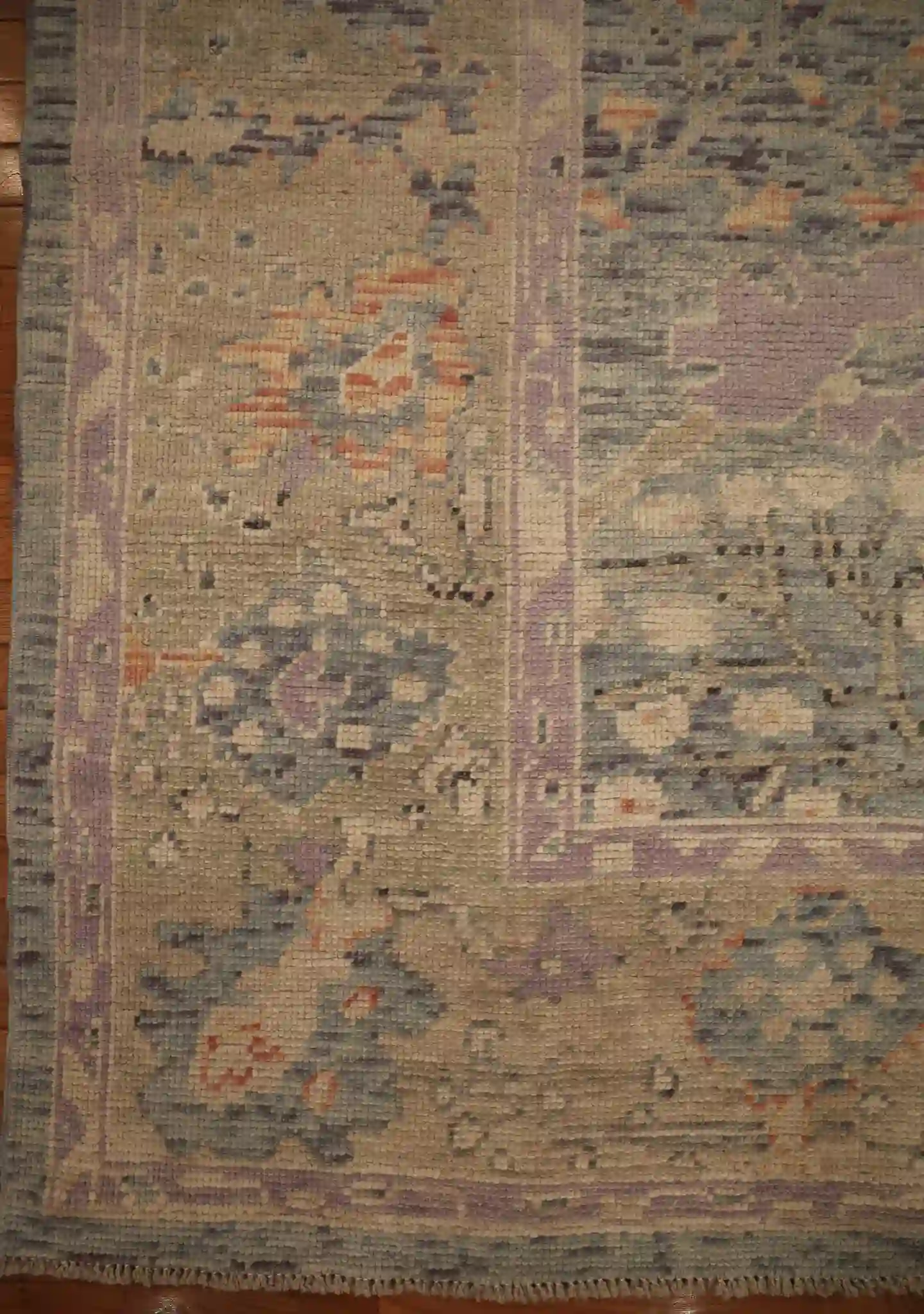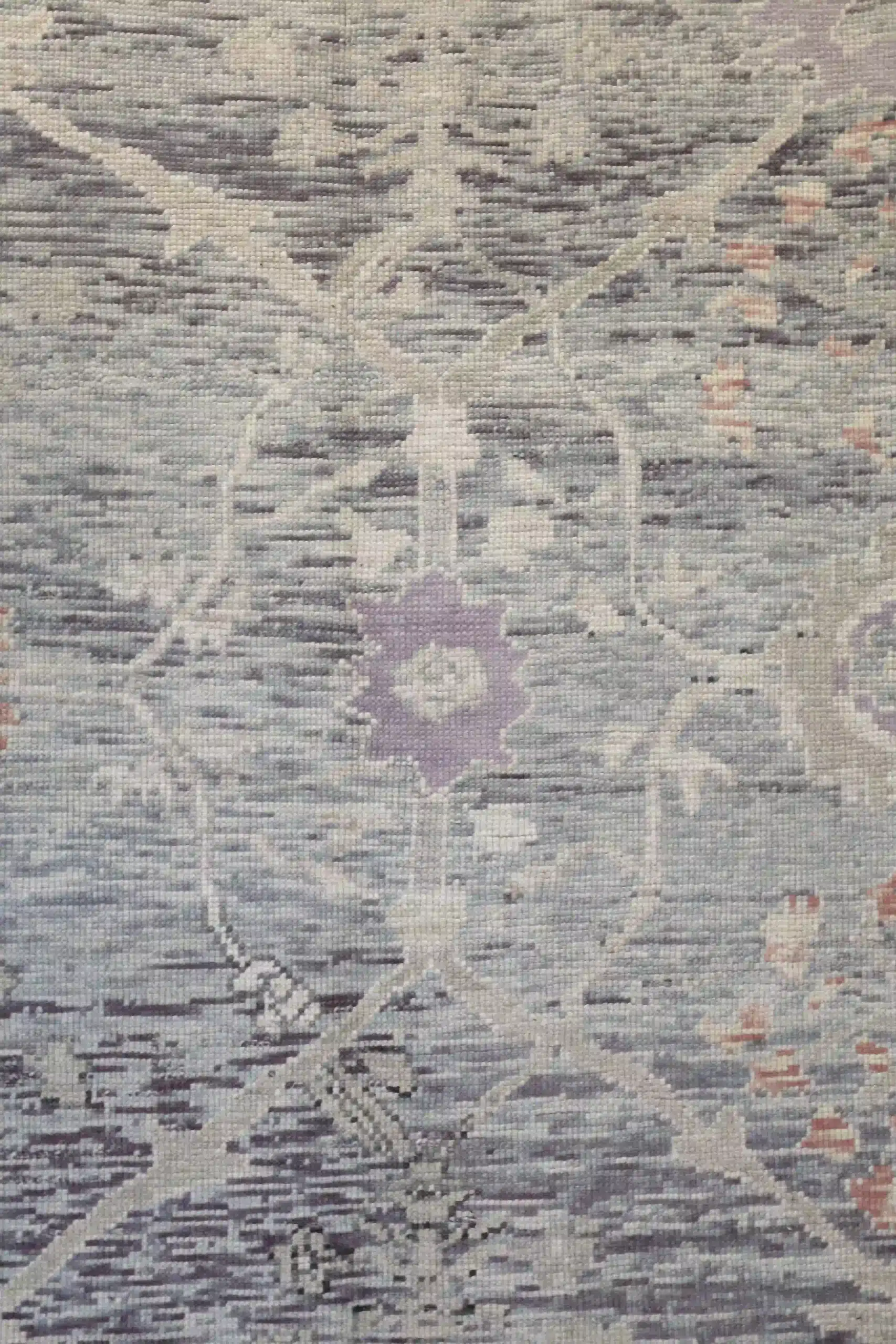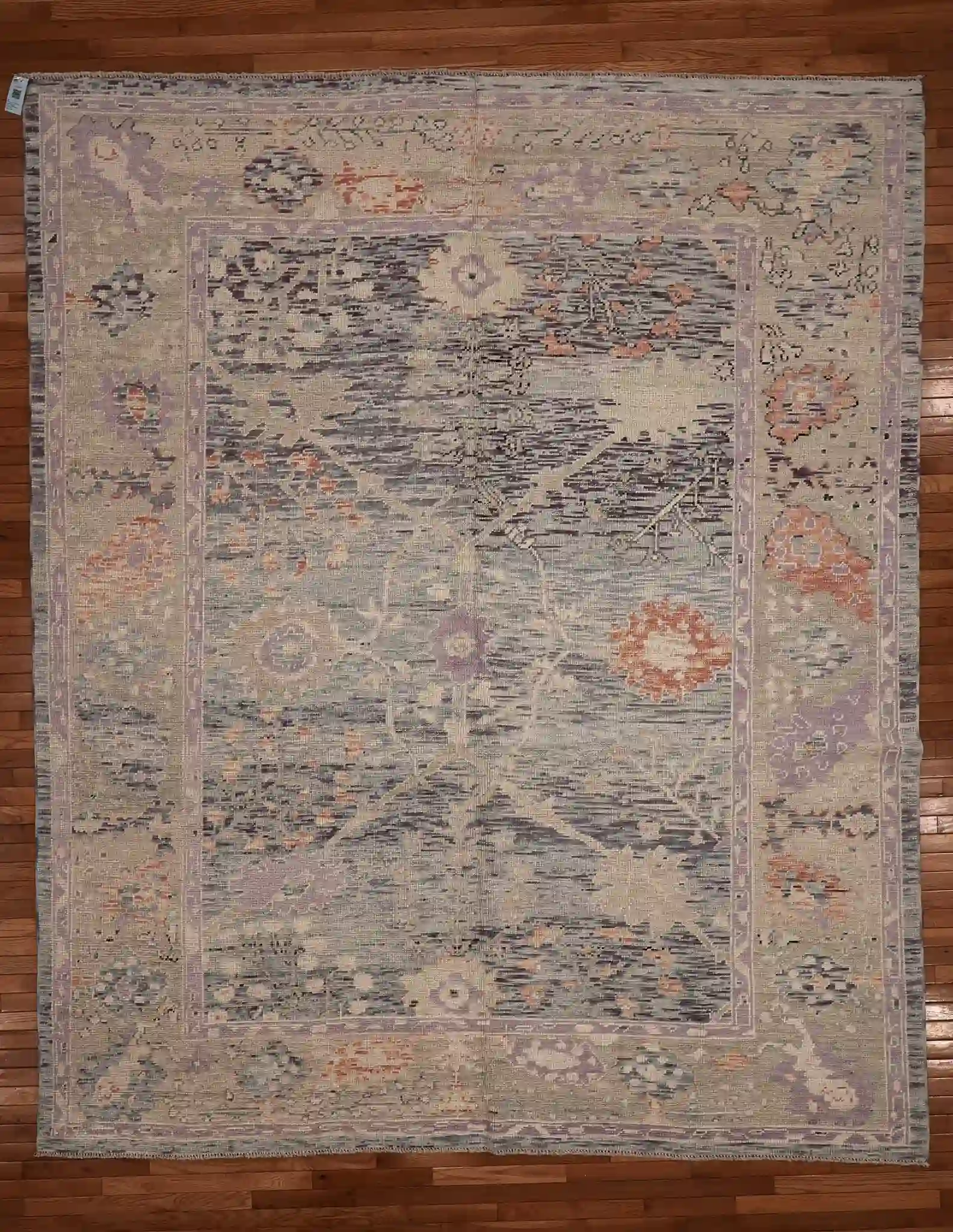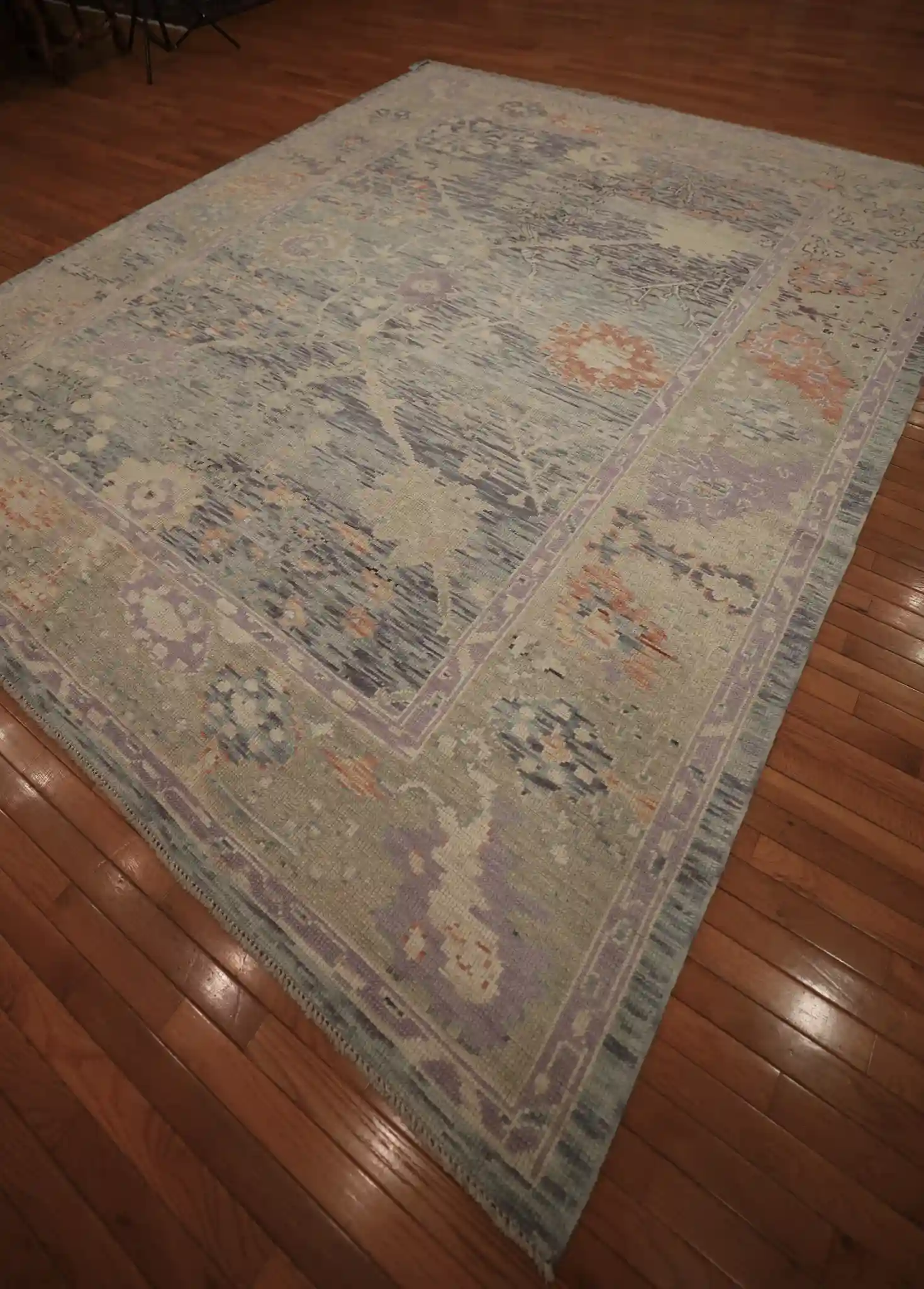 This new Turkish Oushak rug features a gentle, open composition with large-scale floral elements. The main field shows scattered oversized blossoms, curving vines, and small medallions in soft lavender and rose tones that float across the pale blue-gray background, creating a calm and spacious feel. The wide borders include repeating stylized flowers and delicate geometric patterns that frame the design with quiet refinement.