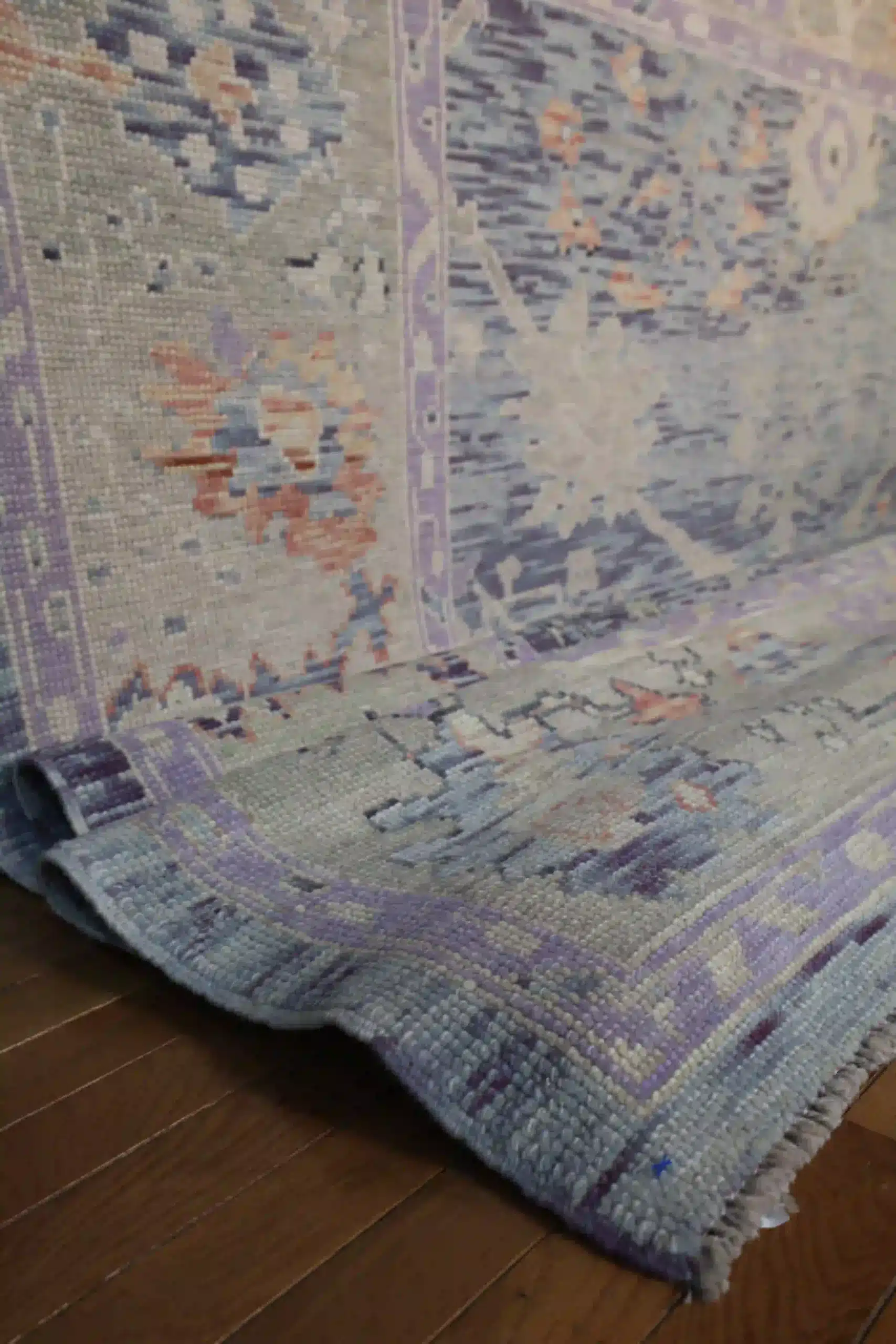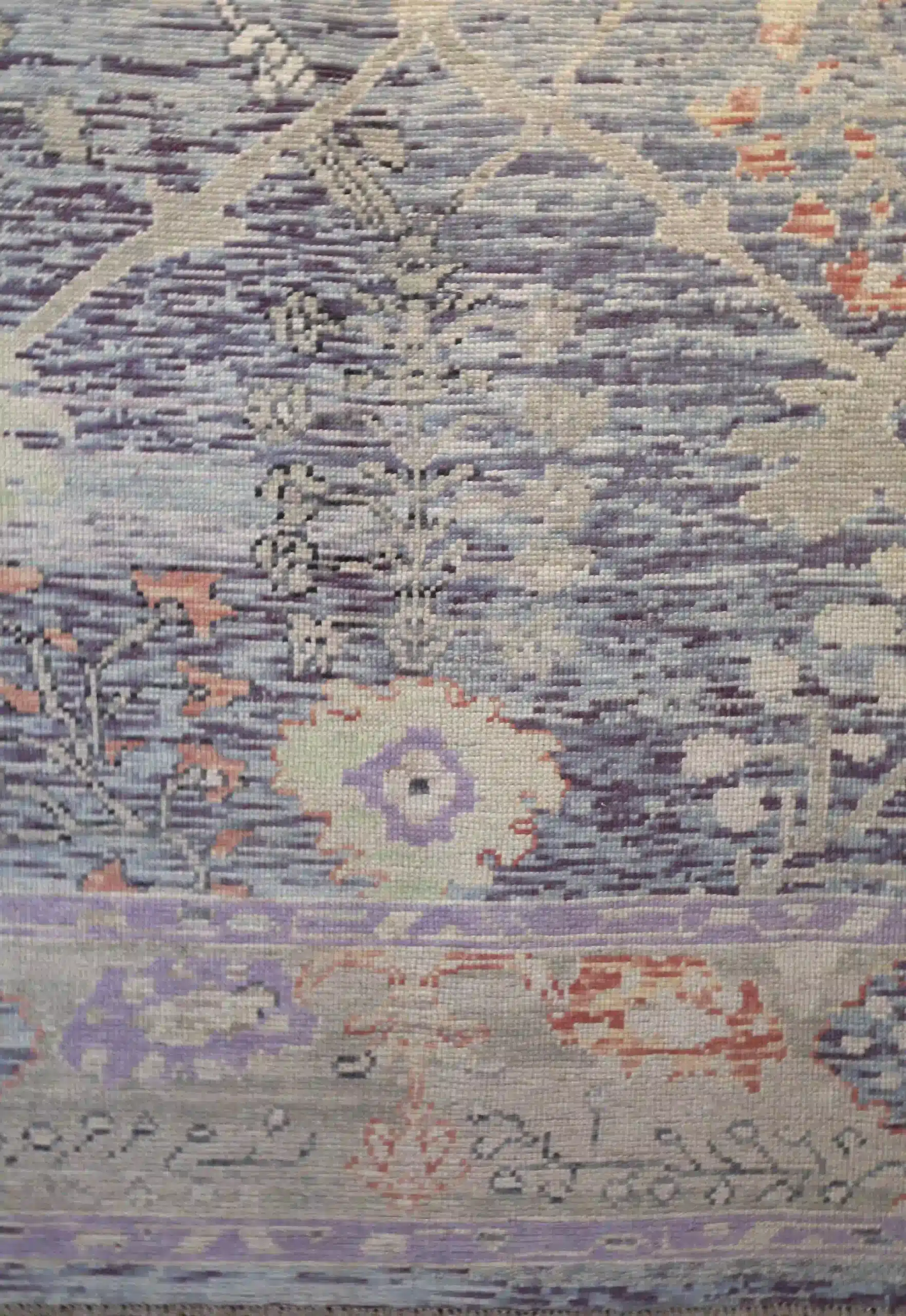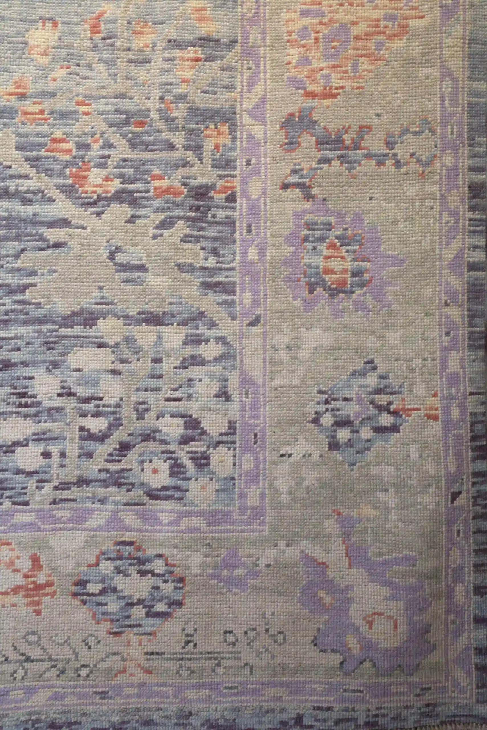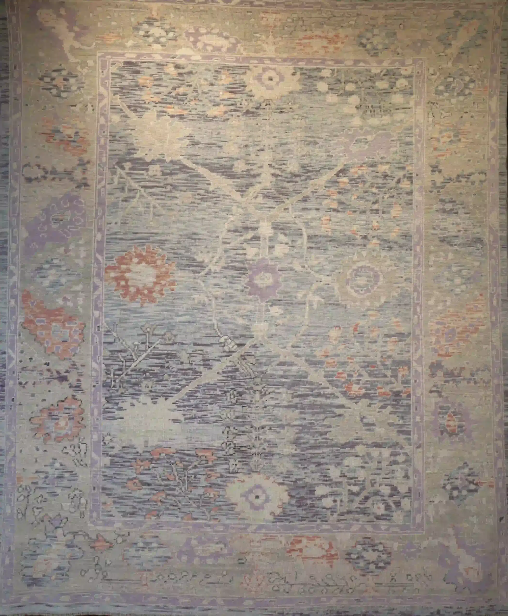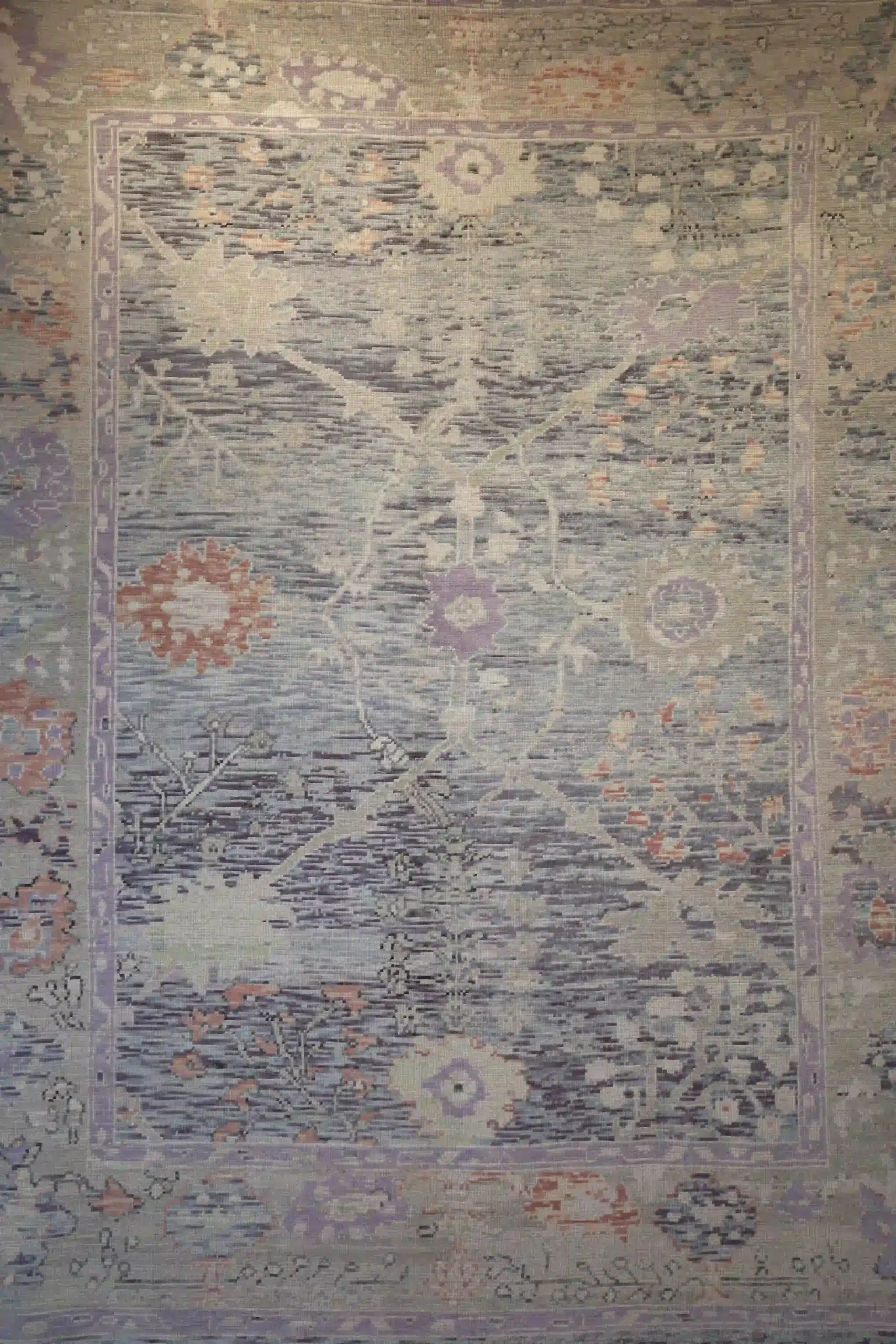 This new Turkish Oushak rug displays large soft blossoms and vines in lavender and rose on a gentle pale blue-gray field, with refined framing borders. At roughly 9×11, it brings serene elegance to any room. See the long description for more details.