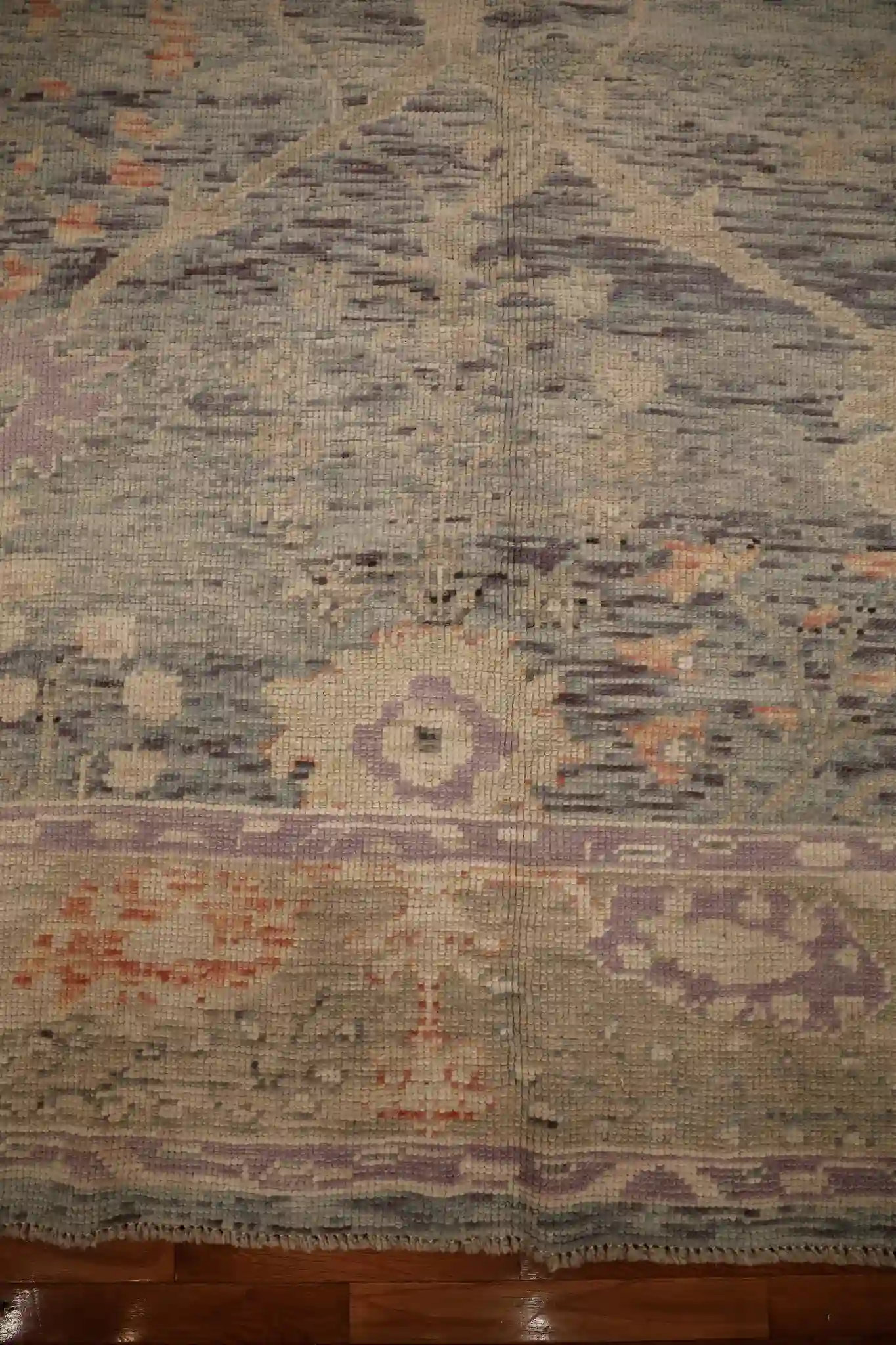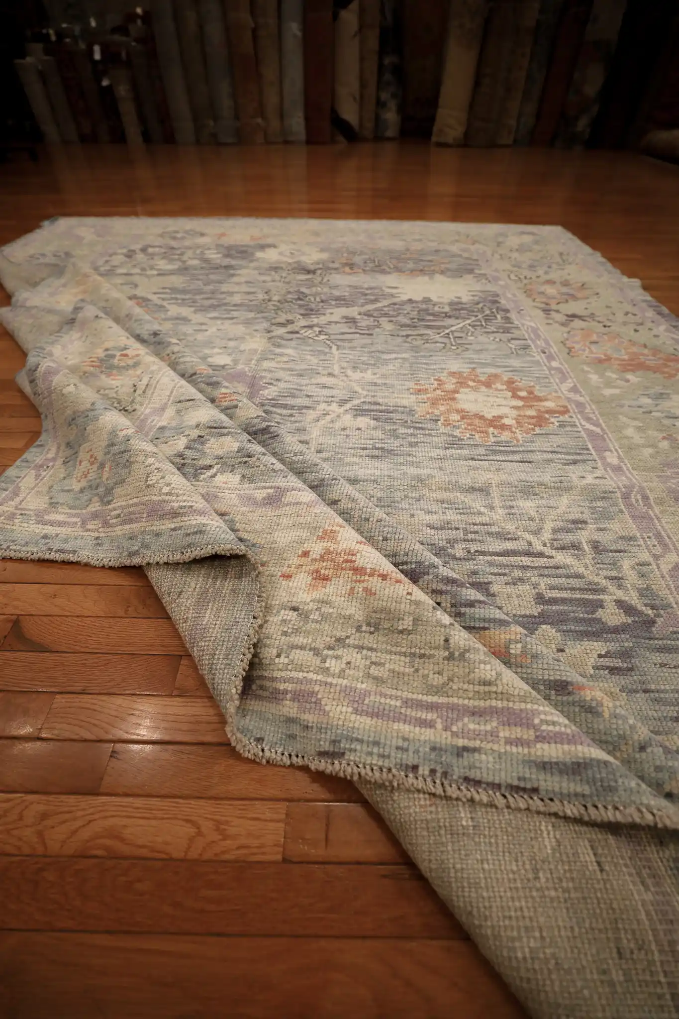 Oushak rugs trace their history to 16th-century Turkey, valued for their elegant scale and light color harmony in grand homes. Today’s versions, like this one, are hand-knotted with fine wool and natural-inspired dyes, keeping the classic open layout but using softer, modern palettes. The medium pile and even knotting give it a plush texture with a slightly aged appearance.