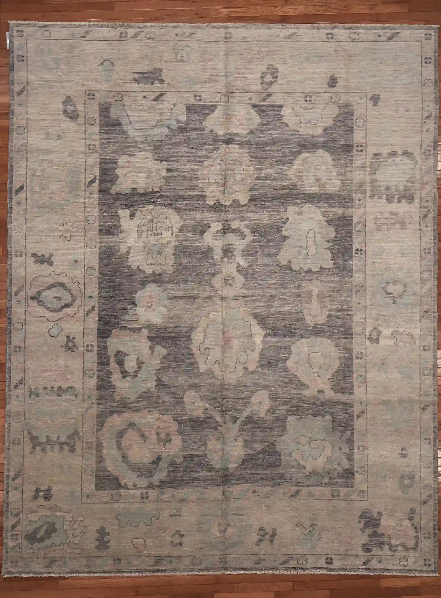 This new Turkish Oushak rug features a large central compartment with layered floral medallions and curving vines that branch outward, surrounded by an open field filled with smaller abstract blossoms and geometric shapes. The design uses gentle abrash effects to create subtle shading across the beige ground, while the wide border incorporates repeating cartouches, floral sprays, and small tribal motifs in cool blue-gray tones. The faded, washed look and balanced spacing give it a relaxed, timeless presence.
