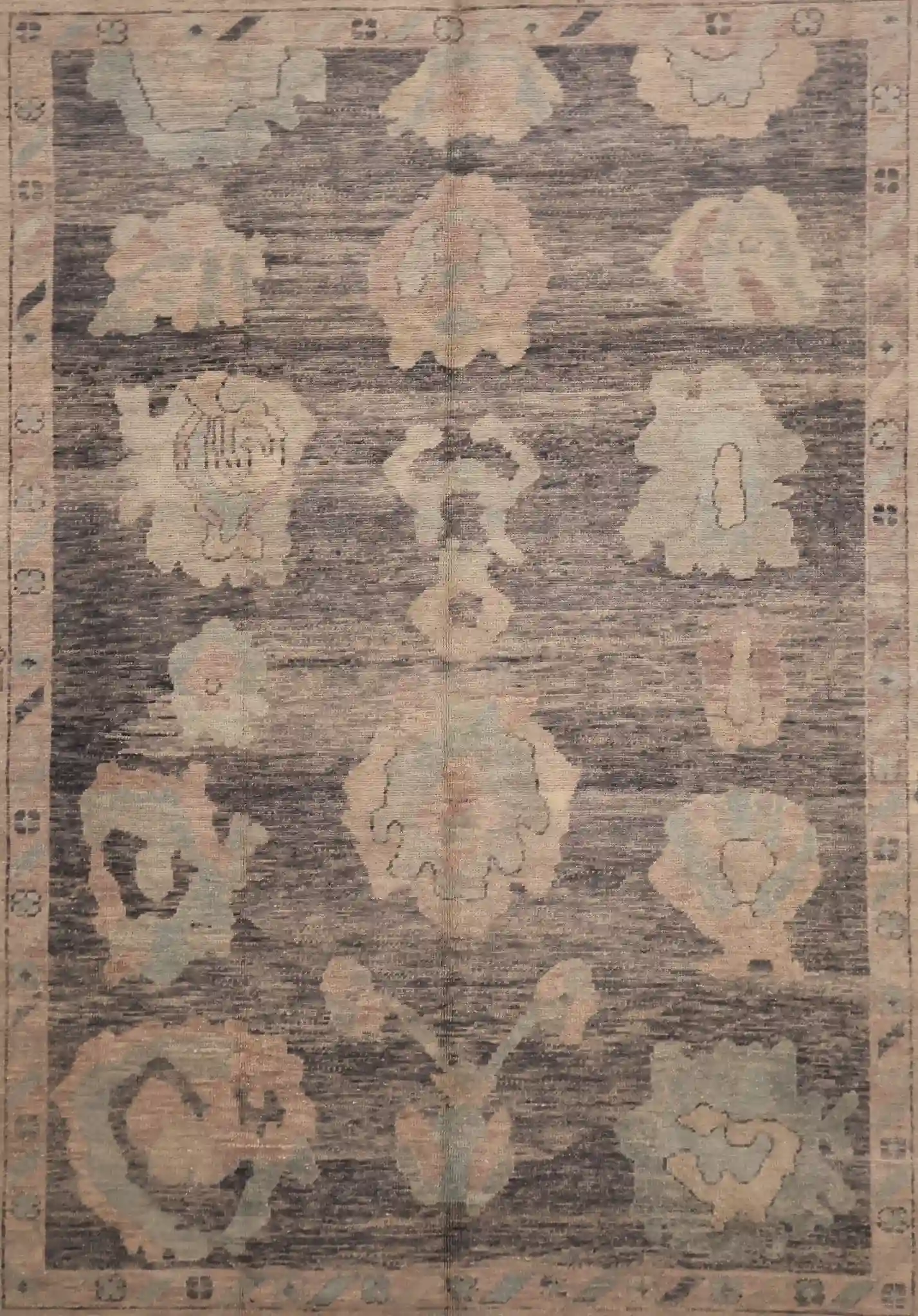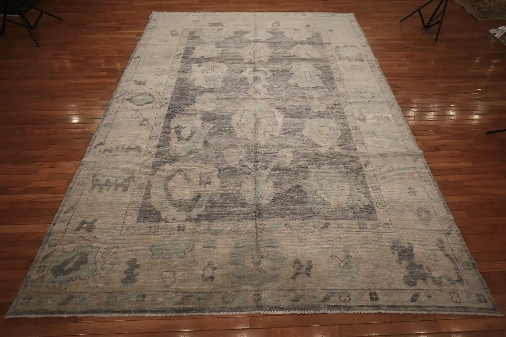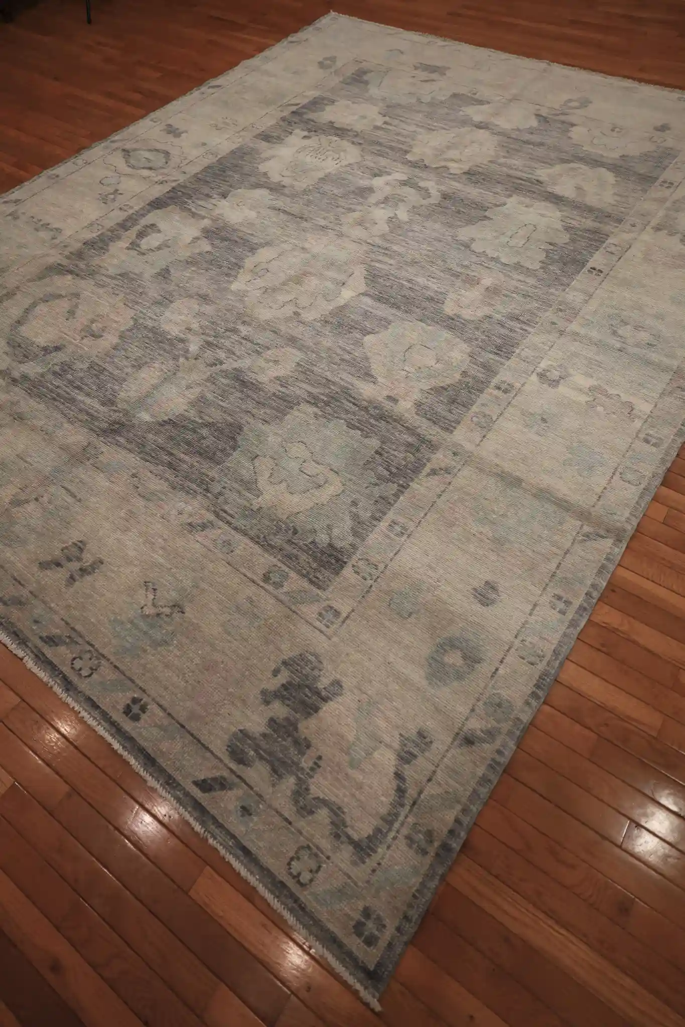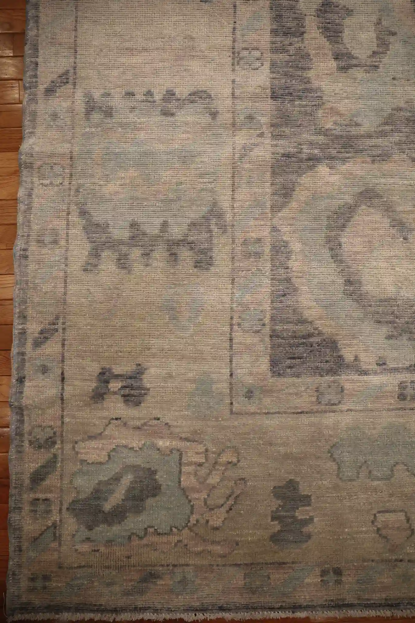Turkish Oushak rugs are known for their generous scale and soft, desaturated colors that reflect centuries of Anatolian weaving practices. Modern hand-knotted versions like this one employ quality wool to produce a plush yet sturdy pile, with intentional color variations that mimic the natural aging of antique pieces. The open layout keeps the pattern airy and prevents it from feeling heavy in larger rooms.