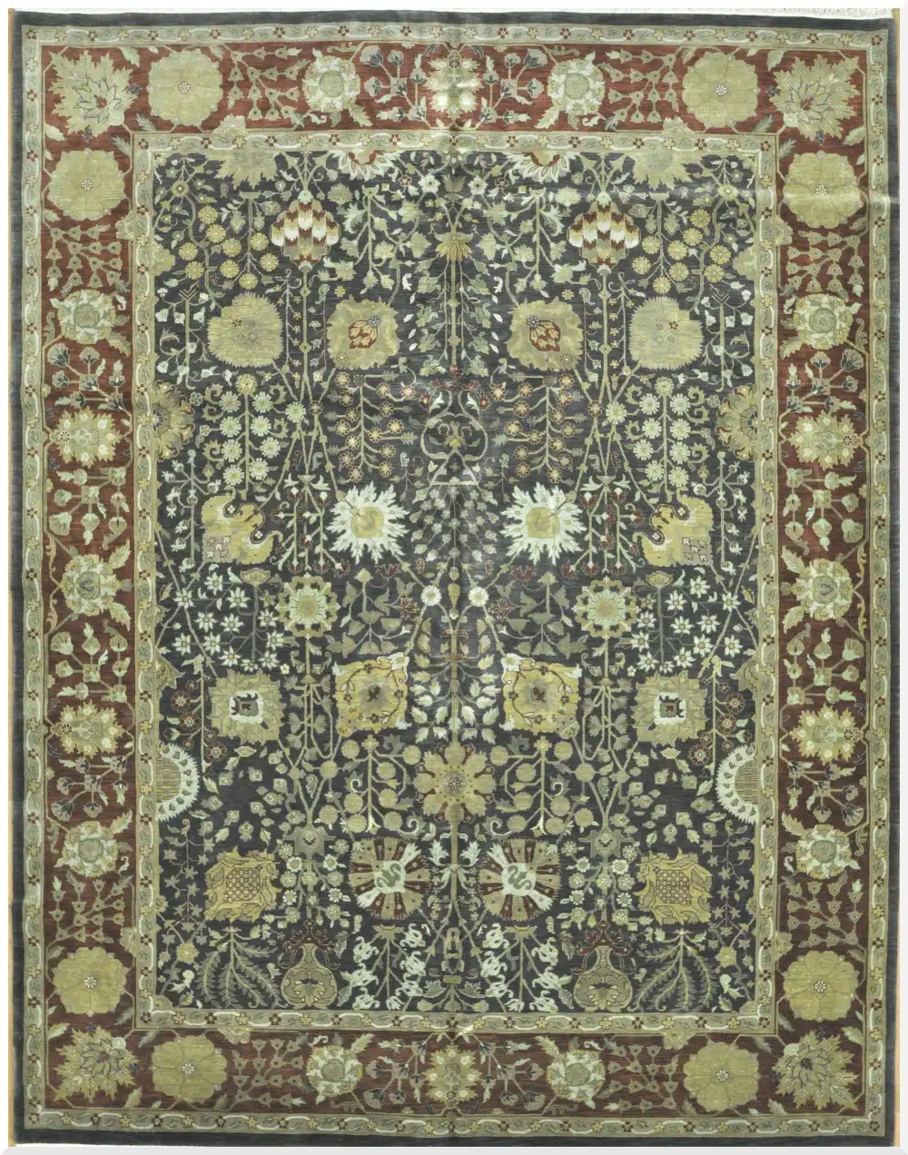 This finely hand-knotted oriental rug from India features a classic all-over floral design inspired by traditional Persian Tabriz patterns. The deep charcoal background creates a rich, dramatic foundation, beautifully contrasted by delicate ivory and soft gold floral motifs.