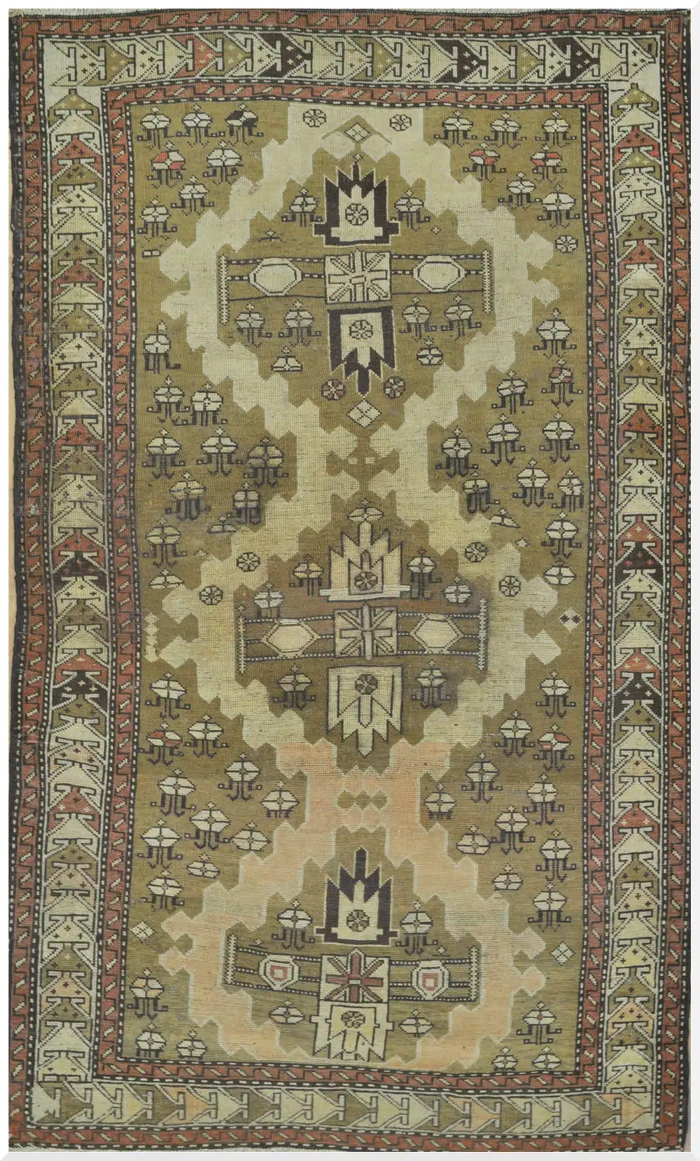 Kazak rugs from the 19th century are known for their bold, large-scale geometric designs and strong color contrasts, woven by nomadic or semi-nomadic weavers in the Caucasus mountains. These pieces often feature simple, powerful compositions using natural dyes, with ivory or beige grounds providing a softer backdrop to vivid reds and blues. This example shows the classic Kazak style with its vertical medallion arrangement and thick borders, reflecting the weaver’s tribal heritage and the rug’s age through gentle fading and authentic texture.