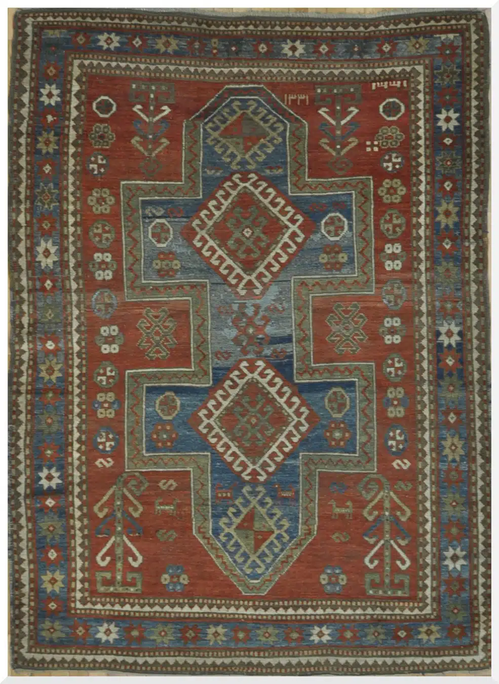 Kazak rugs from the late 19th and early 20th centuries are among the most prized Caucasian village weavings, known for their large-scale geometric patterns, strong colors, and thick wool pile. Produced in the mountainous regions of the Caucasus, these rugs were made for local use with bold, symmetrical designs that emphasize power and simplicity. This example from around 1900 exemplifies the classic Kazak style with its red field and blue medallion, highly valued for its authenticity and visual impact.